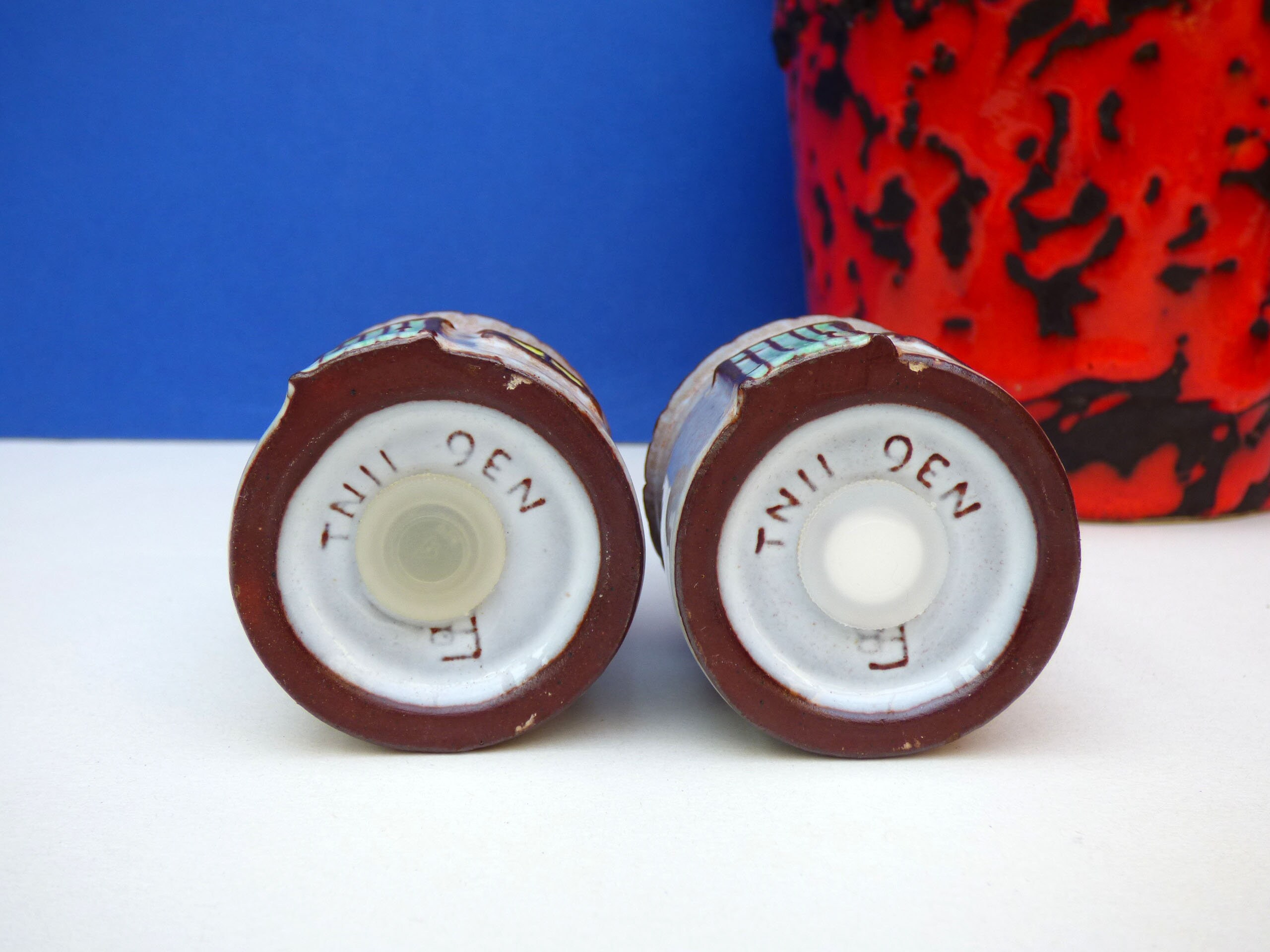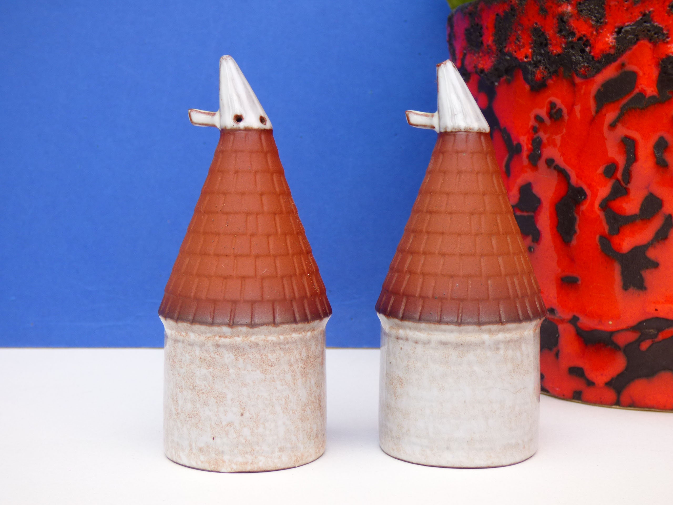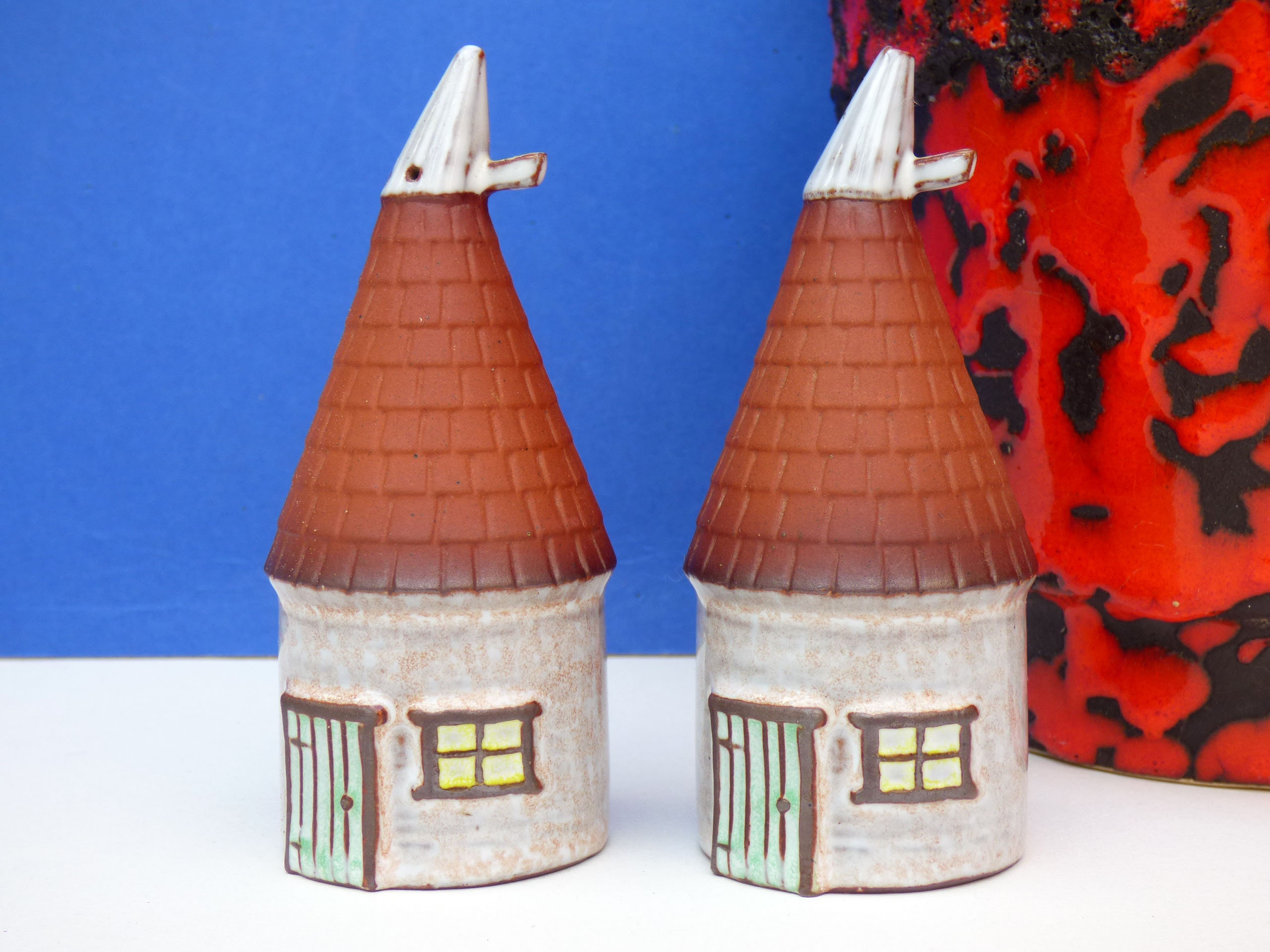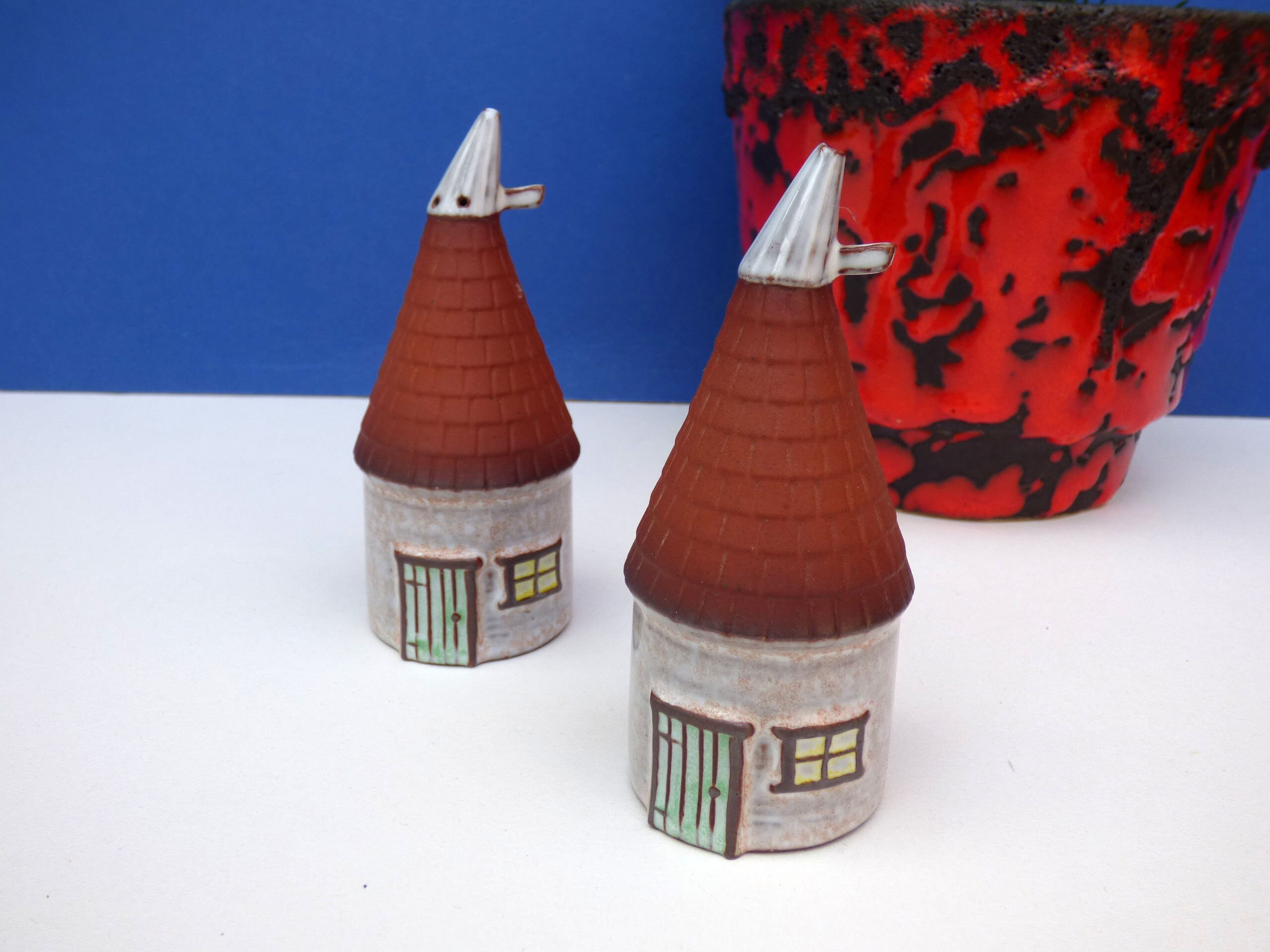Vintage French Ouse house salt and pepper pots, a simple shaped ceramic pot, in the form of a little French Ouse house, the salt.and pepper is dispensed from little holes in the top of the roof. Really cute, and sure to bring a smile to your kitchen and dinner table.