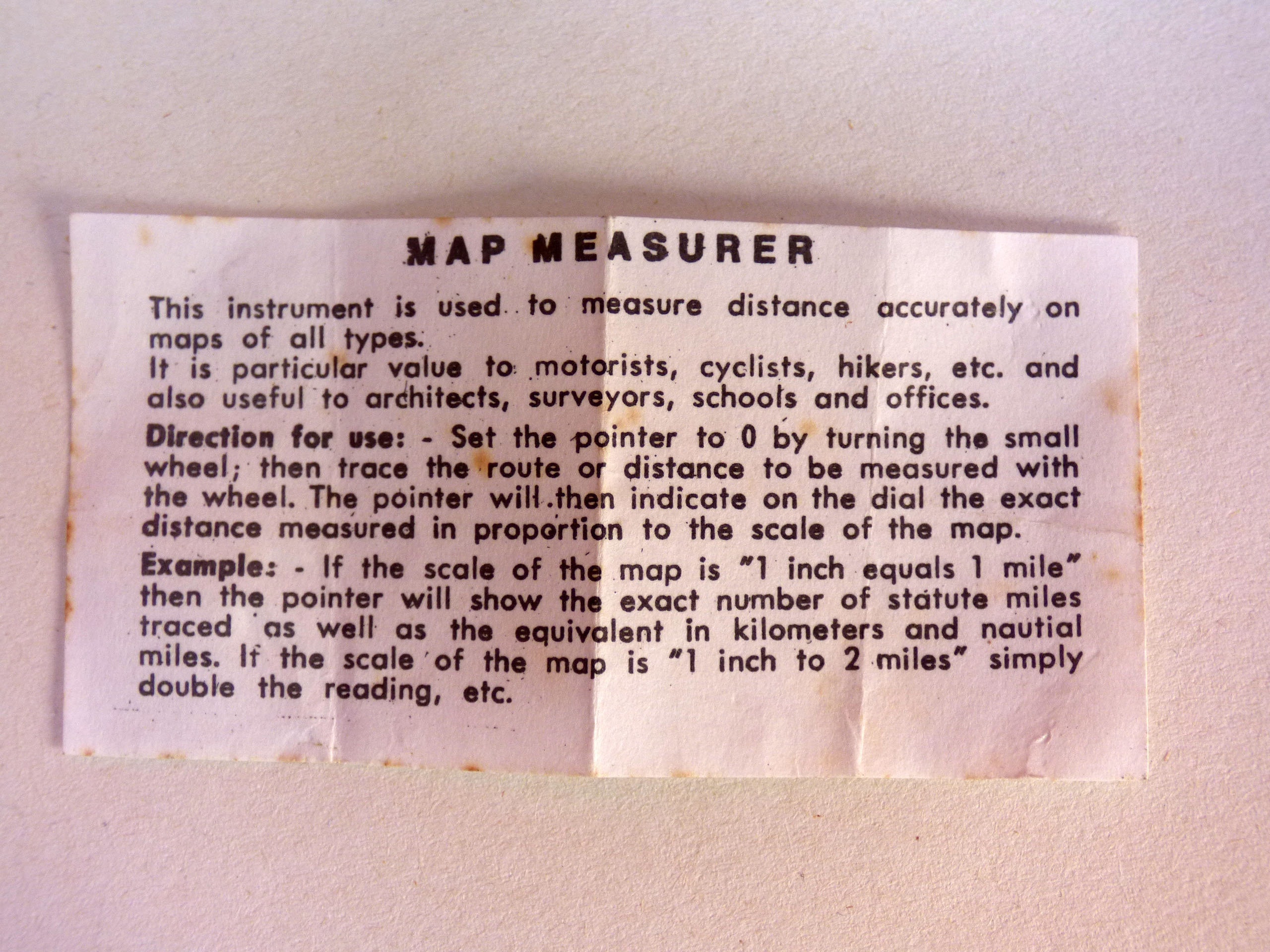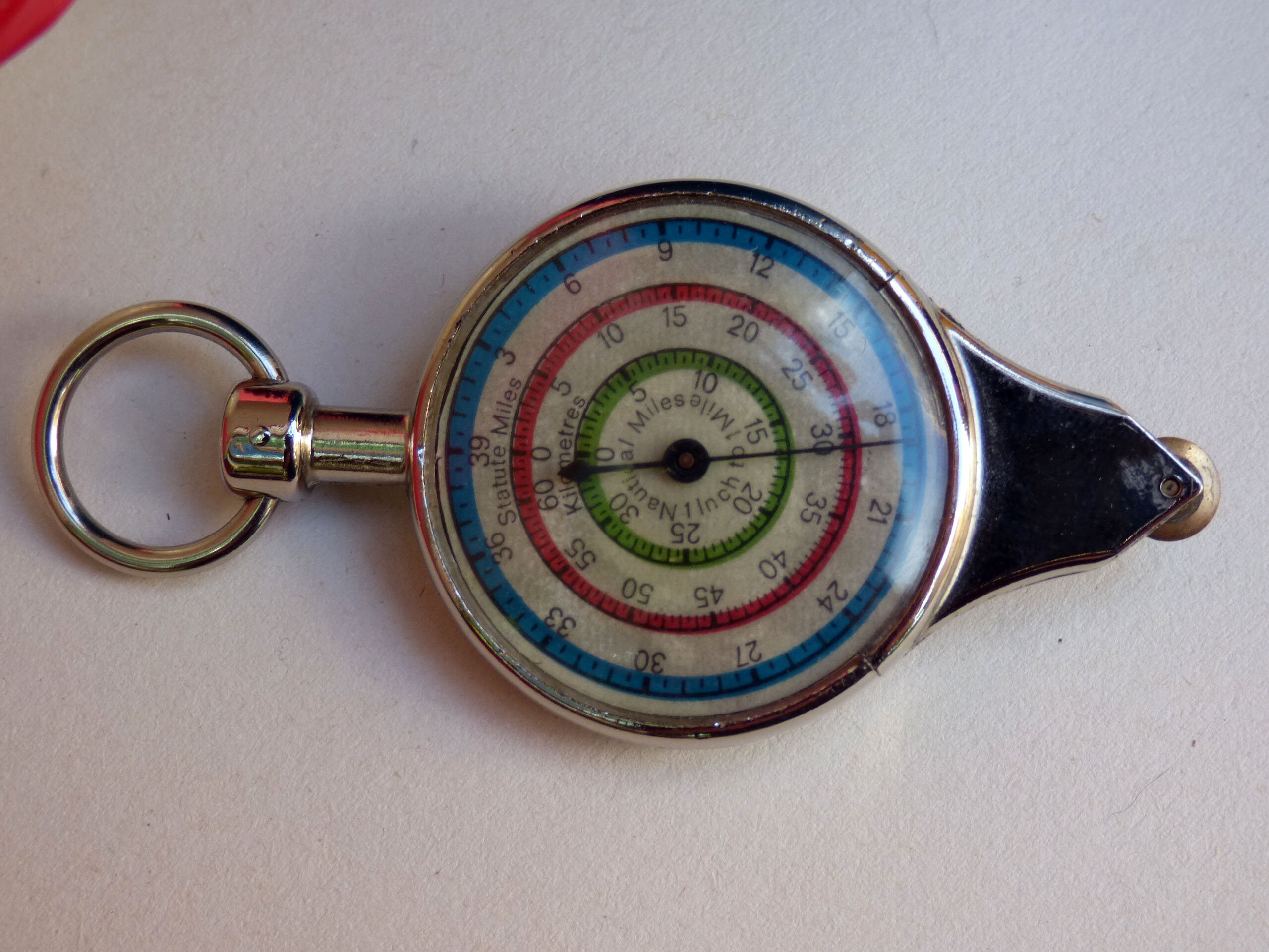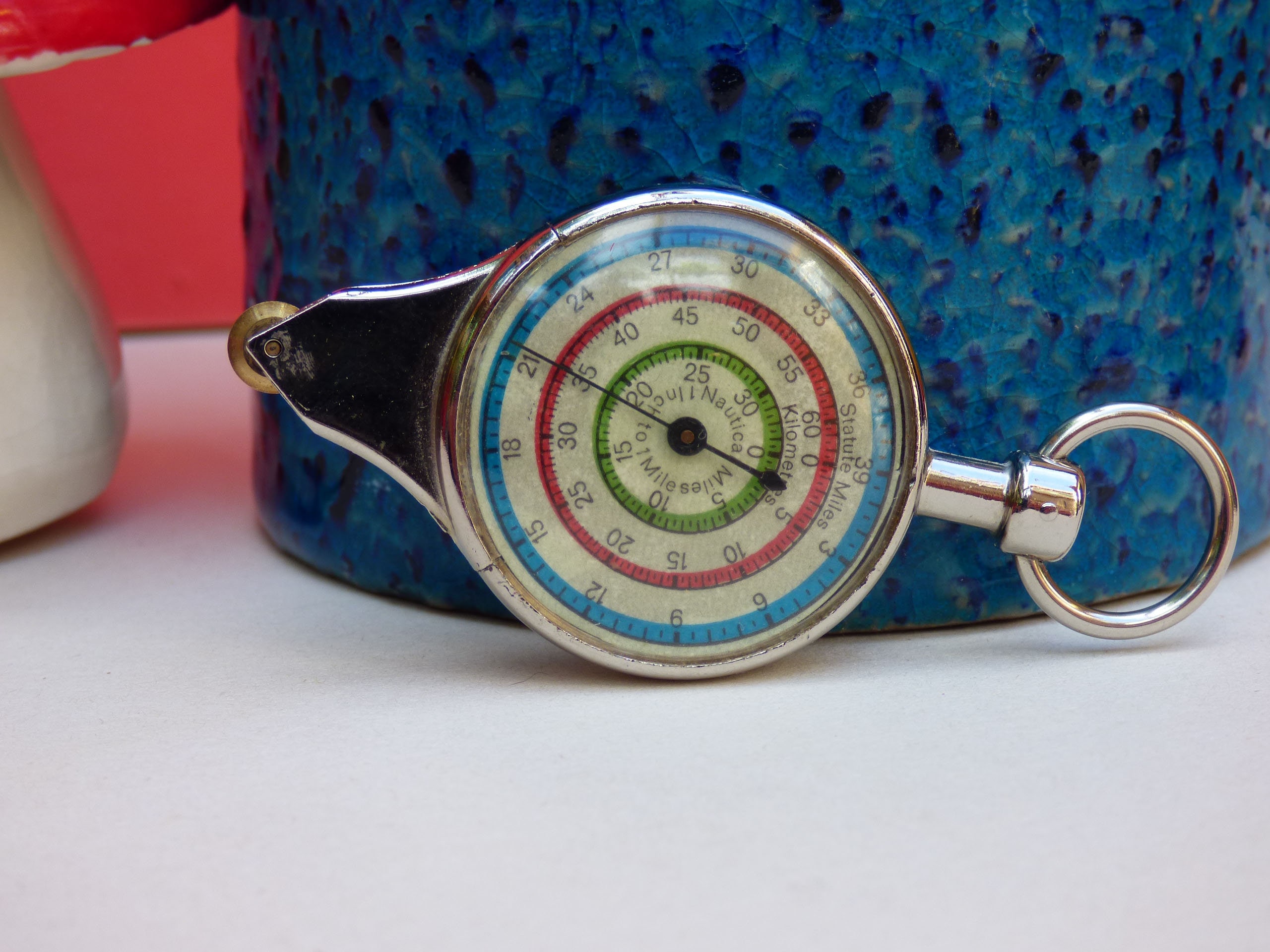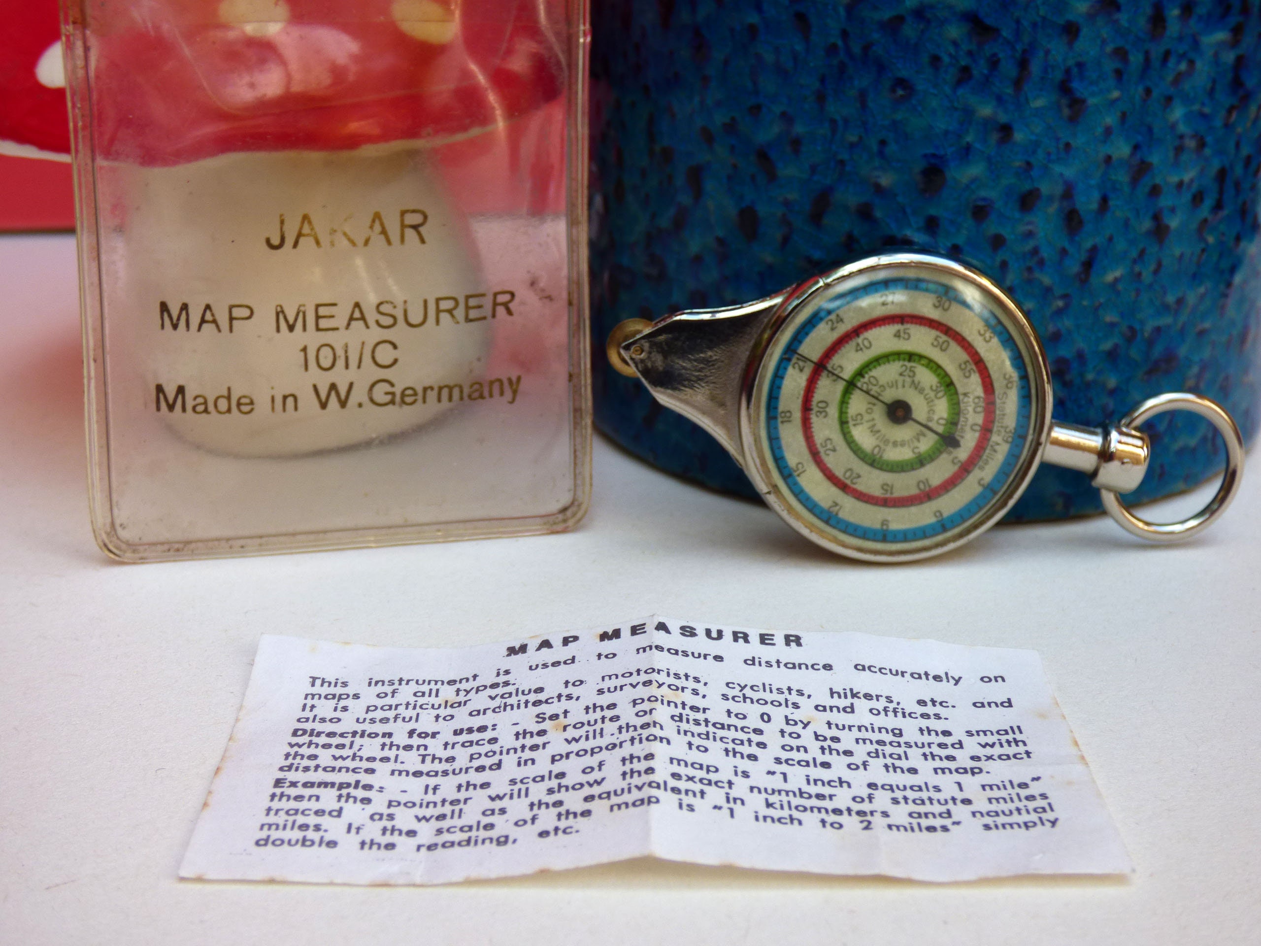 Explore the past with this vintage German opisometer map measure scale by JAKAR, a perfect tool for map enthusiasts, collectors, and lovers of vintage tools. This precision instrument, used to measure distances on maps, is double-sided, offering a versatile and functional design that reflects the craftsmanship of its time.