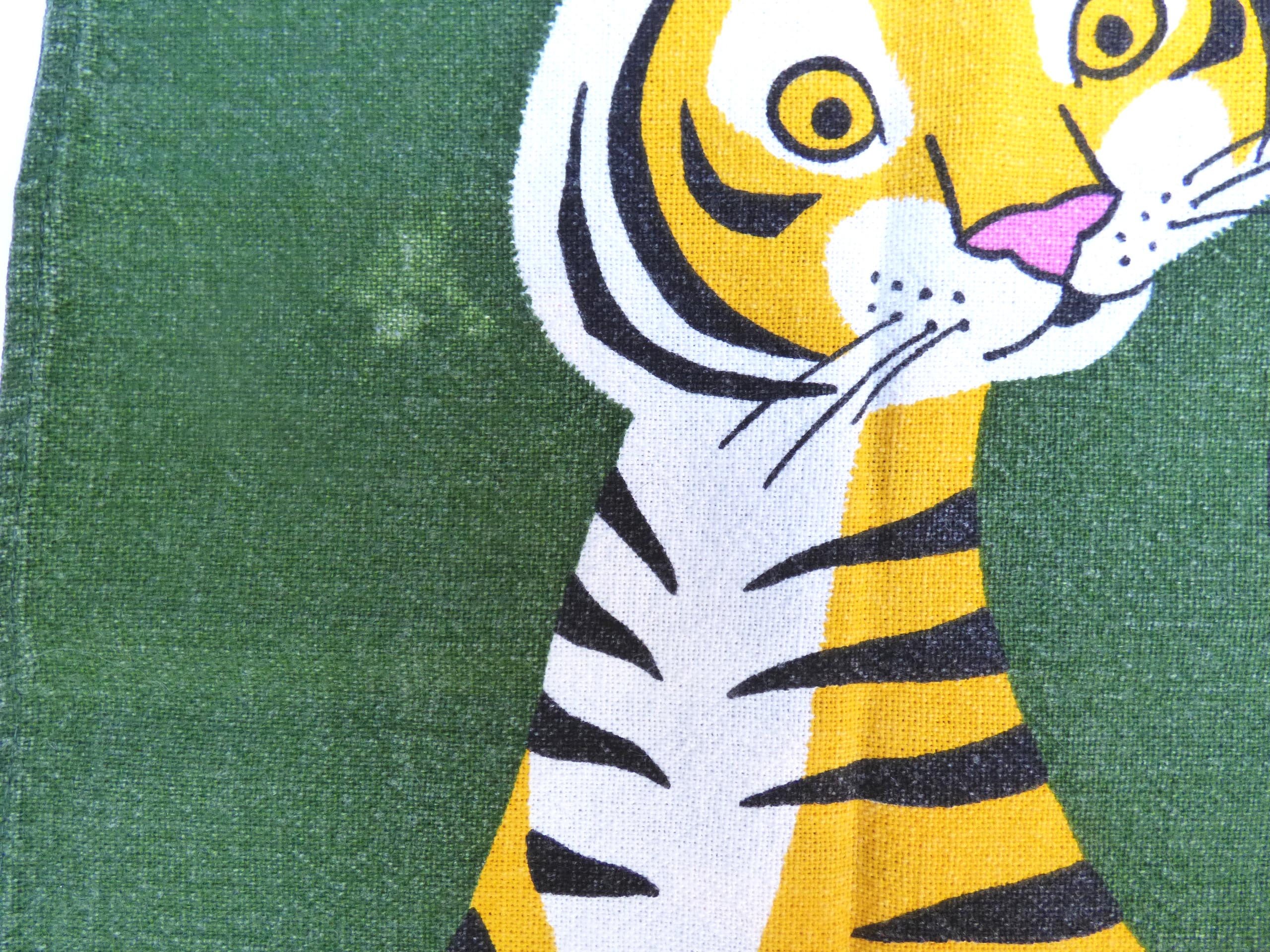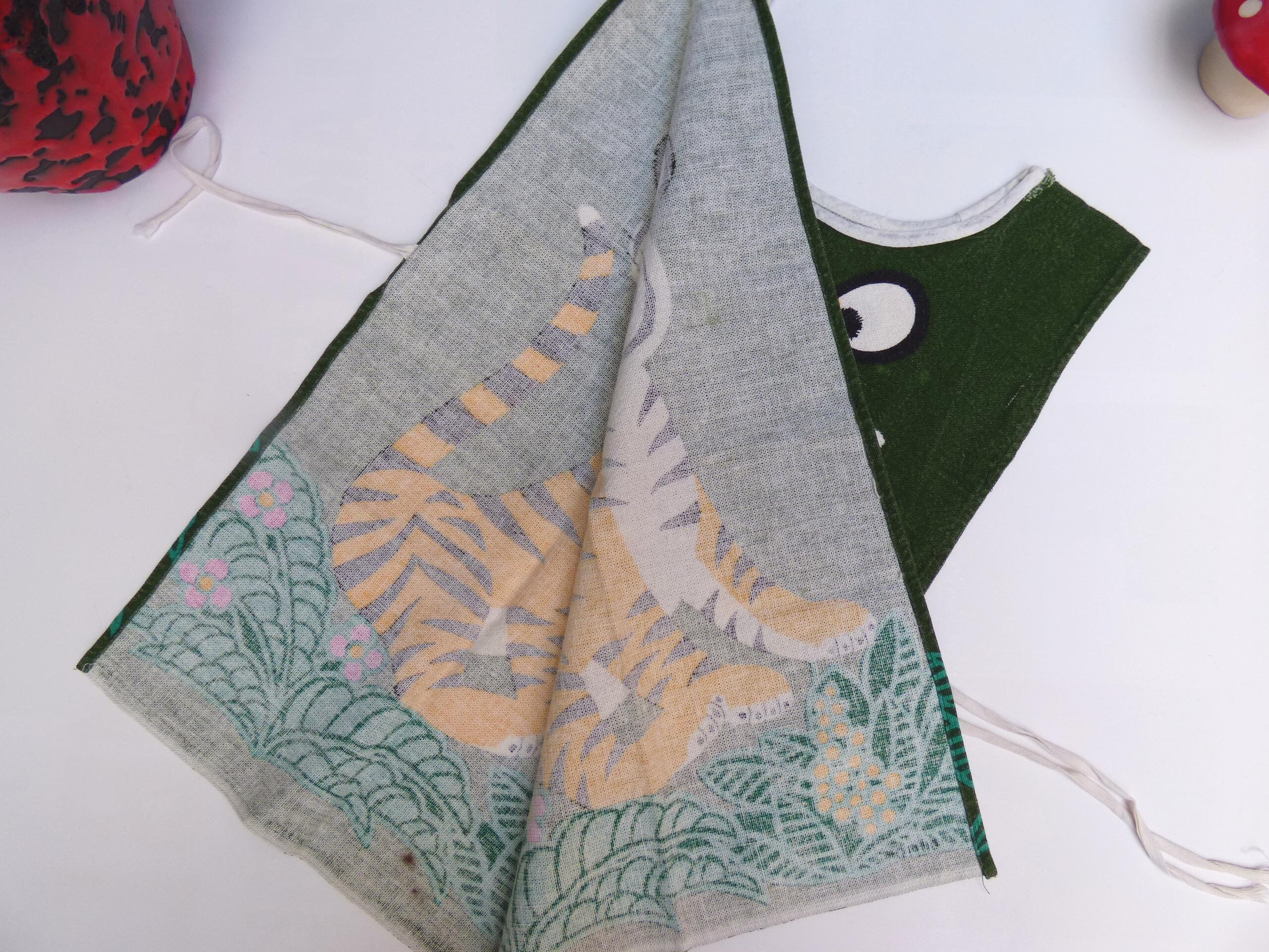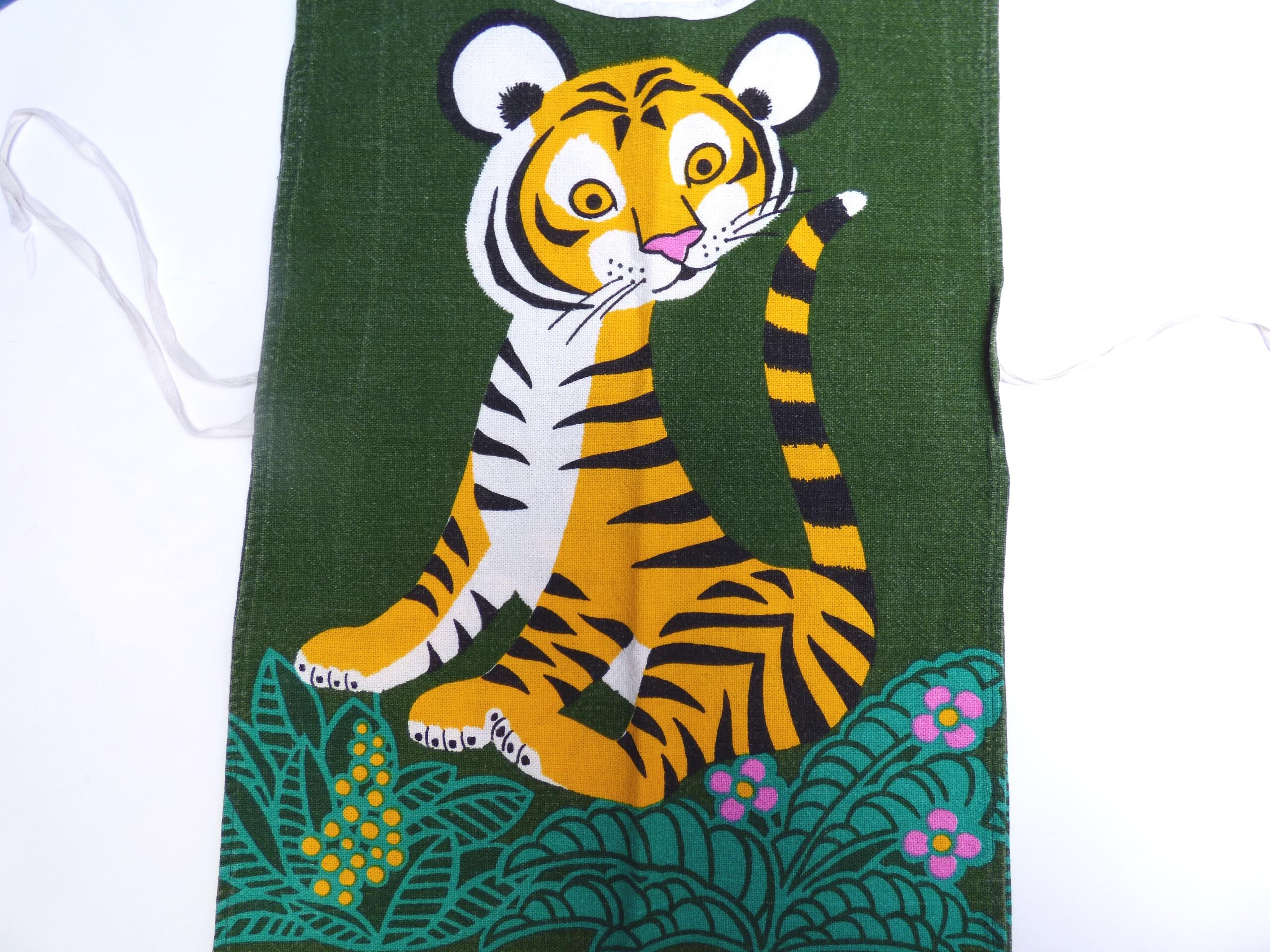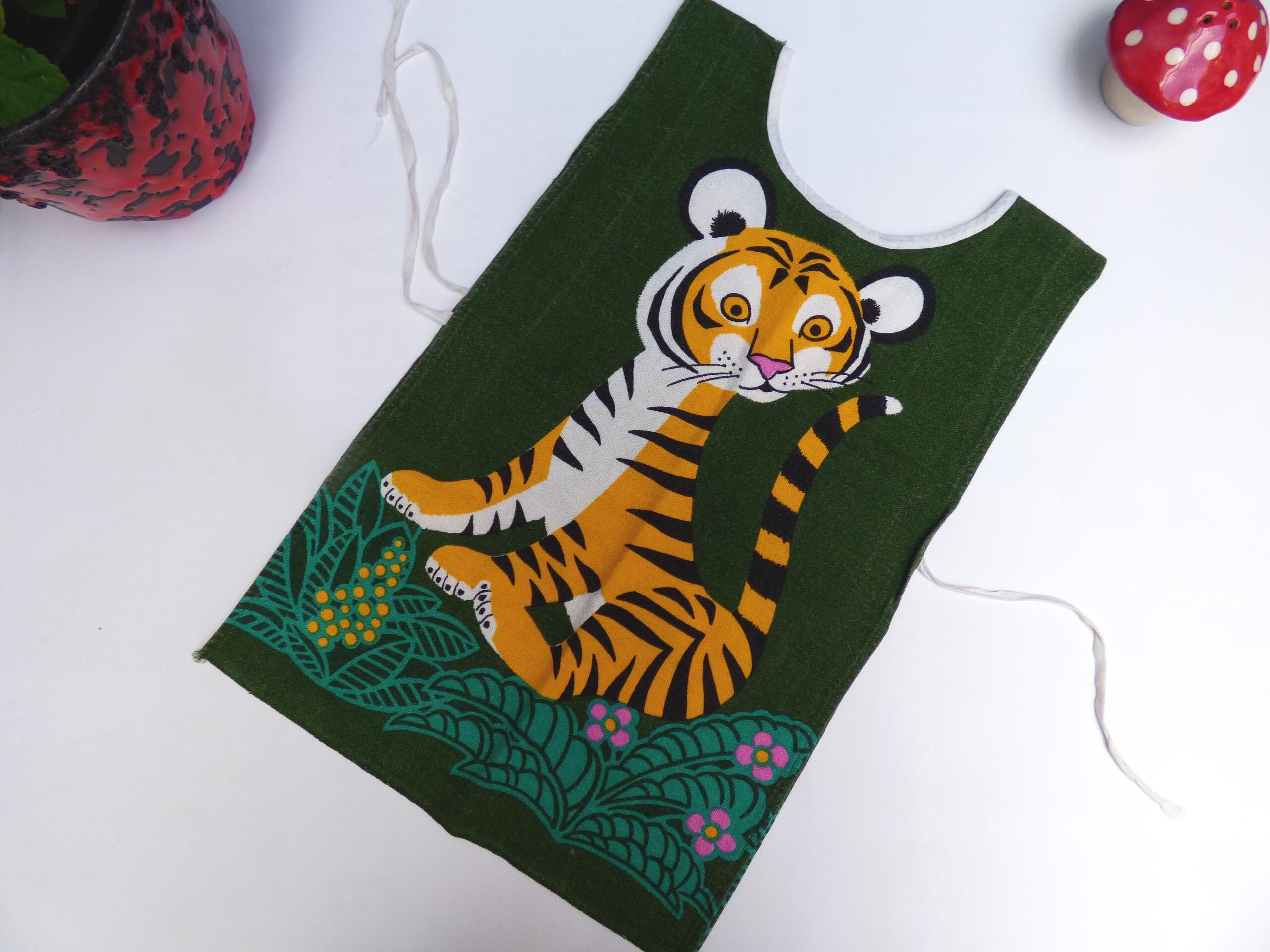 A wonderful vintage childrens tabard, featuring a wonderful illustration of a brightly coloured tiger sitting amongst the flowers. The illustration repeats on the back. The tabard is in good condition for its age, however, there are a couple of areas of wear, a slight mark, and one of the side ties is missing. which can be seen clearly in photos, so do check the photos for details. This item has been well looked after, and washed but does show signs of love and use.