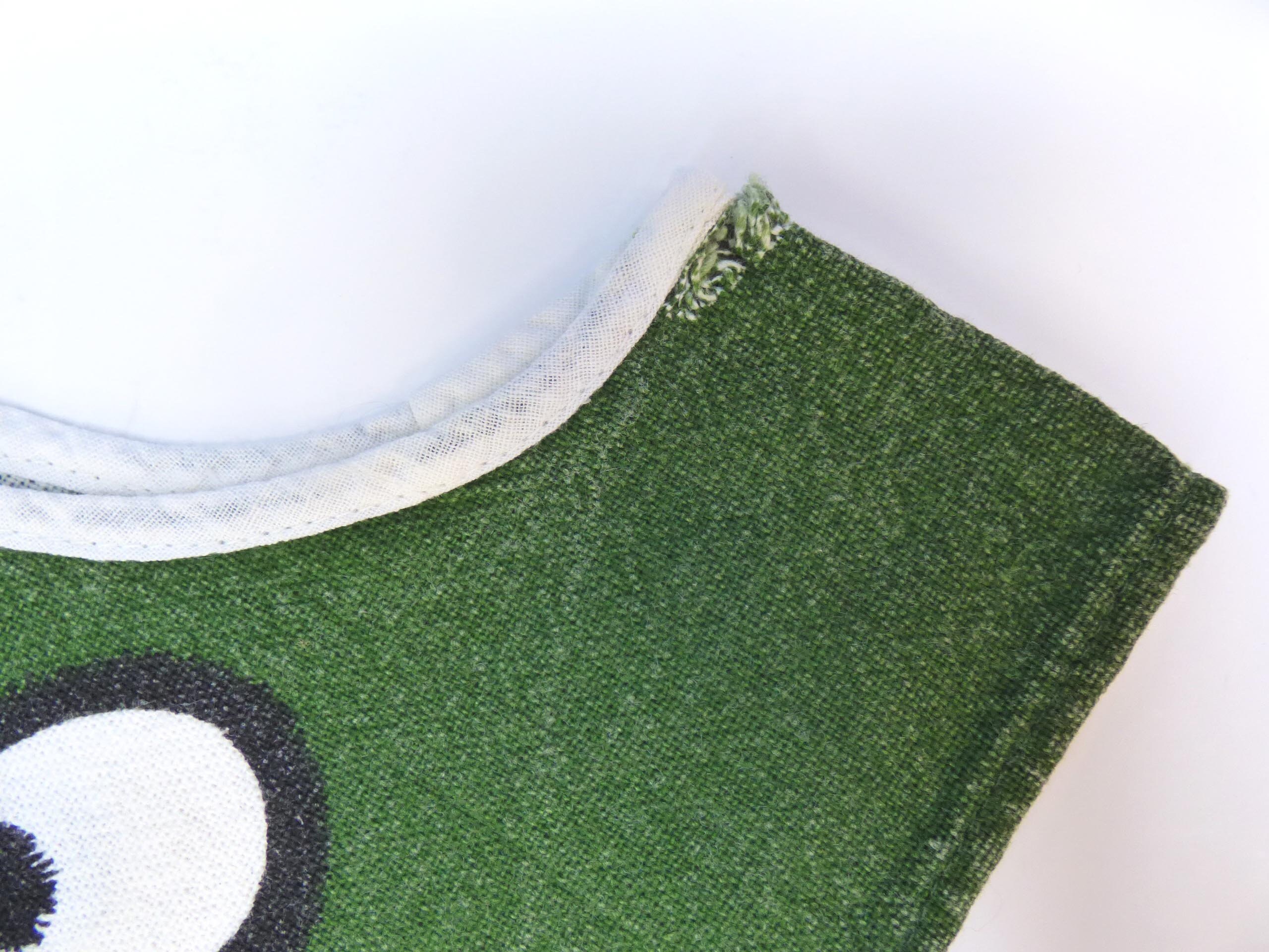 The apron measures 47 cm long and 31 cm wide at the base. The head whole is large enough that I can just fit my own head through, so this tabard will fit for many years to come. But it would probably suit a 2-6 year old best.