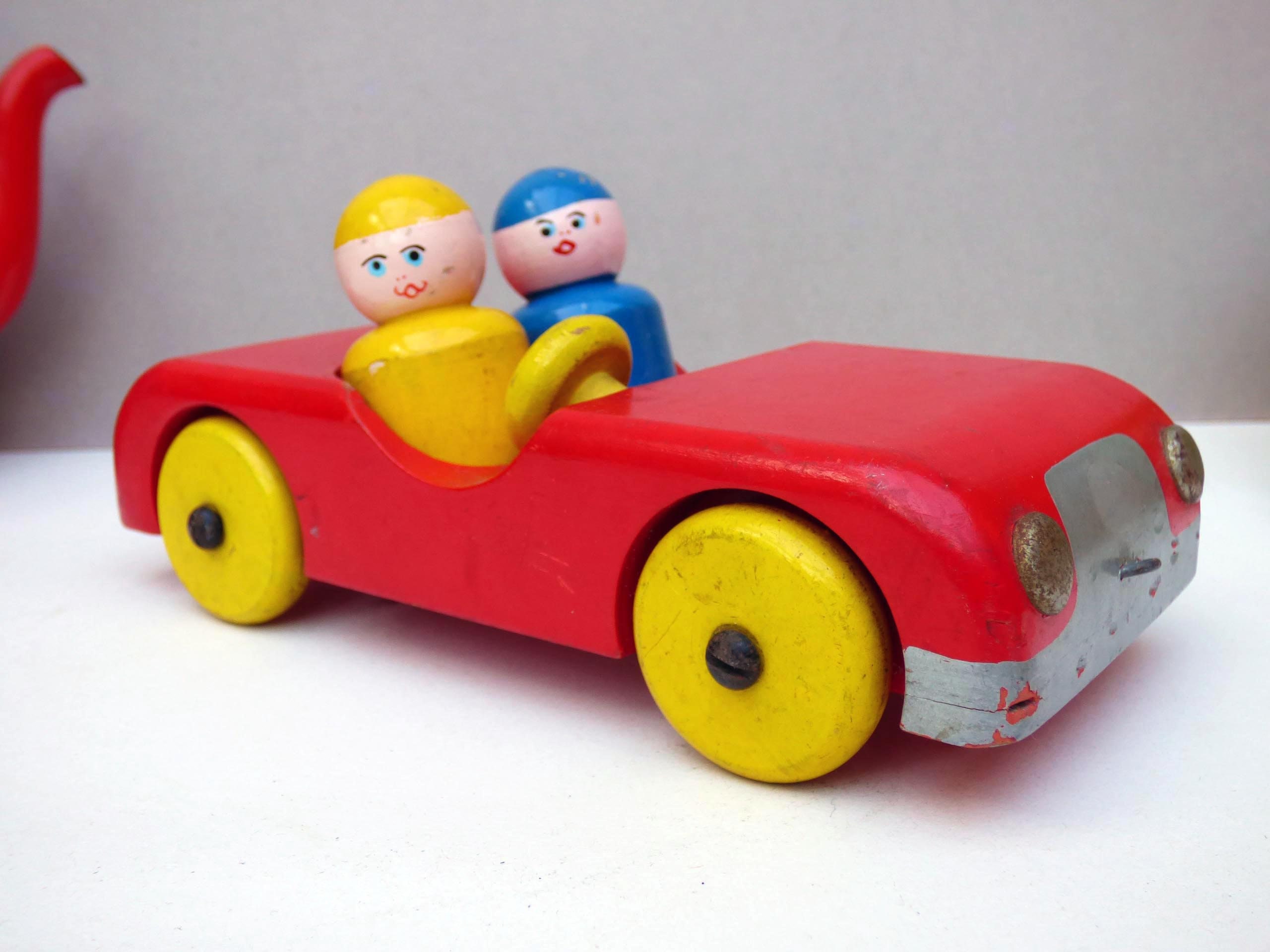 A lovely vintage wooden push along toy car complete with 2 drivers, created in the late 1950s by British toy maker Escor.