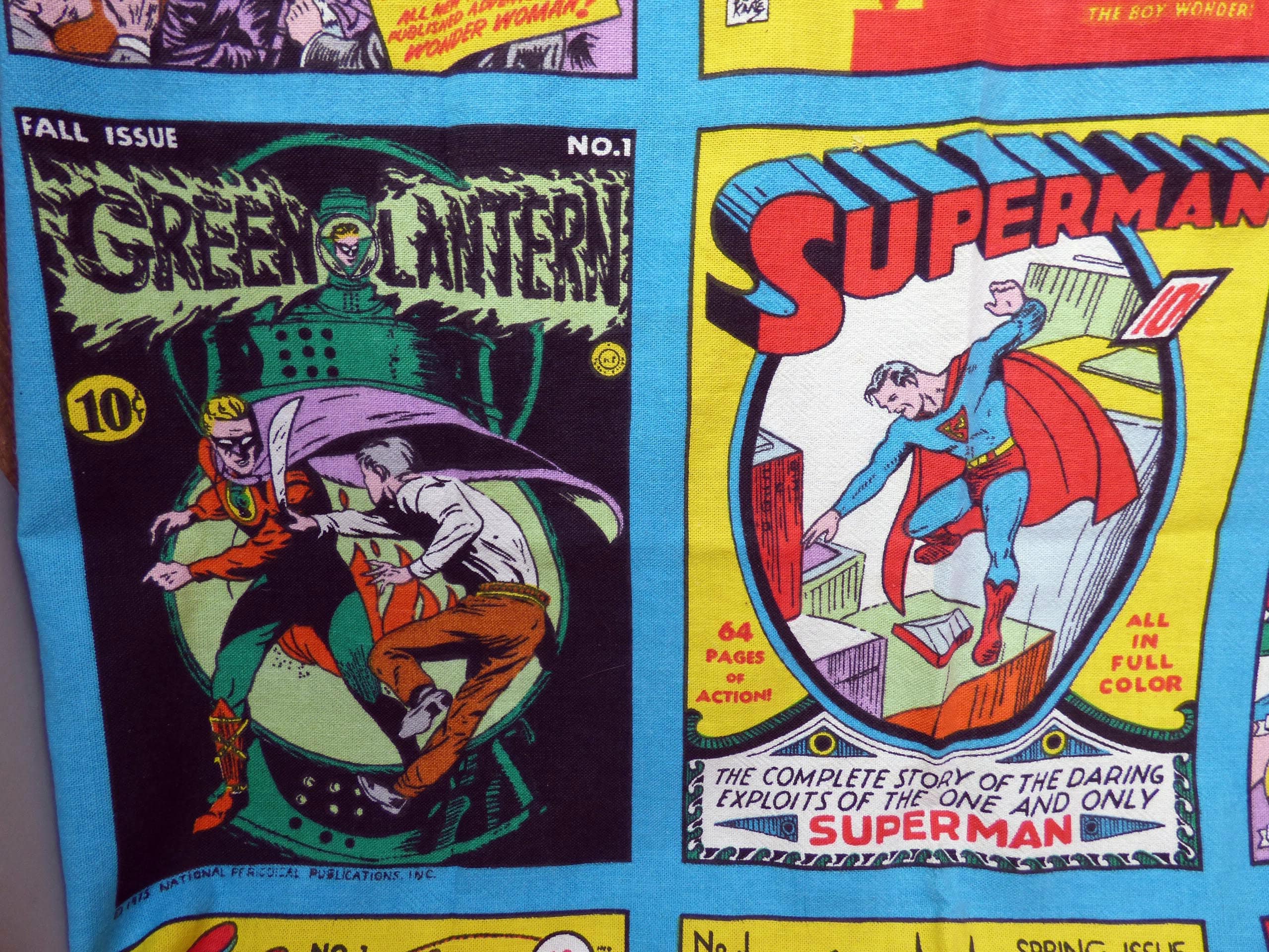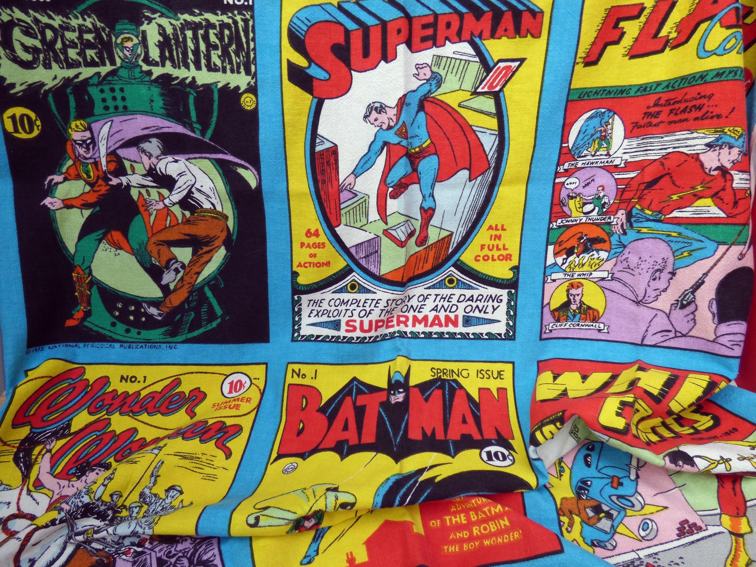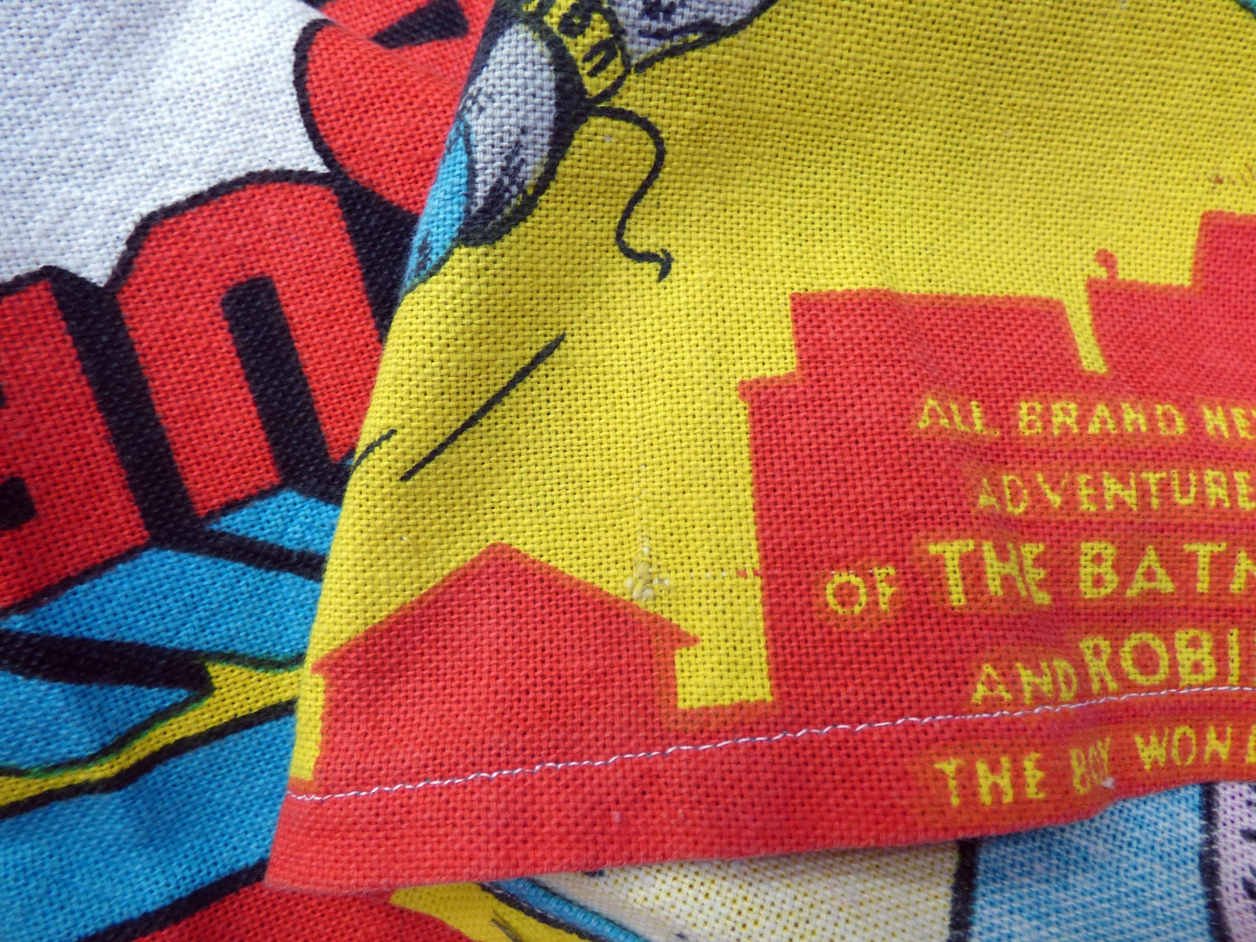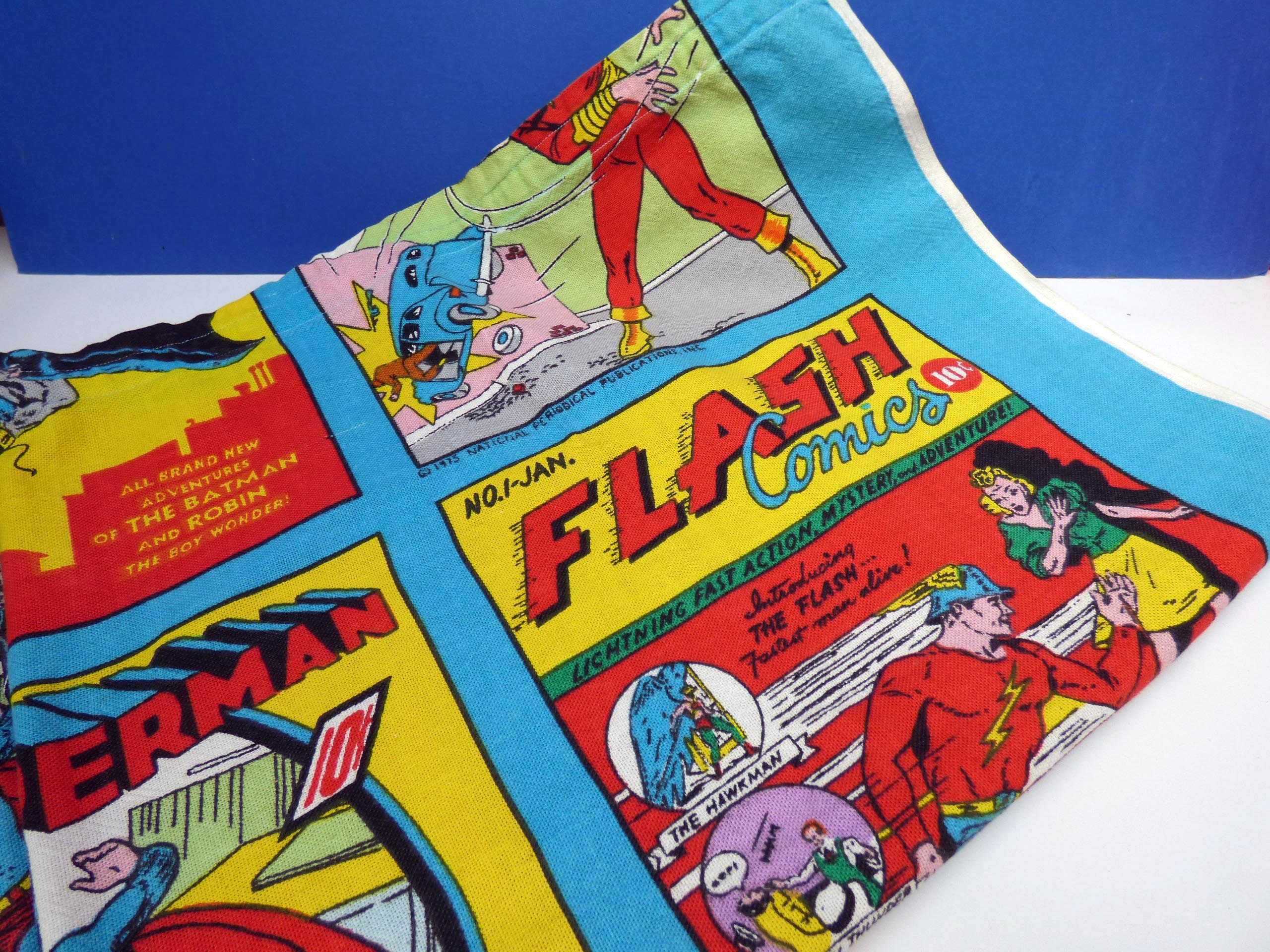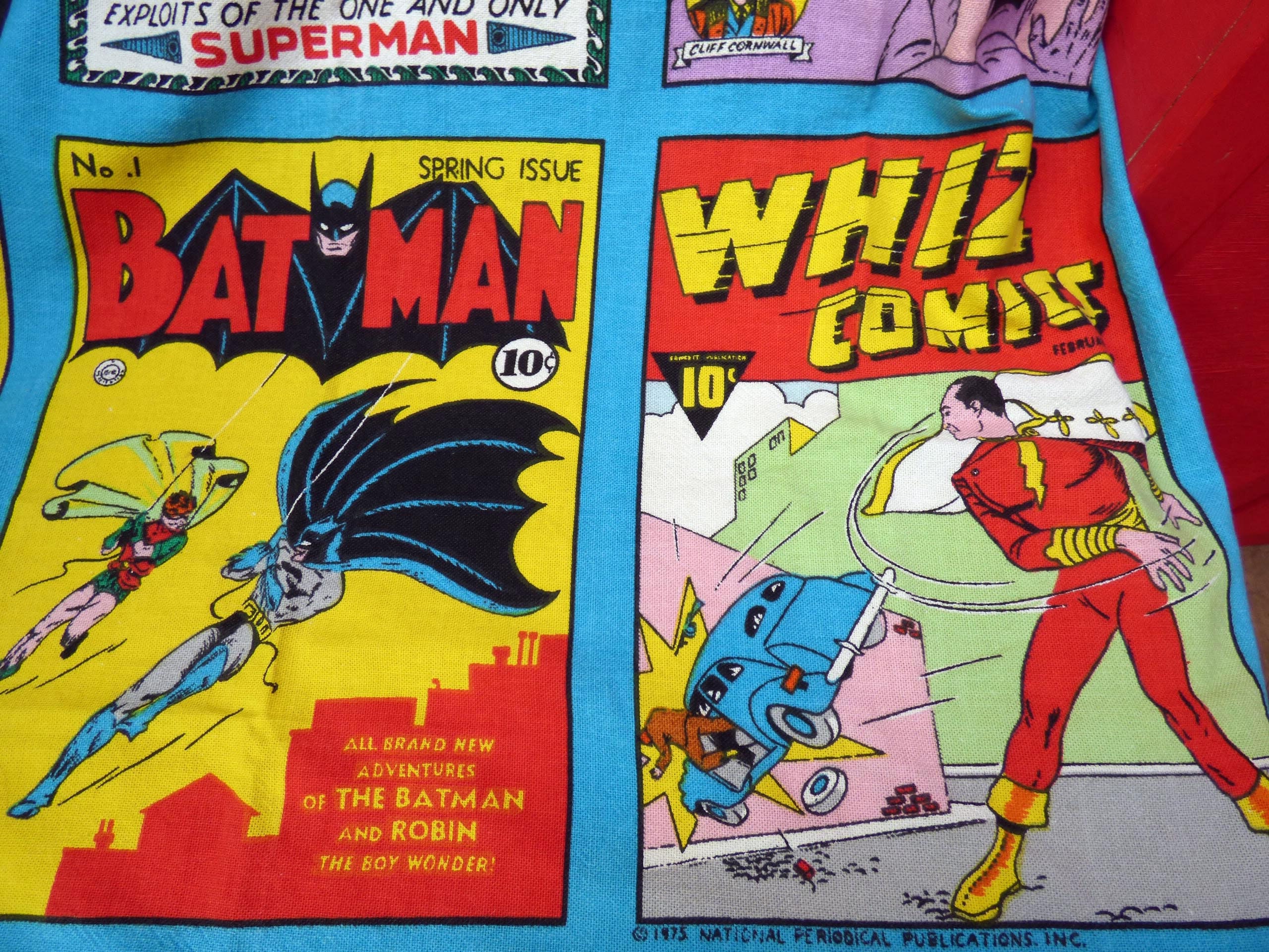 Wonderful vintage single curtain, which was created in 1975. produced in medium weight barkcloth woven cotton, the fabric features DC comics first edition comic covers, and is incredibly rare. The curtain measures 110cm wide that's 43inches and 190cm long which is nearly 75 inches. The single curtain has a simple blue cotton cord for curtain hooks, and is in great condition, washed and fresh, the colours are bright and vibrant, and I don’t believe it’s faded at all from washing. There are a couple of minor areas of wear, a drawing pin has left a small rust mark in one corner, and there’s a small remnant of blue tac on the edge, which remains even though the piece has been washed, and a couple of tiny holes to the fabric in the corners. these are very small imperfections, but these things are always worth a mention.
