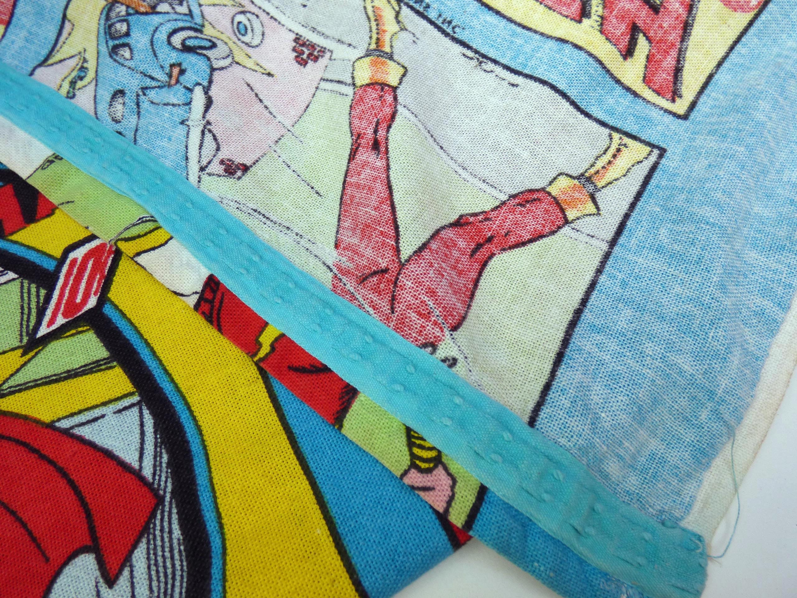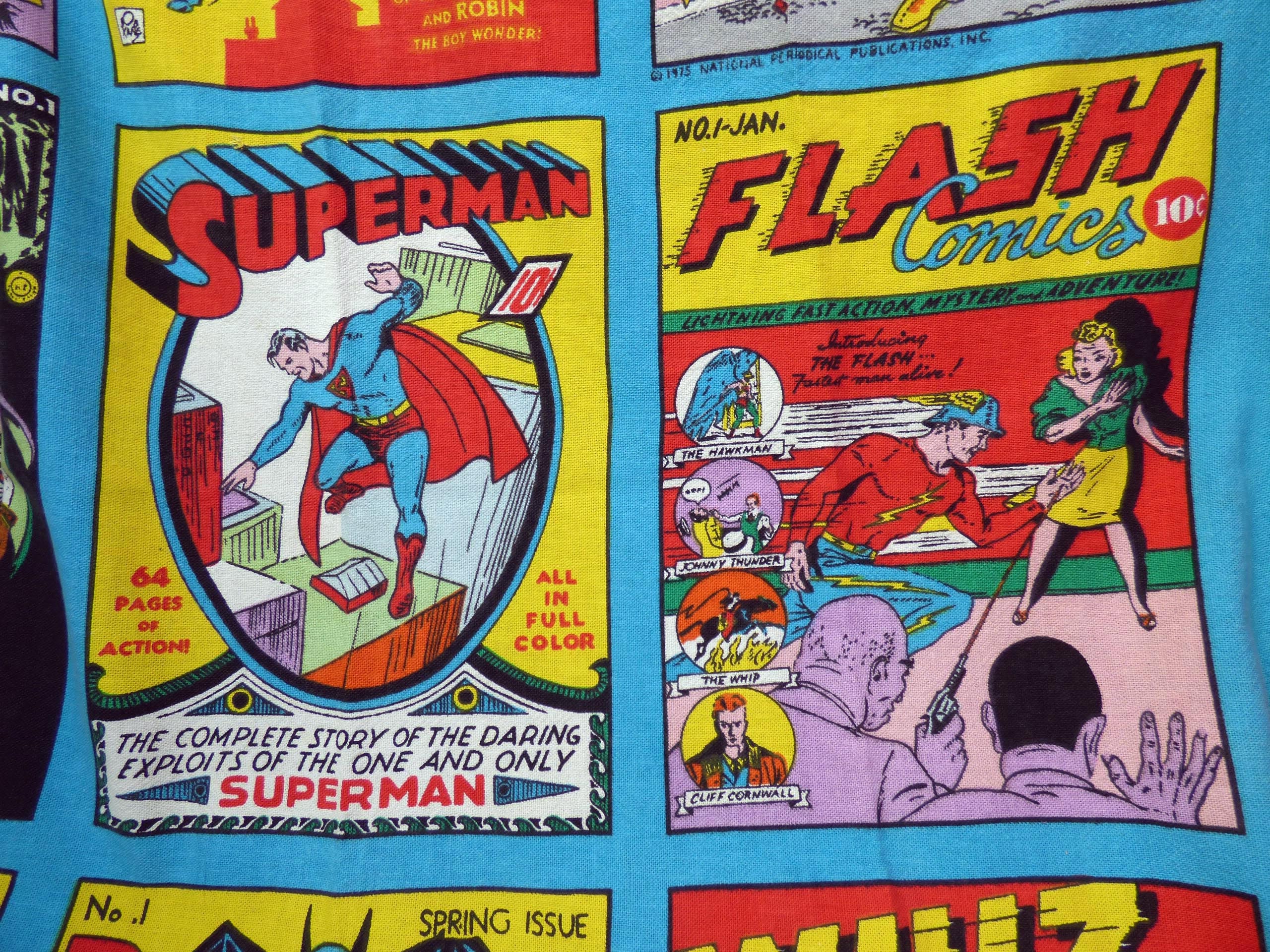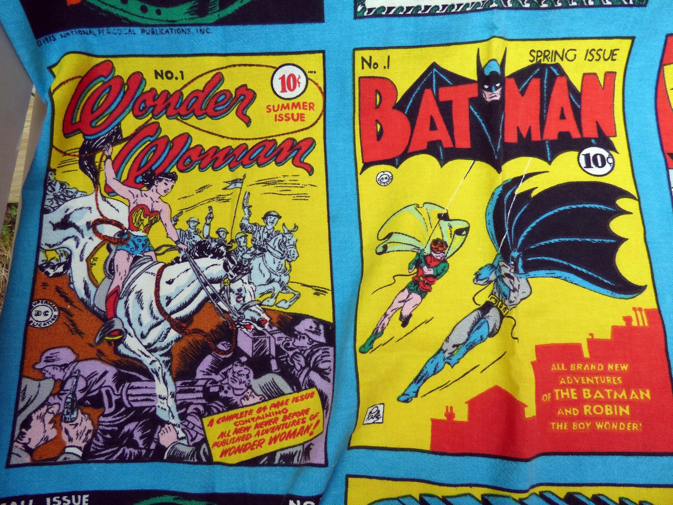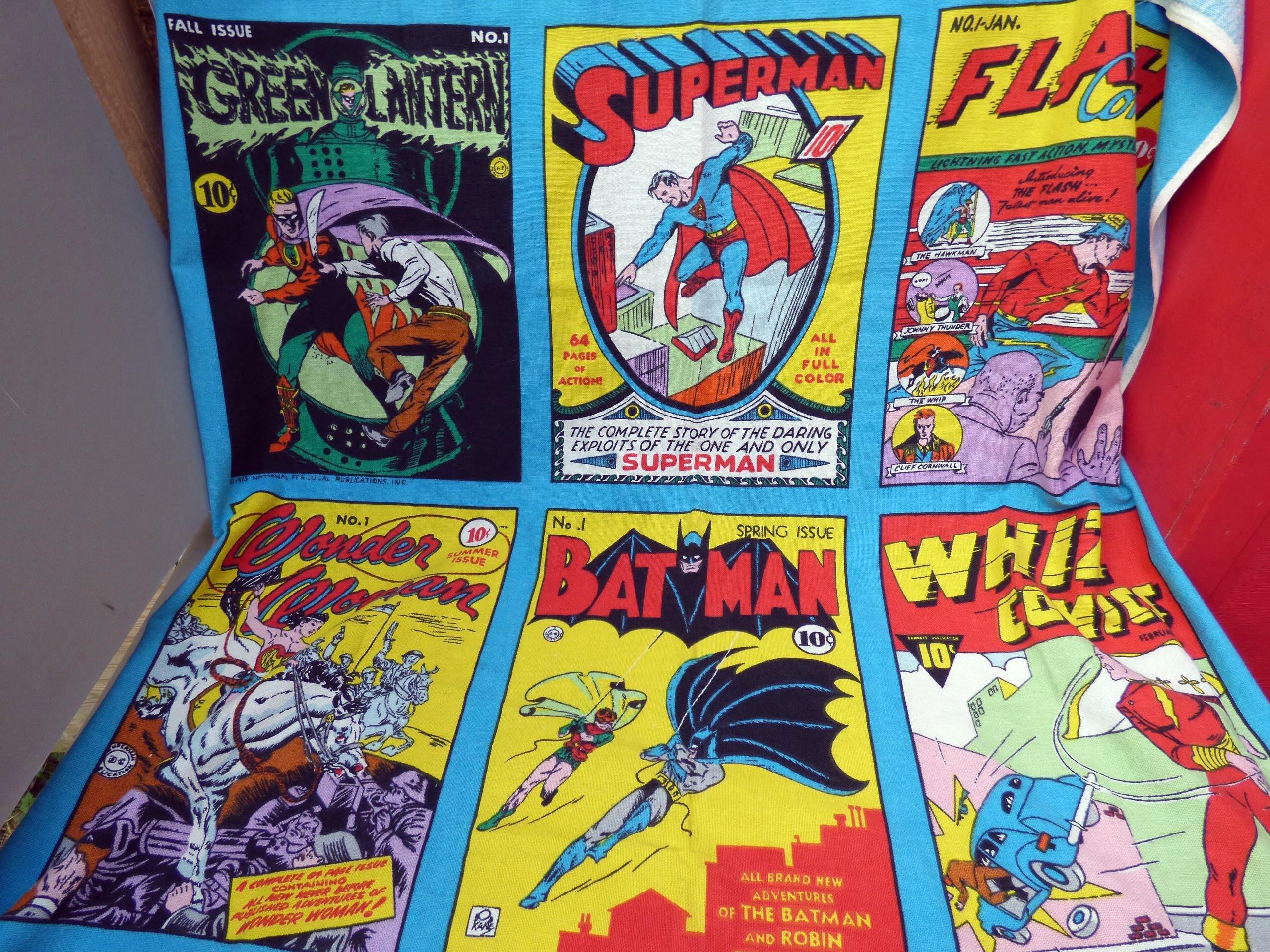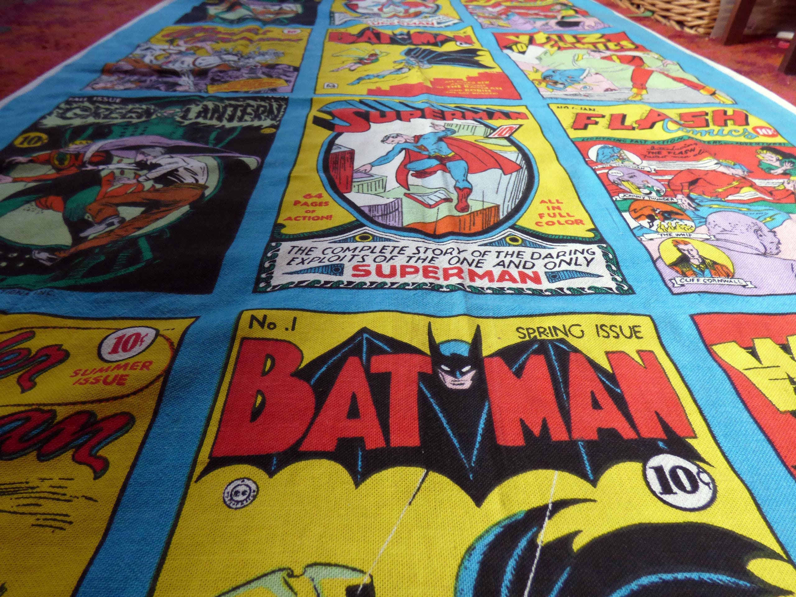 Wonderful vintage single curtain, which was created in 1975. produced in medium weight barkcloth woven cotton, the fabric features DC comics first edition comic covers, and is incredibly rare. The curtain measures 110cm wide that's 43inches and 190cm long which is nearly 75 inches. The single curtain has a simple blue cotton cord for curtain hooks, and is in great condition, washed and fresh, the colours are bright and vibrant, and I don’t believe it’s faded at all from washing. There are a couple of minor areas of wear, a drawing pin has left a small rust mark in one corner, and there’s a small remnant of blue tac on the edge, which remains even though the piece has been washed, and a couple of tiny holes to the fabric in the corners. these are very small imperfections, but these things are always worth a mention.