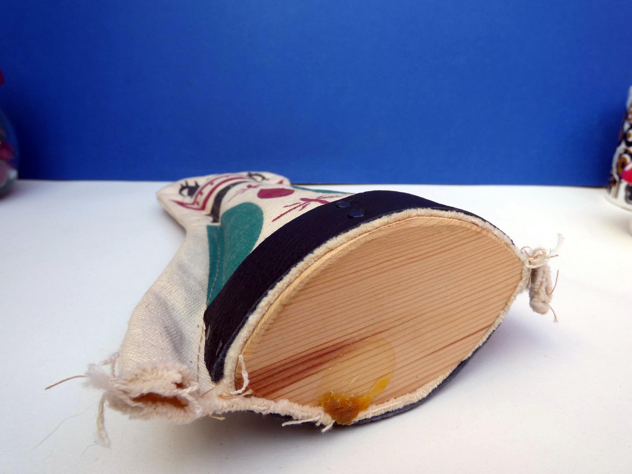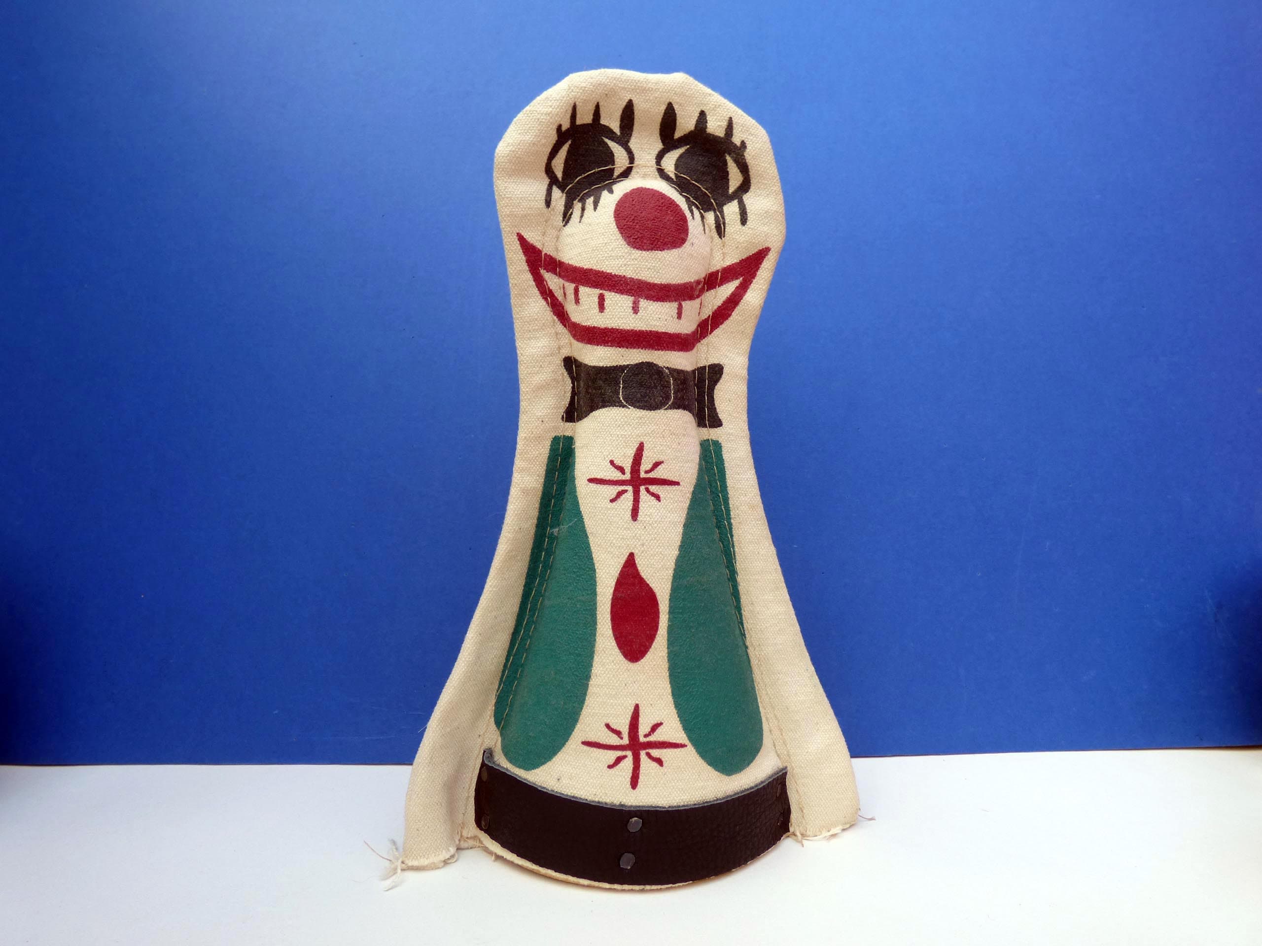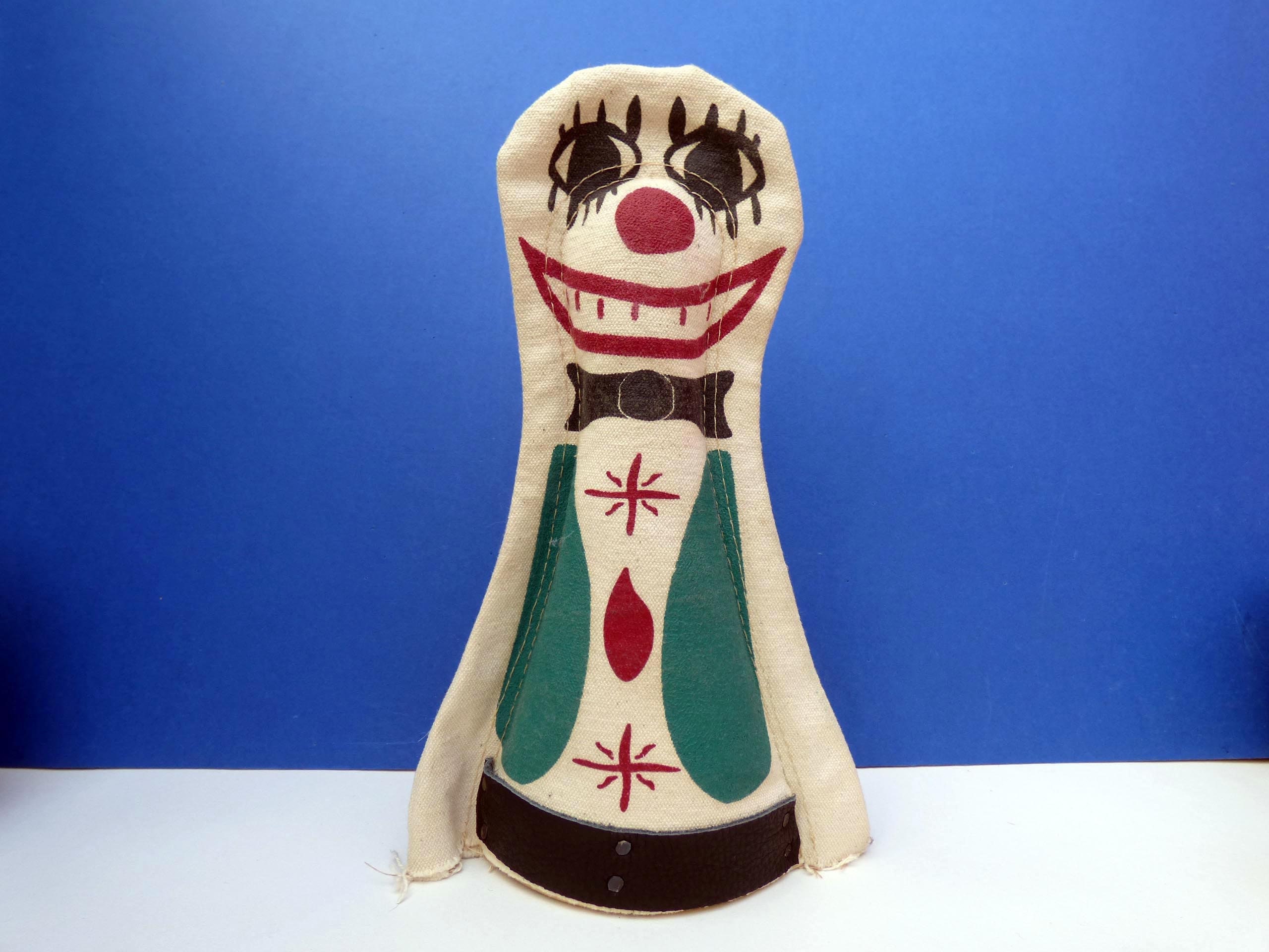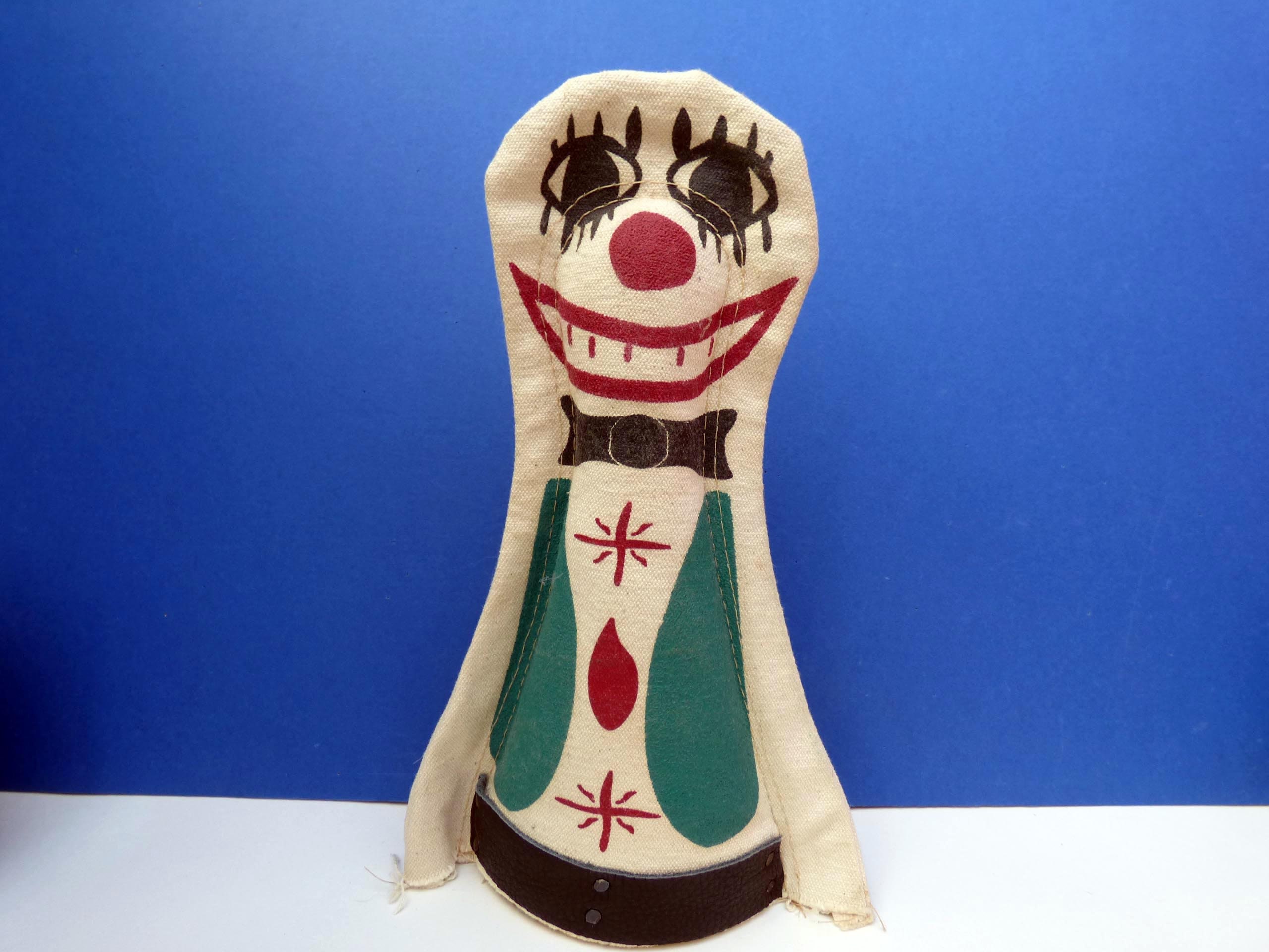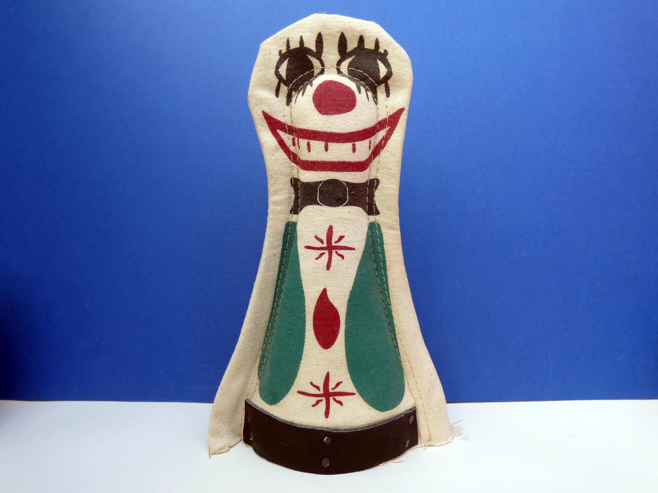 American collectible carnival punk knock me down fair ground toy, created from wood, hand screenprinted canvas fabric, with a leather nailed rim, this is a replica which was created for an exhibition of American carnival memorabilia, I brought it many years ago and can’t remember the details of the exhibition. Punk knock ‘em downs were funfair games like skittles, they are unique pieces of folk art and highly collectible many from the 1930s sell for thousands. This is a reproduction for the exhibition of a classic design of a genuine punk design. I believe the exhibition was in the late 90 s but I can’t find the details.