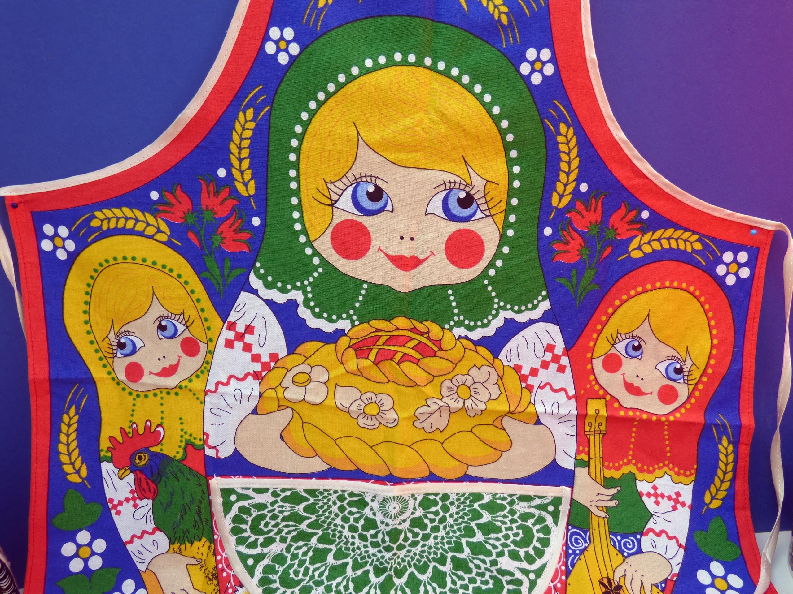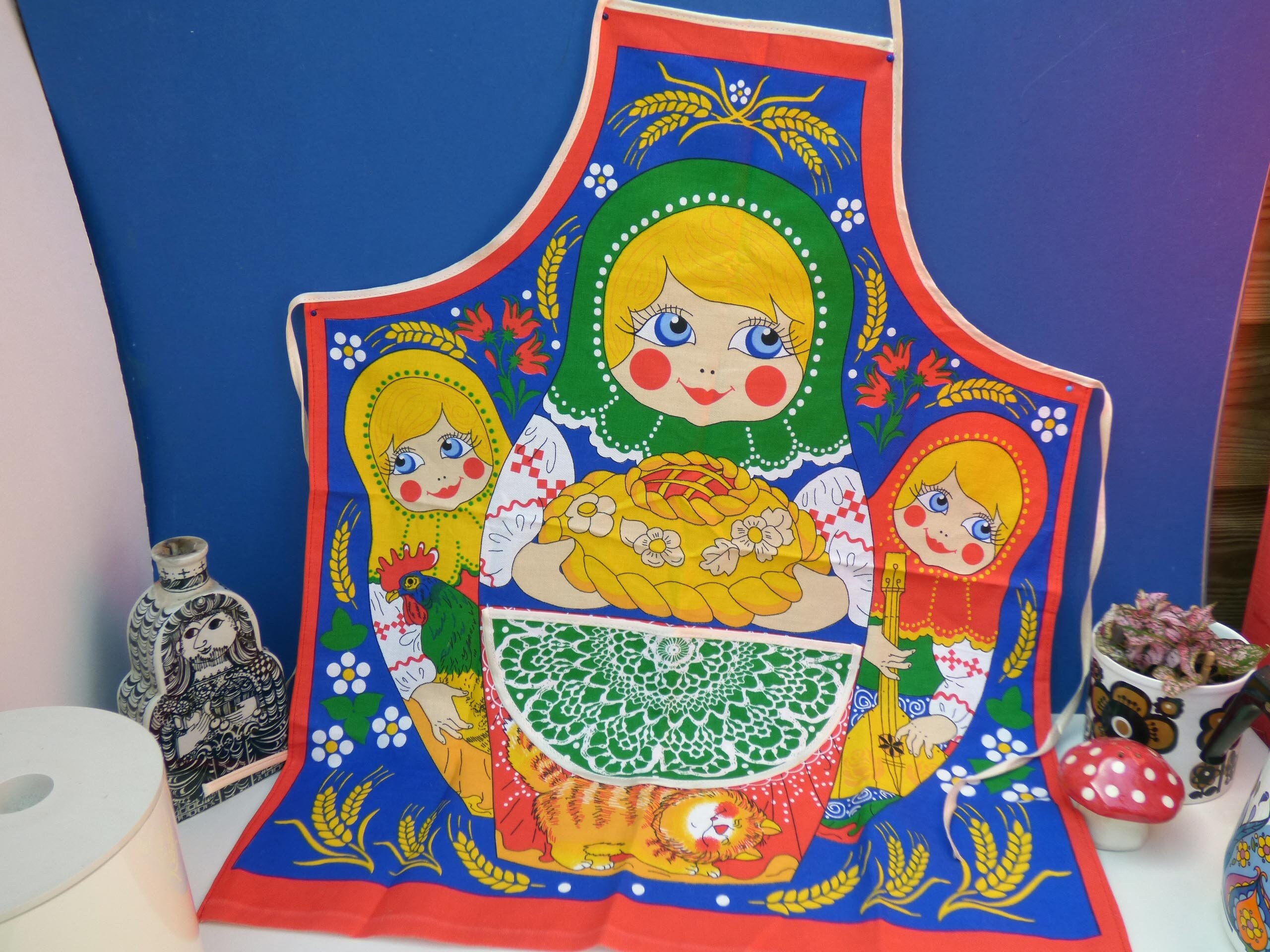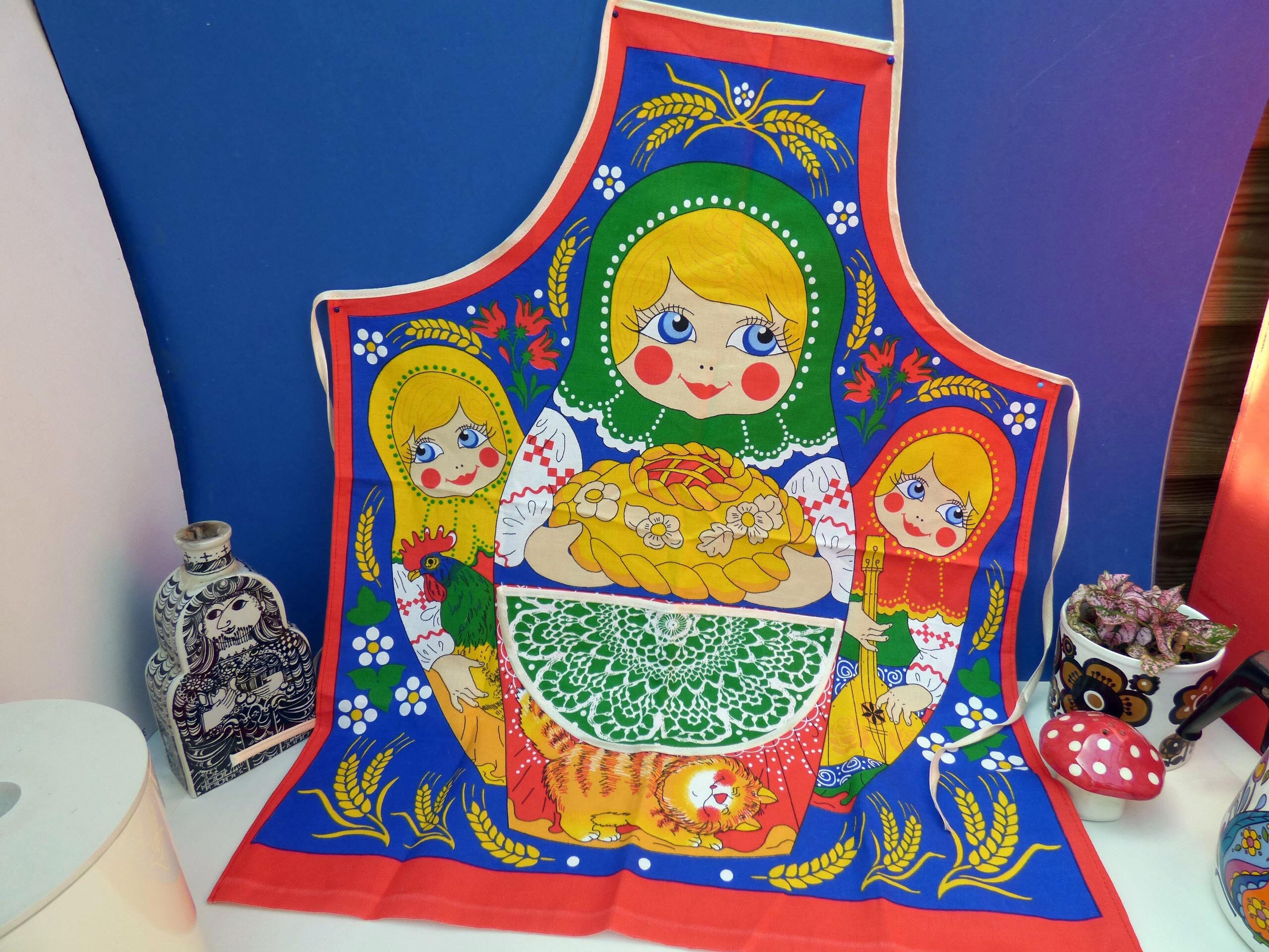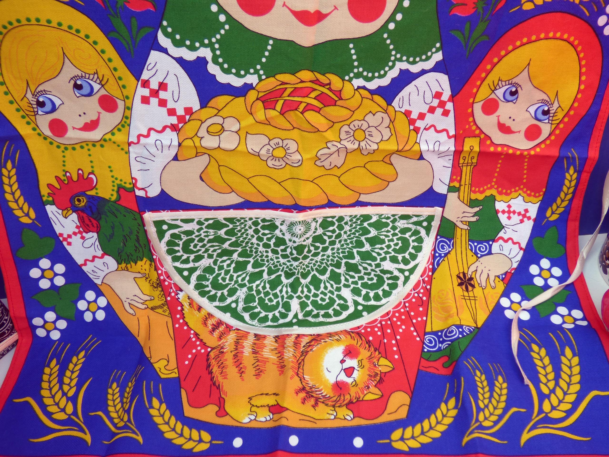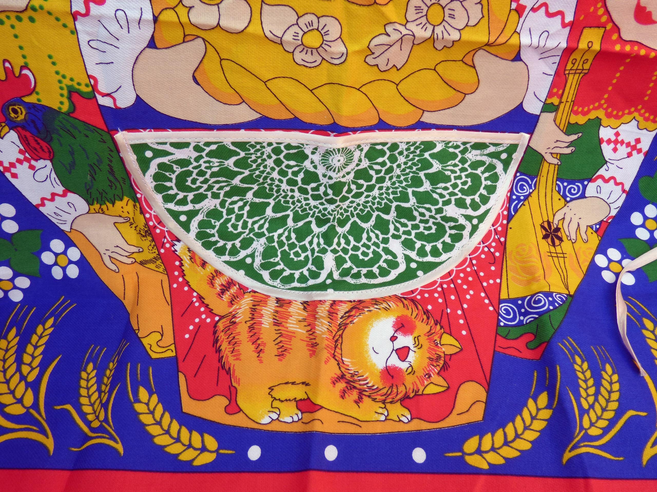 A wonderful vintage apron, featuring three Russian dolls, playing musical instruments and baking with a lovely ginger cat enjoying the music. The apron is in excellent condition. I don’t believe it’s ever been used and therefore has no marks or stains.