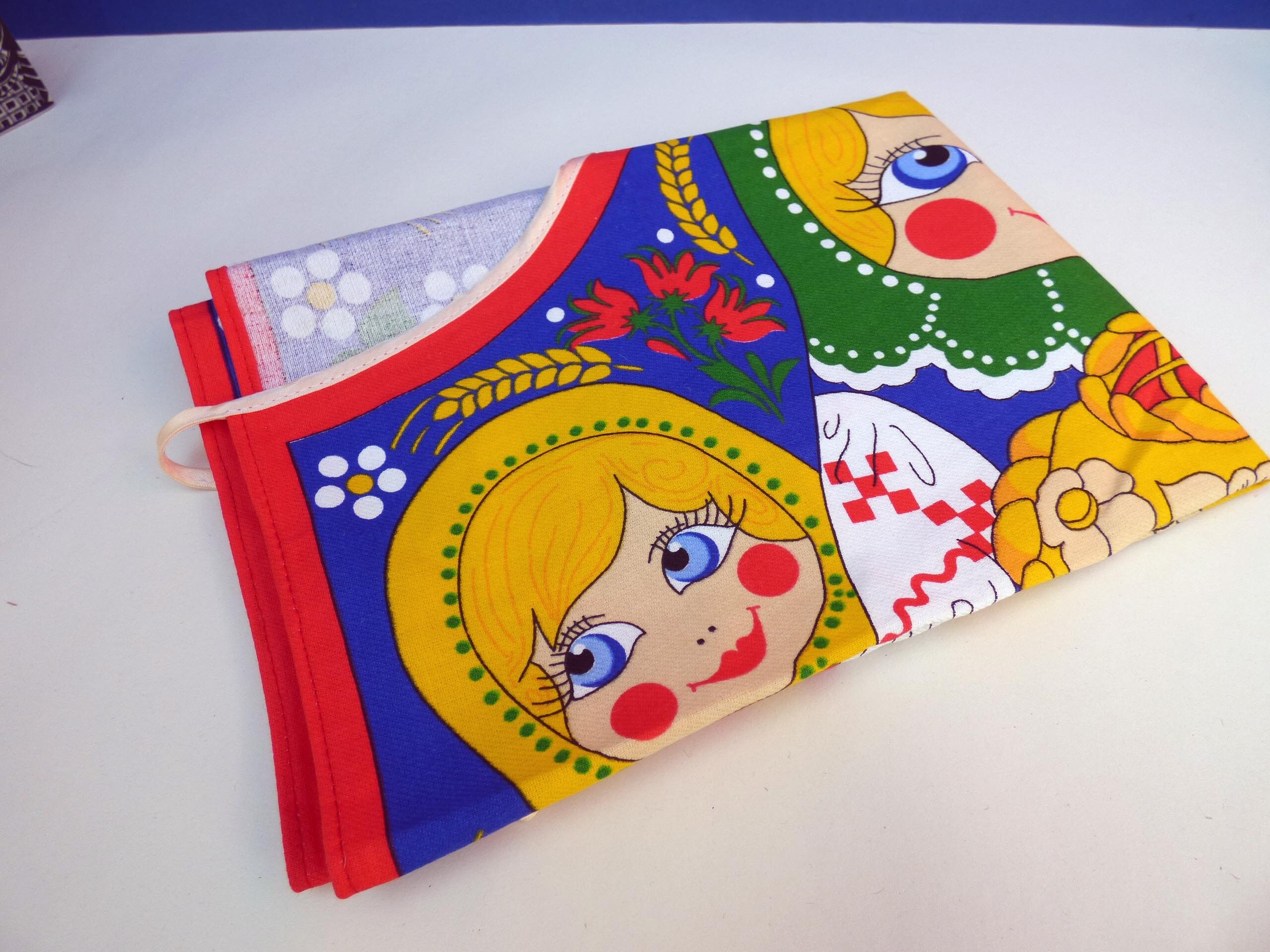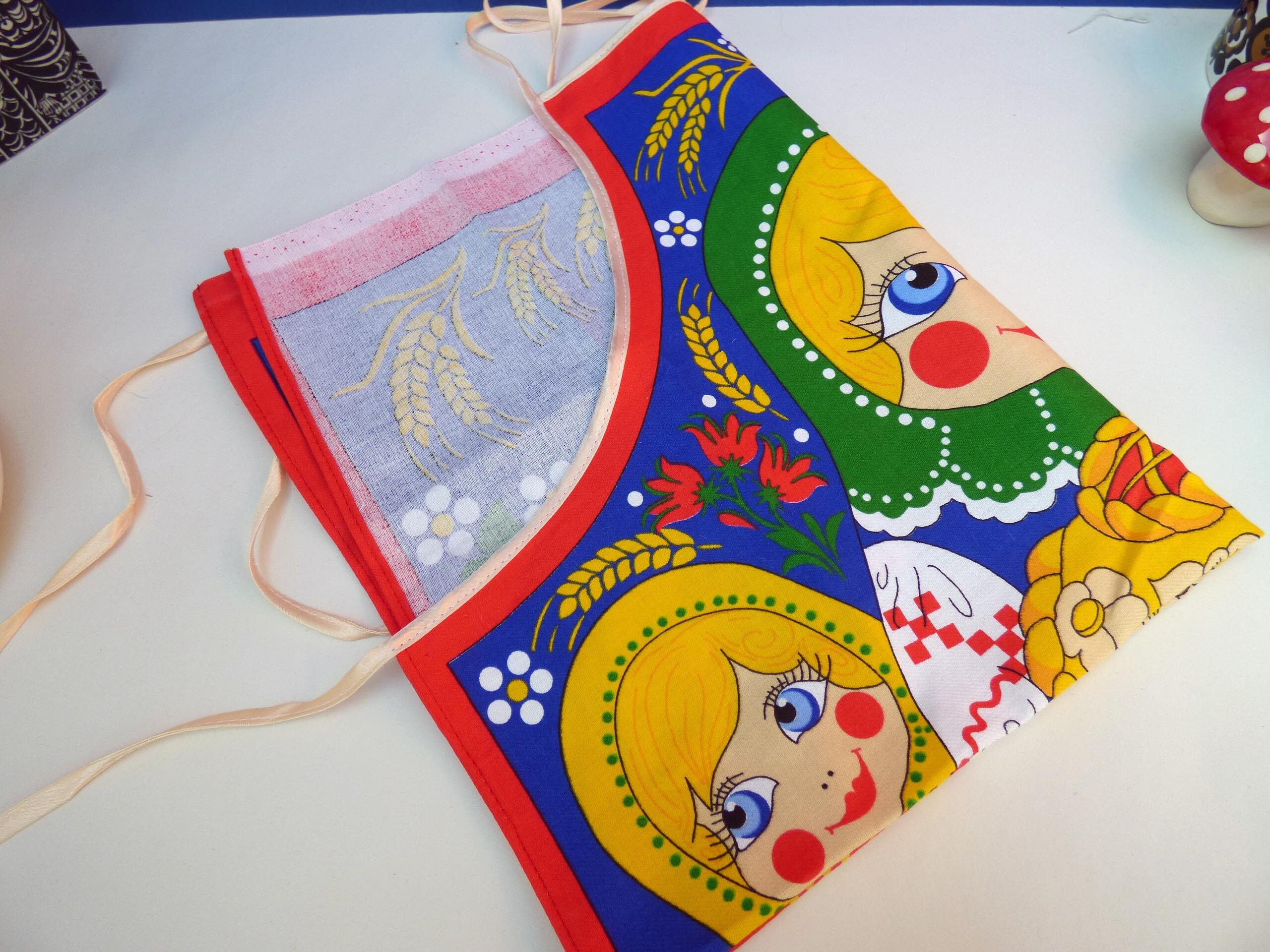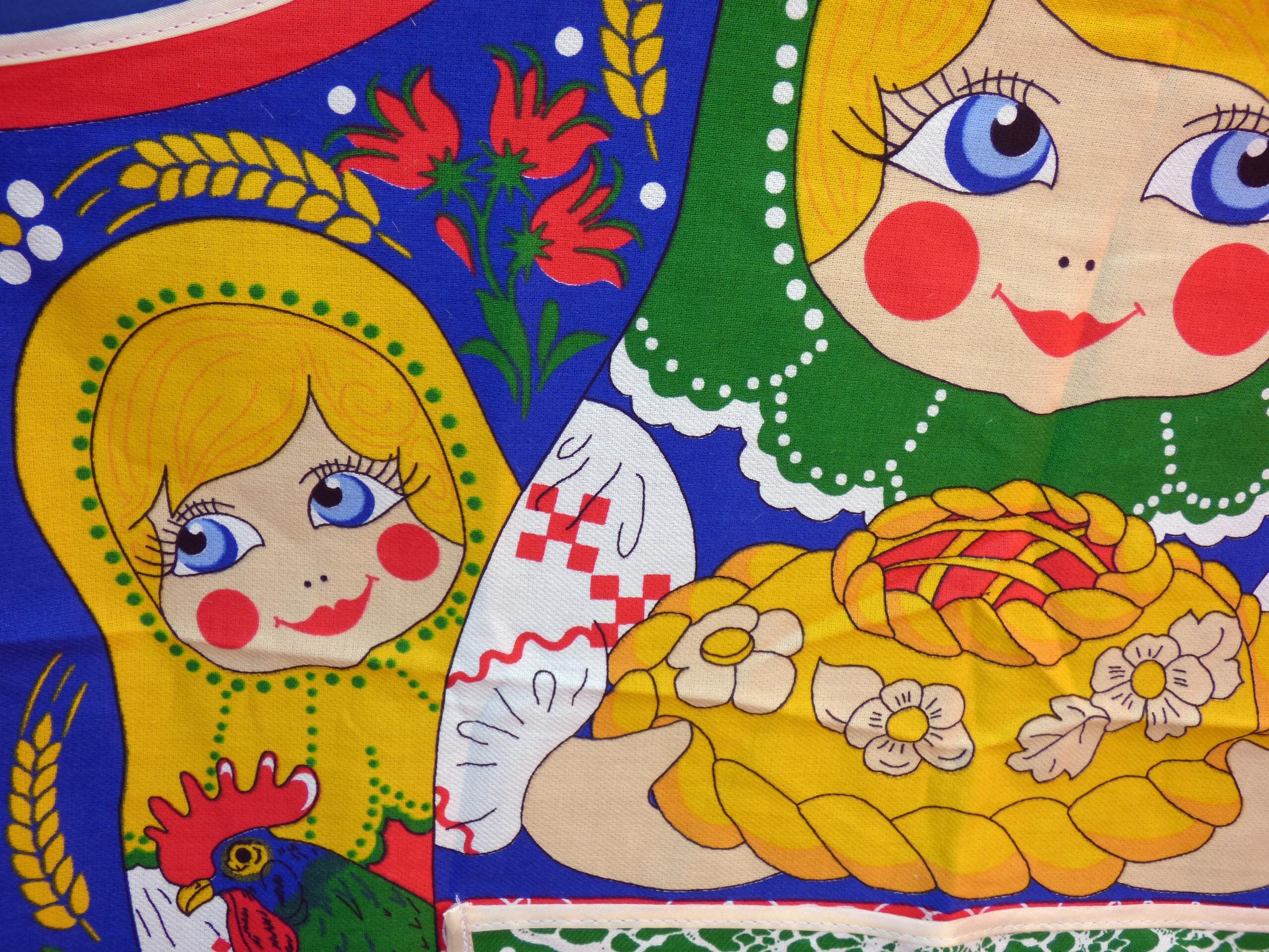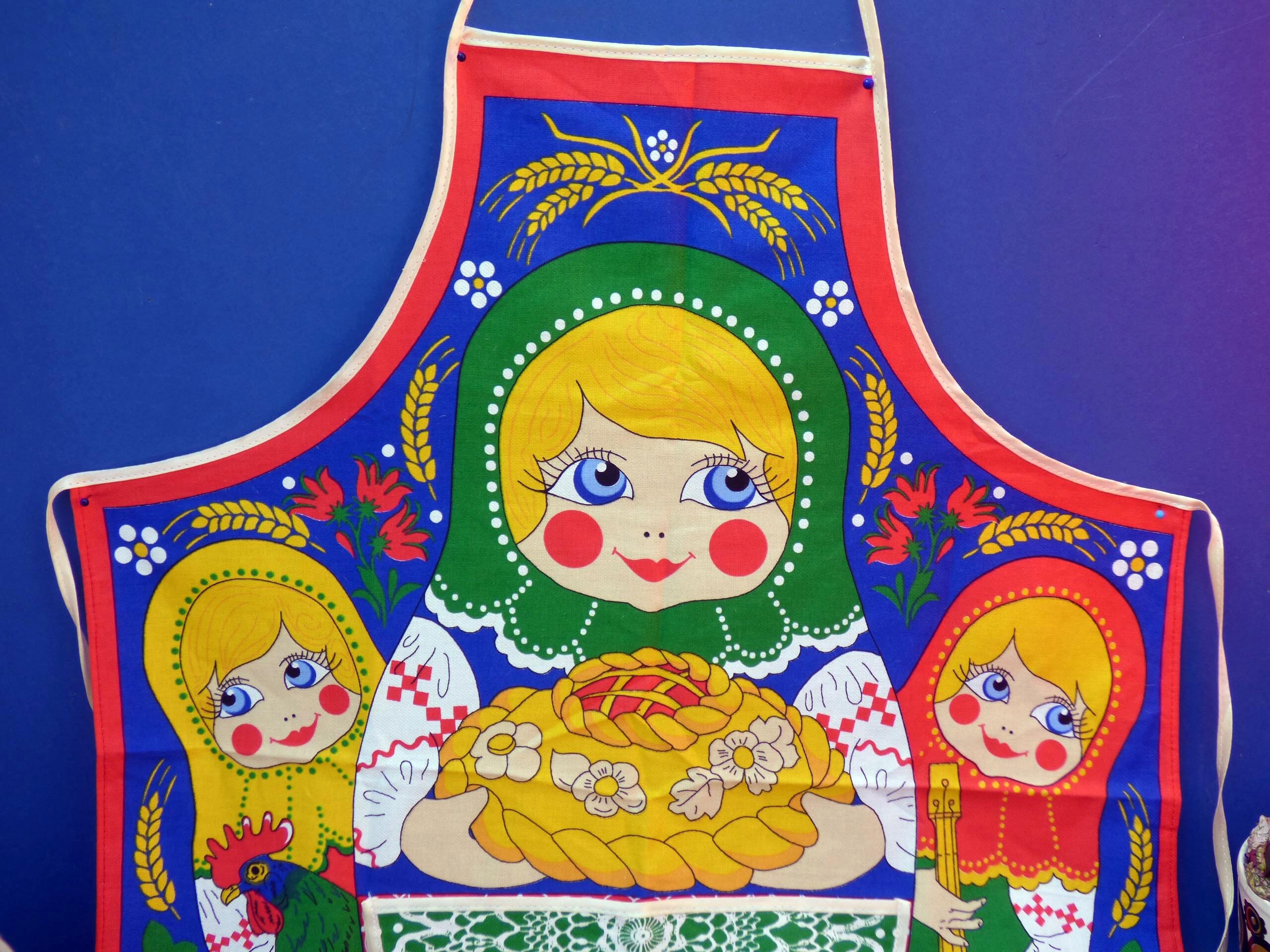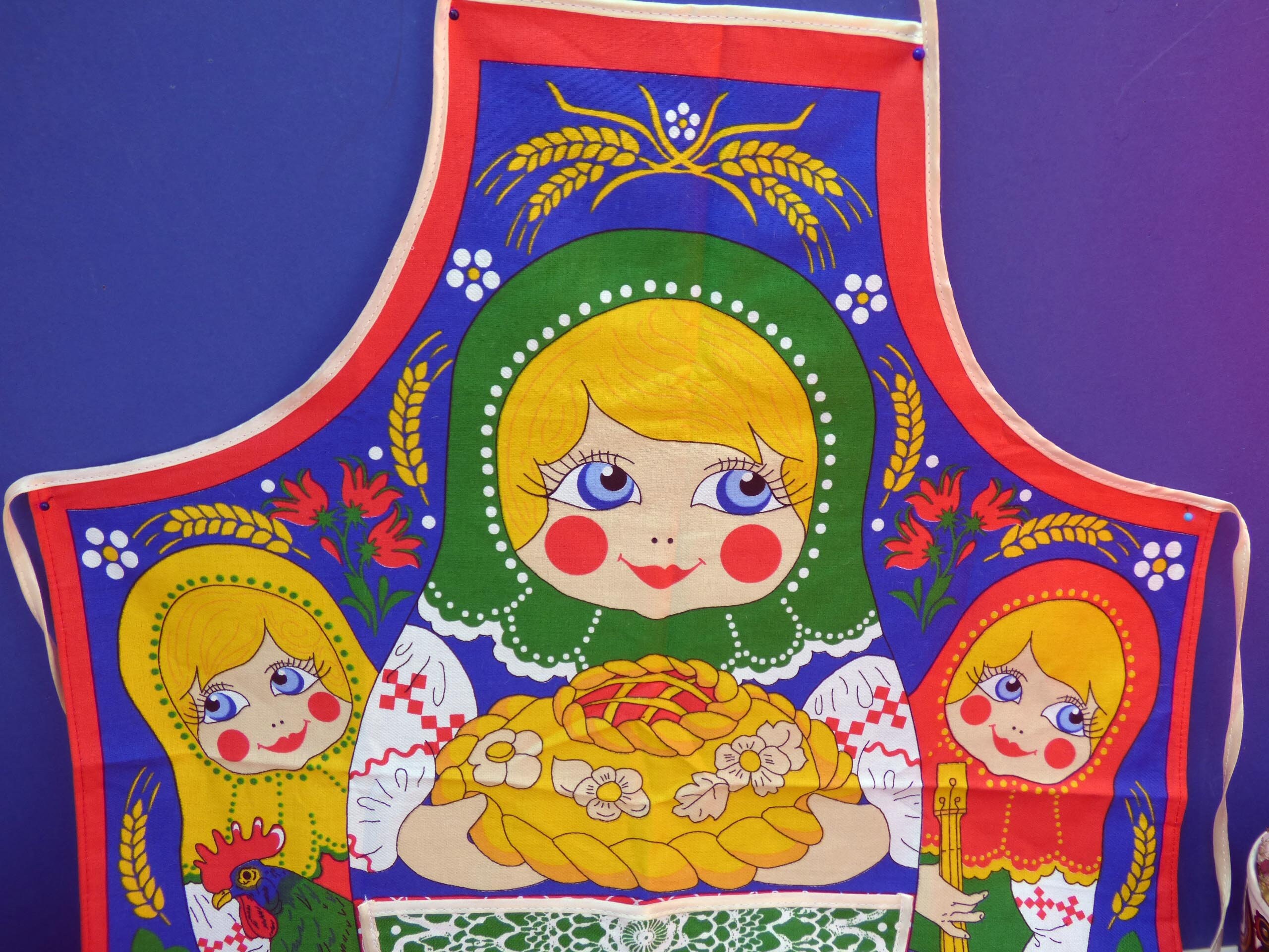 A wonderful vintage apron, featuring three Russian dolls, playing musical instruments and baking with a lovely ginger cat enjoying the music. The apron is in excellent condition. I don’t believe it’s ever been used and therefore has no marks or stains.