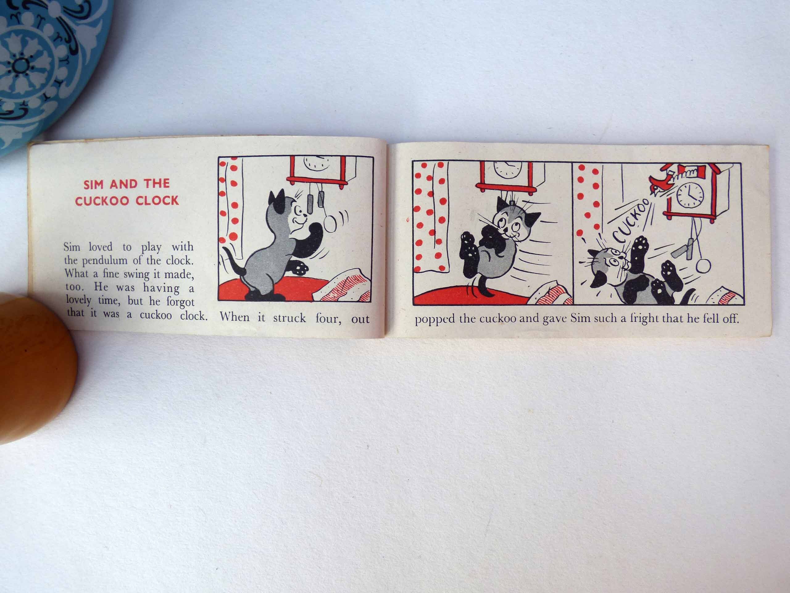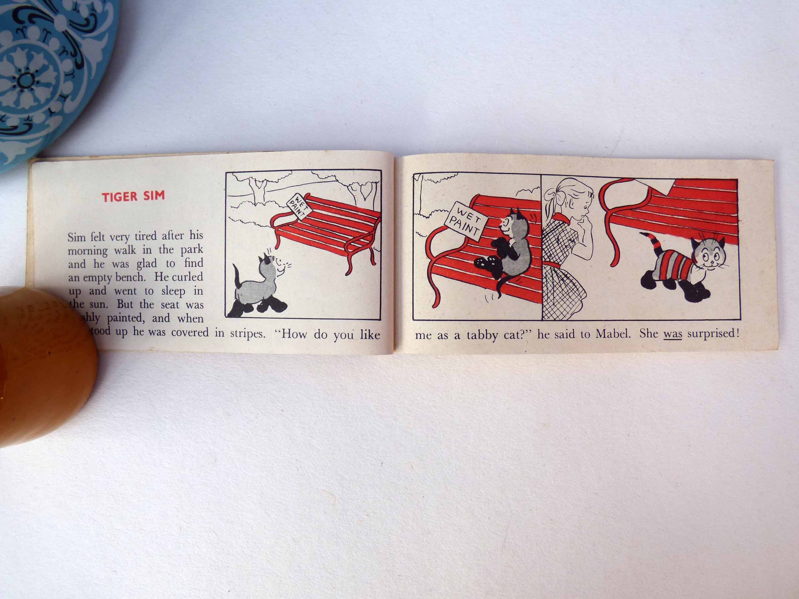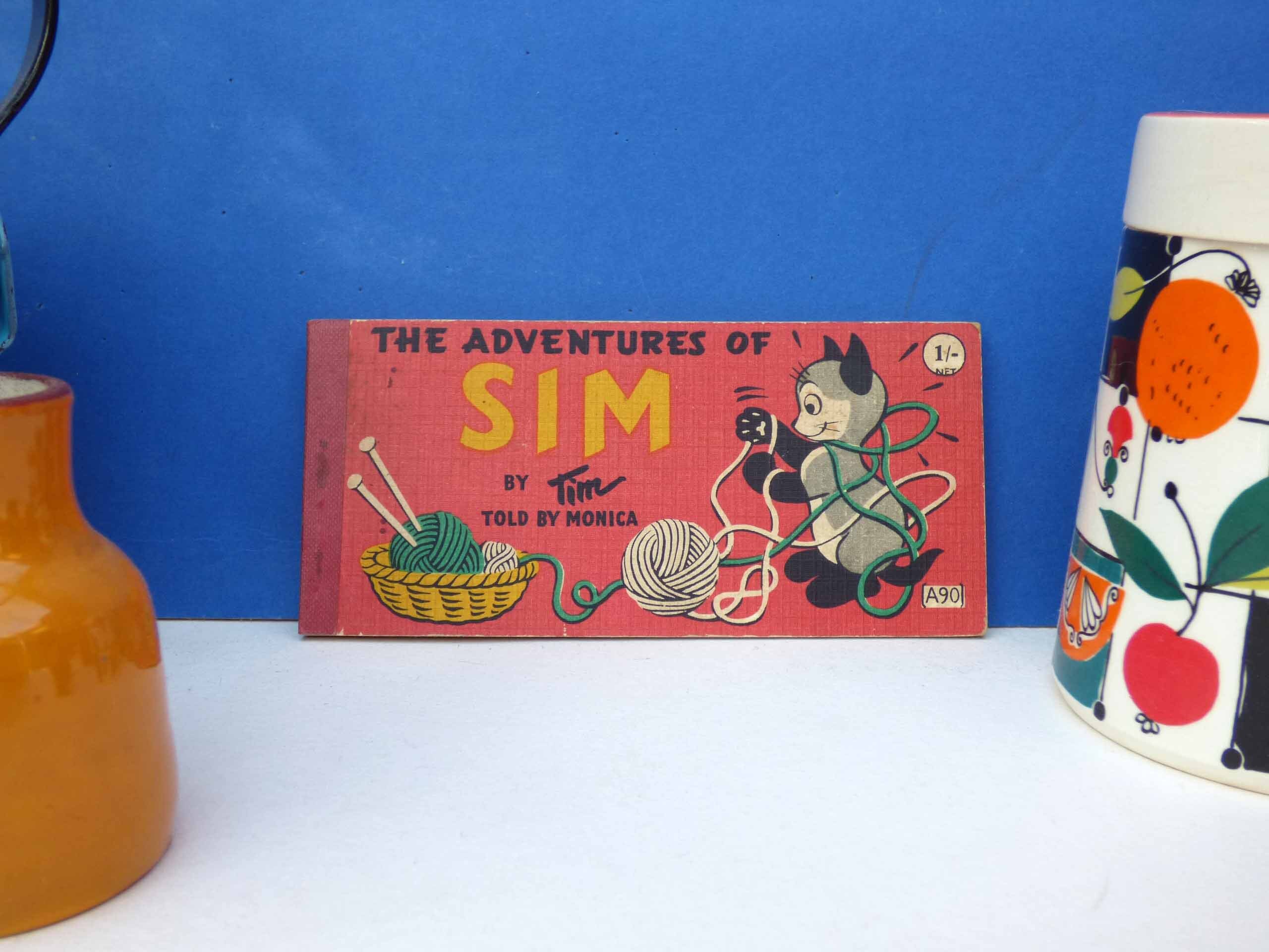 A wonderful cartoon book, entitled the adventures of Sim, this small, softback book, features short stories about a cat called Sim. Each story. It’s just two pages long with titles, such as Sim and the kangaroo, Sim and the turtle, Sim goes to a party, Sim and the bees, each one features beautiful illustrations in cartoon style of Sim and his adventures.