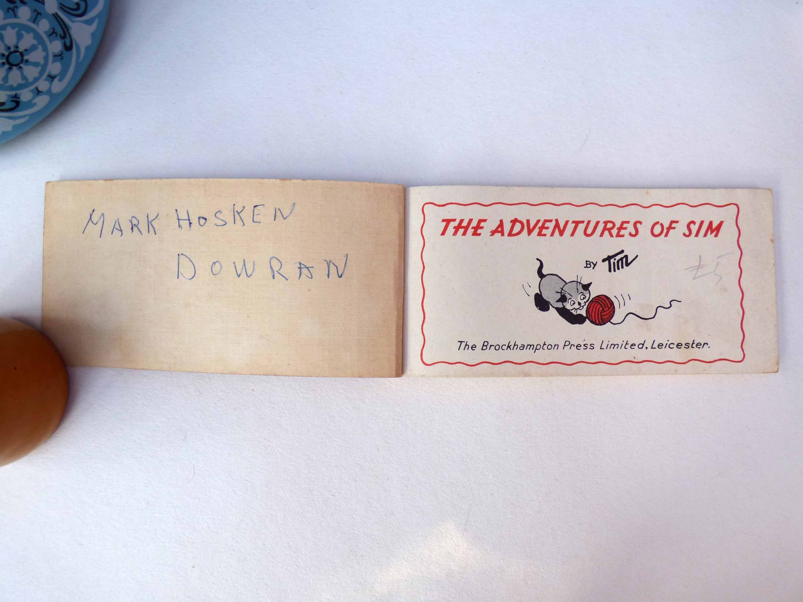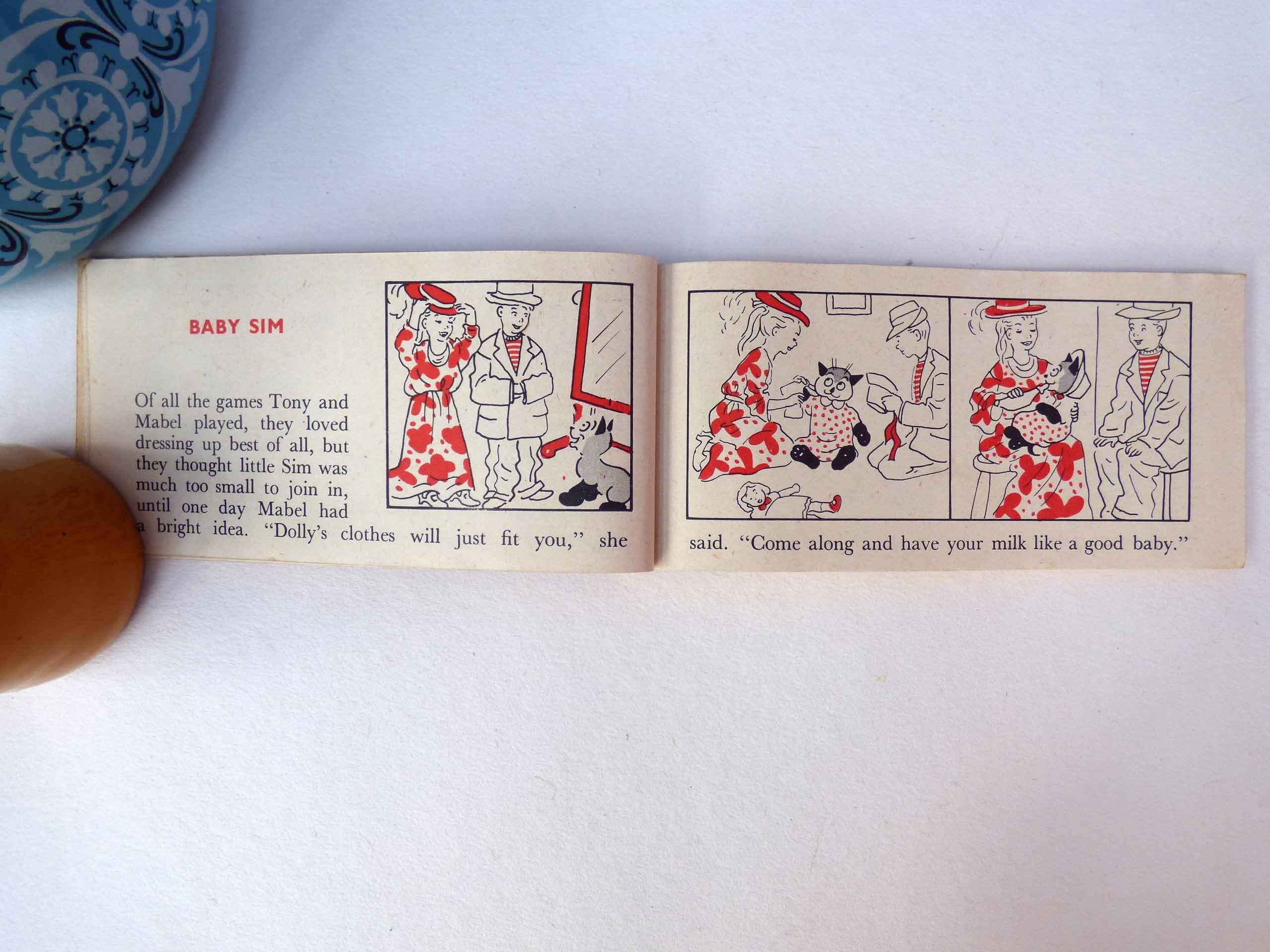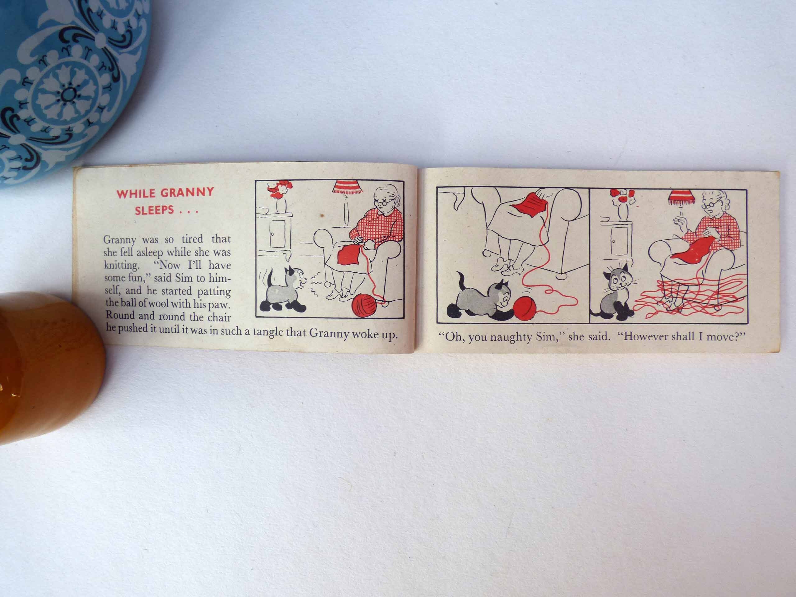 A wonderful cartoon book, entitled the adventures of Sim, this small, softback book, features short stories about a cat called Sim. Each story. It’s just two pages long with titles, such as Sim and the kangaroo, Sim and the turtle, Sim goes to a party, Sim and the bees, each one features beautiful illustrations in cartoon style of Sim and his adventures.
