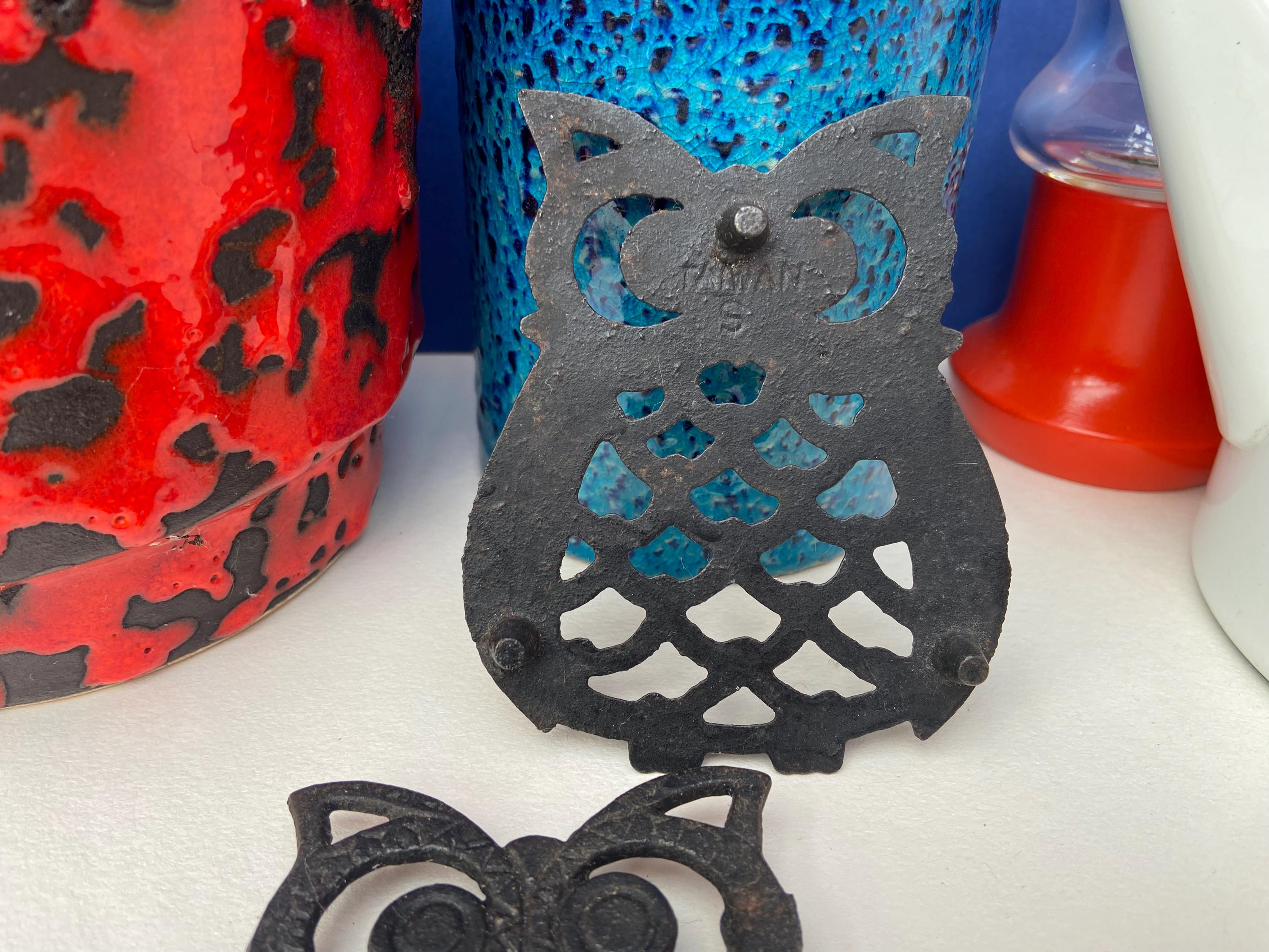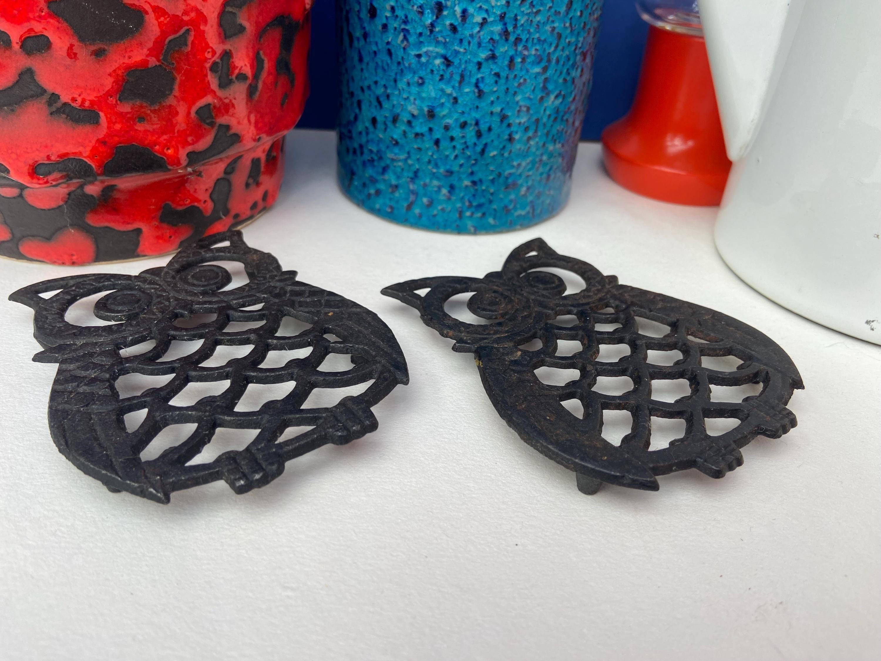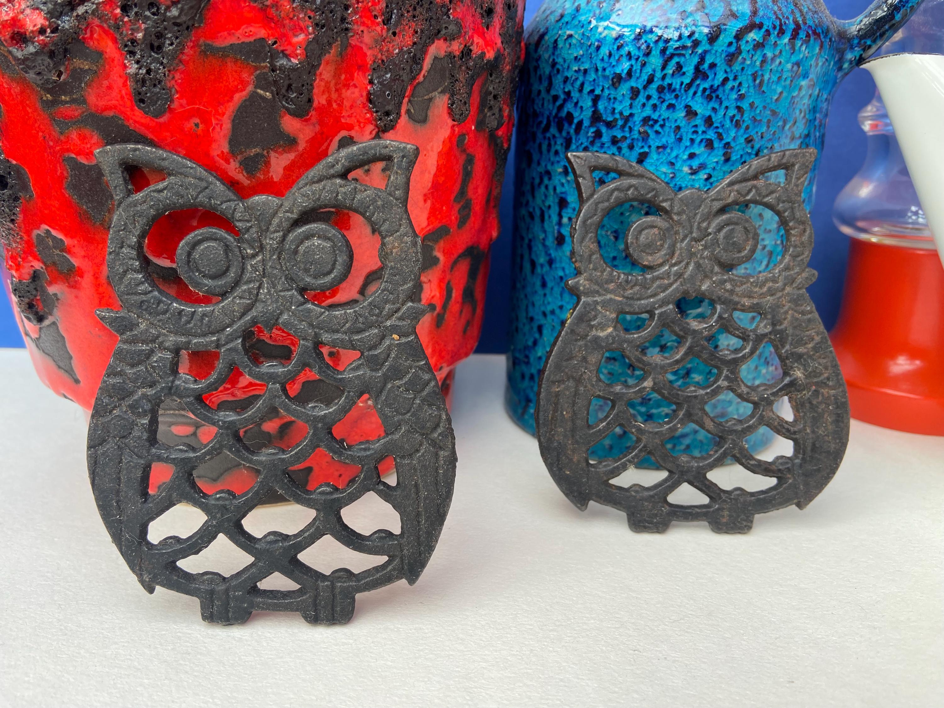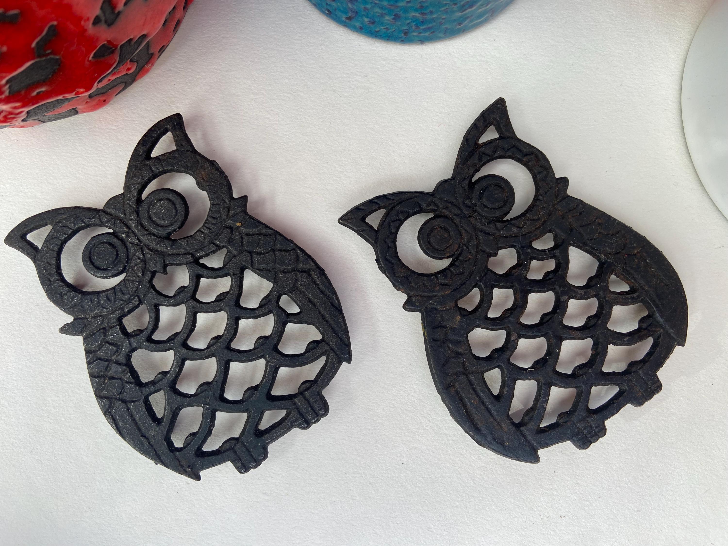Owl coaster's, created from blackened cast iron, super cute, great as coasters or trivets in the kitchen, or as wall hangings. The price is for 2 owls.