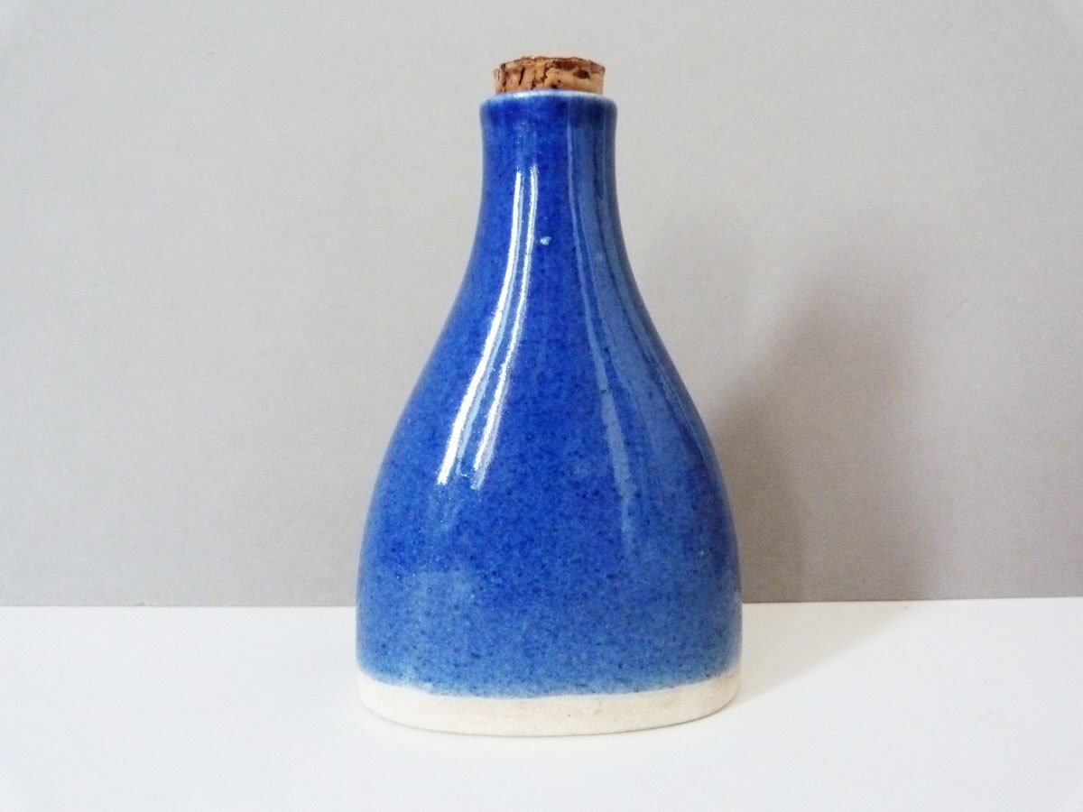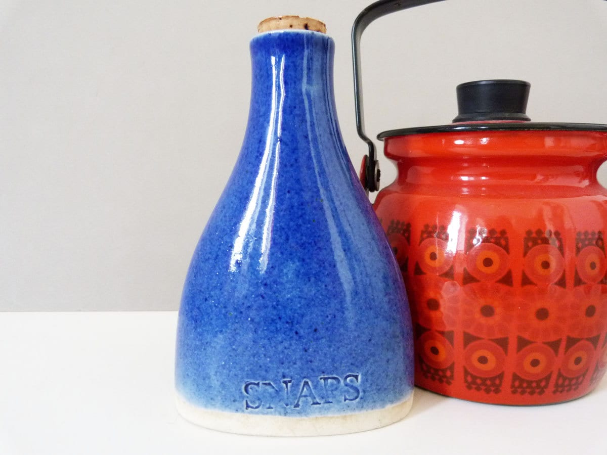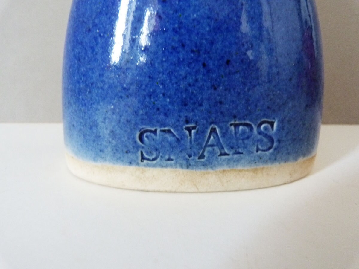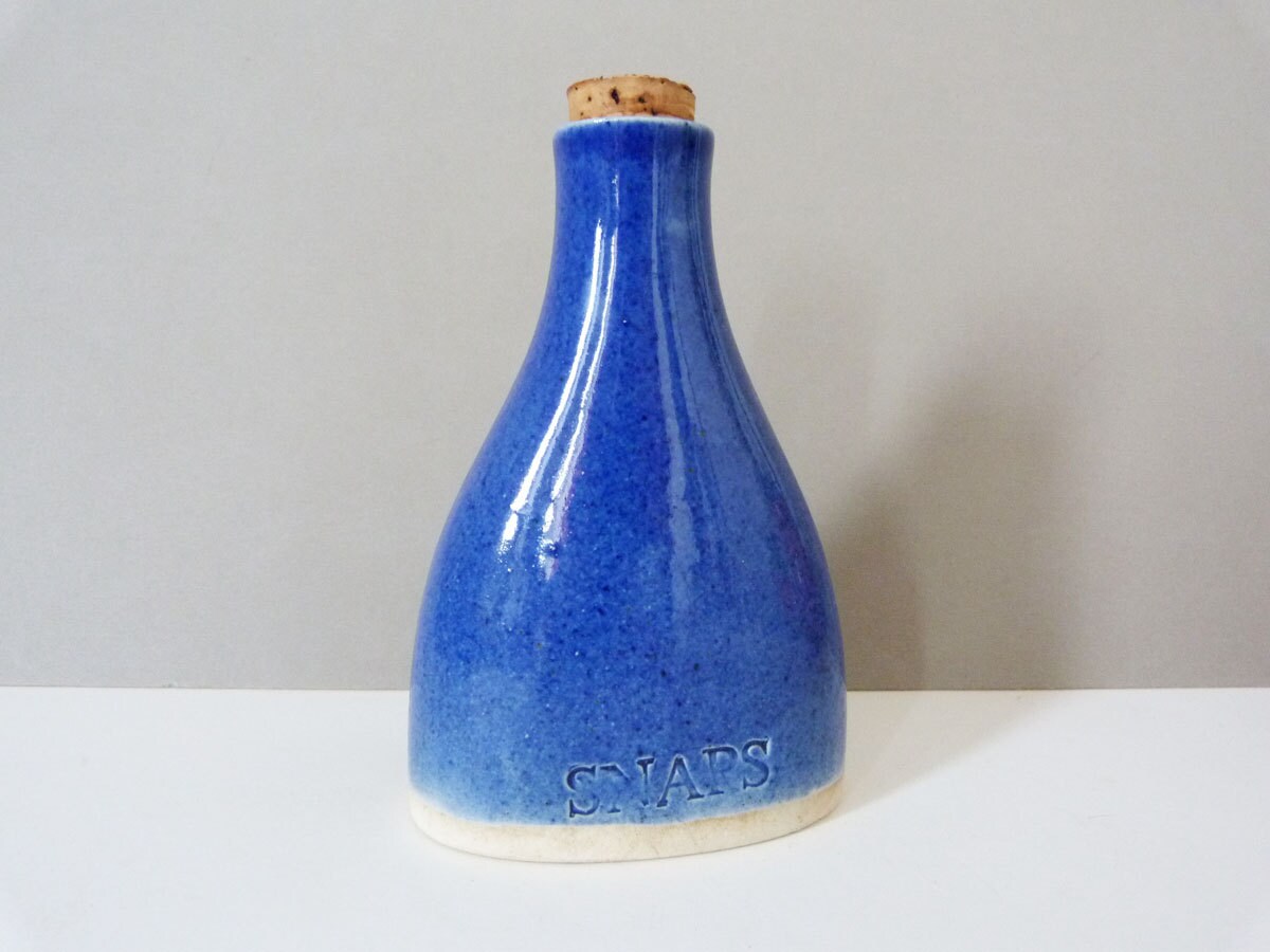 Beautiful ceramic blue snaps bottle from Janus Designs of Denmark. This little ceramic bottle is perfect for your favourite tipple, or would make a great gift. The bottle measures 14cm tall, and is complete with its original cork stopper.
