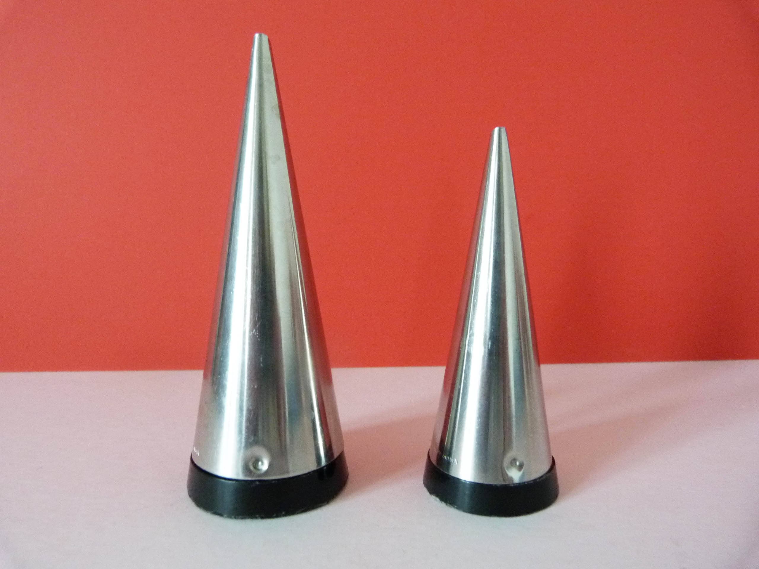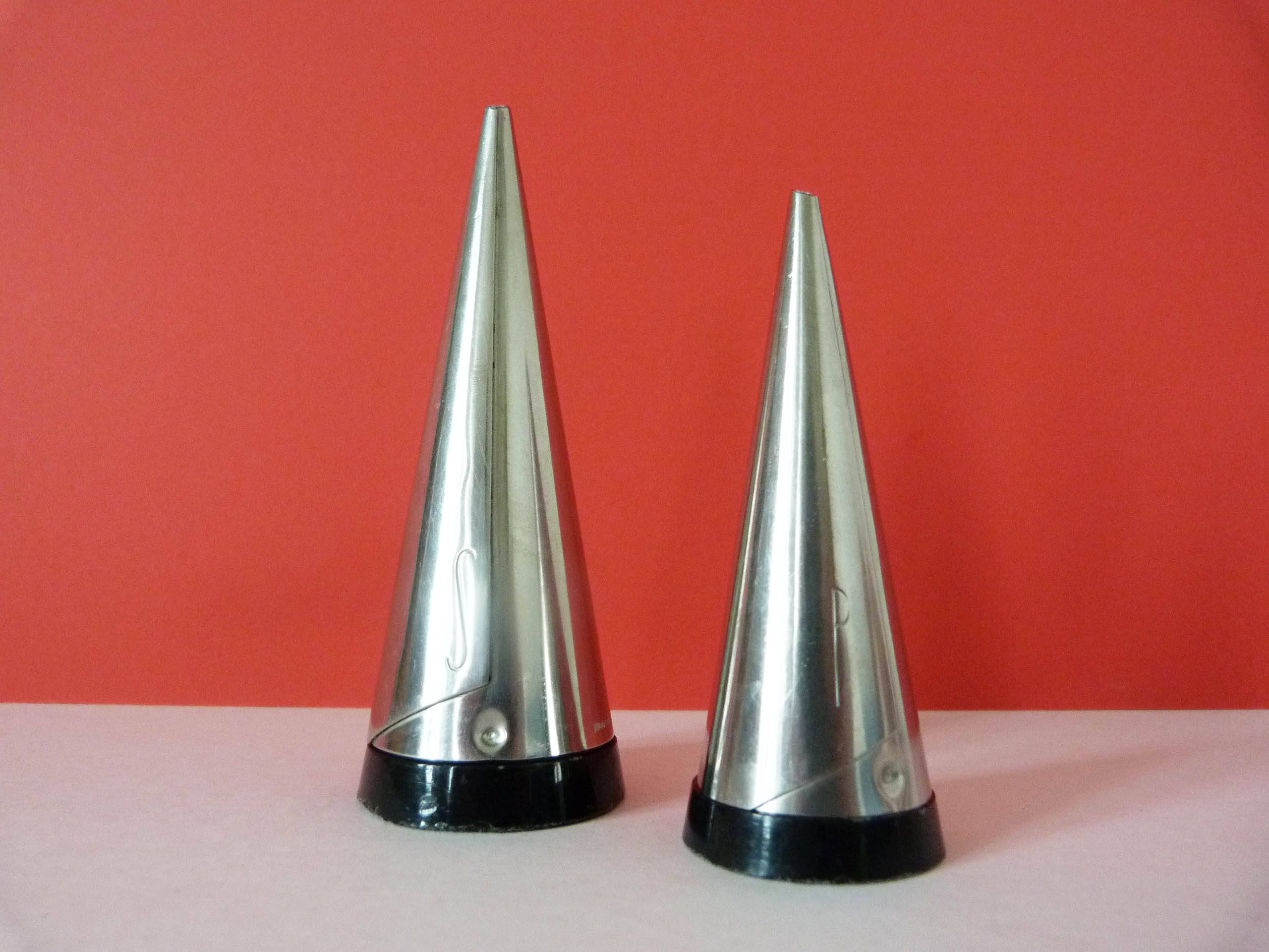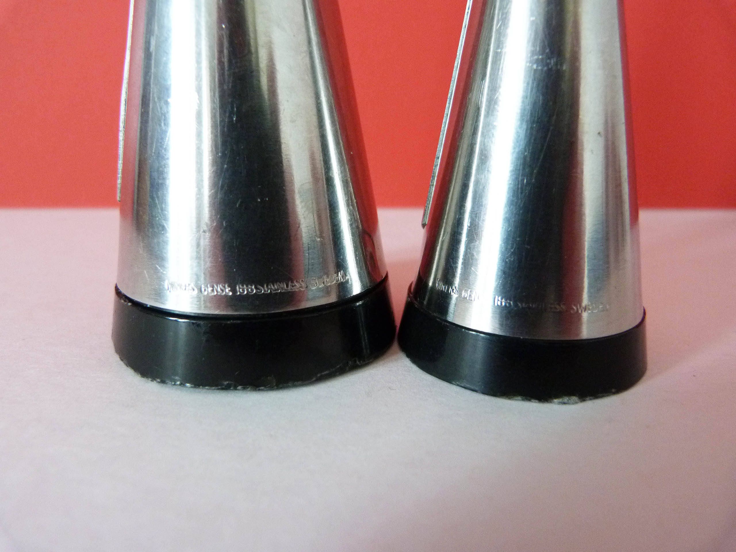 1955 18/8 stainless steel salt and pepper pots with Bakelite Bases designed by Pierre Forssell for Gense Sweden.