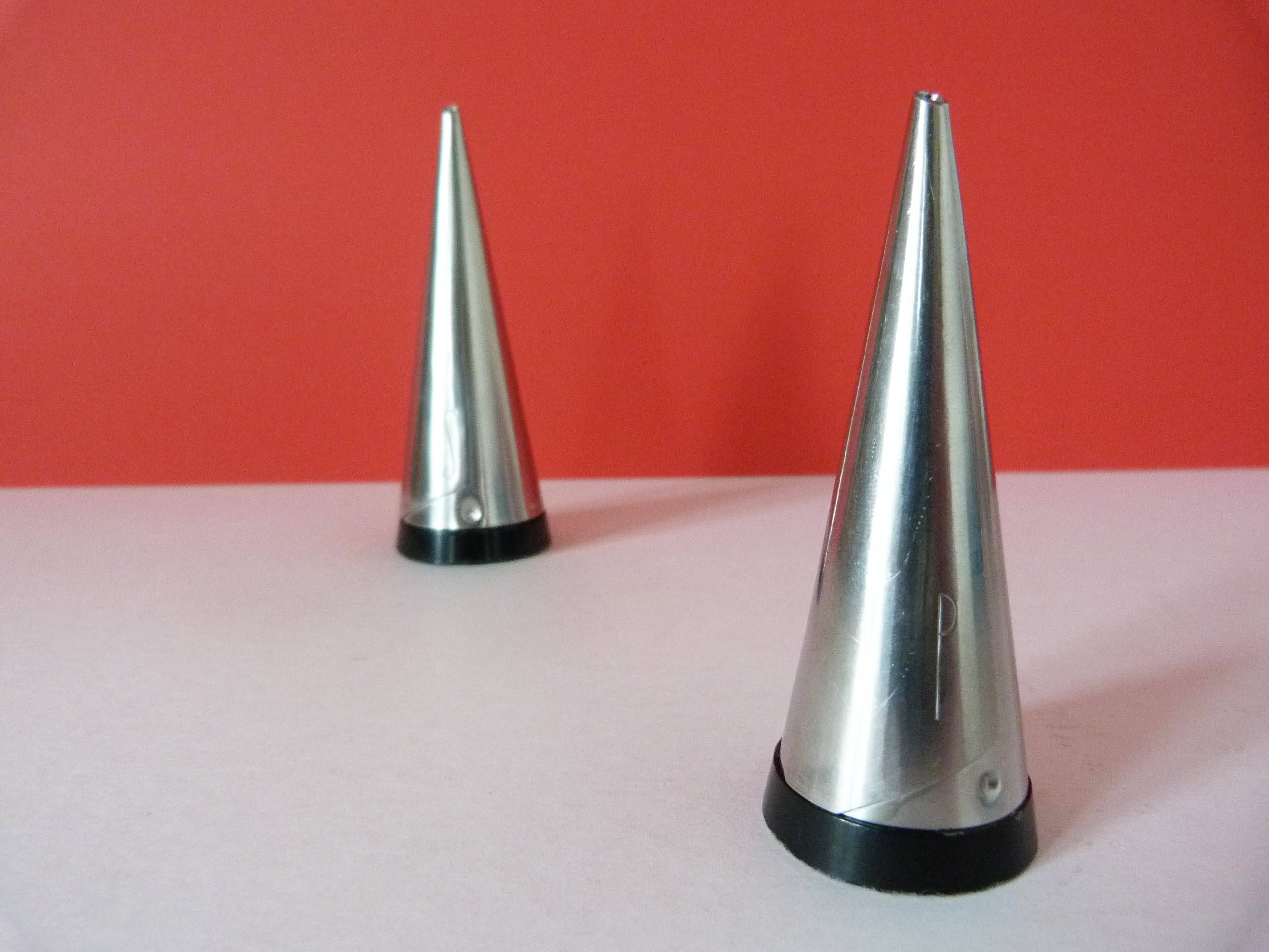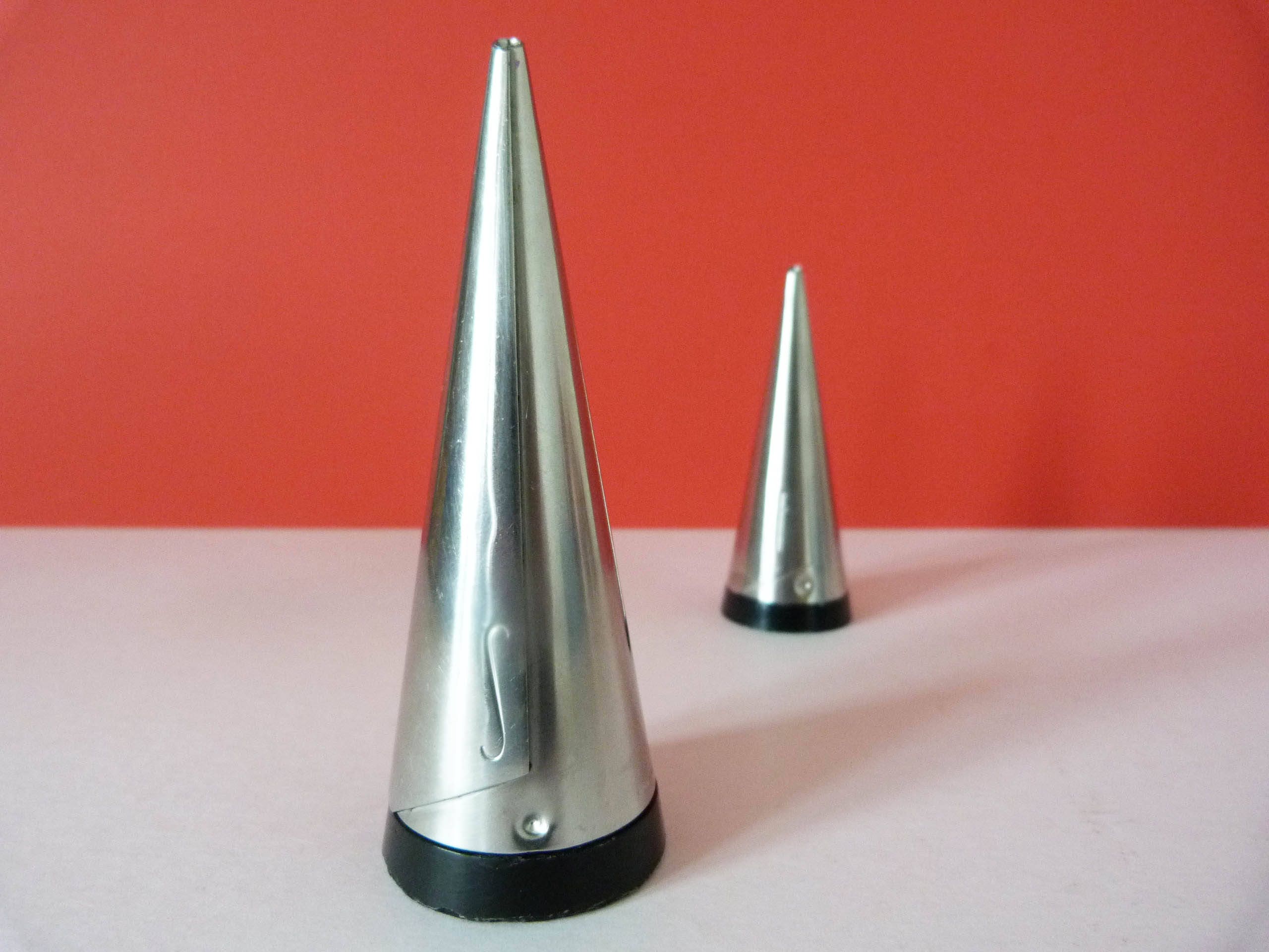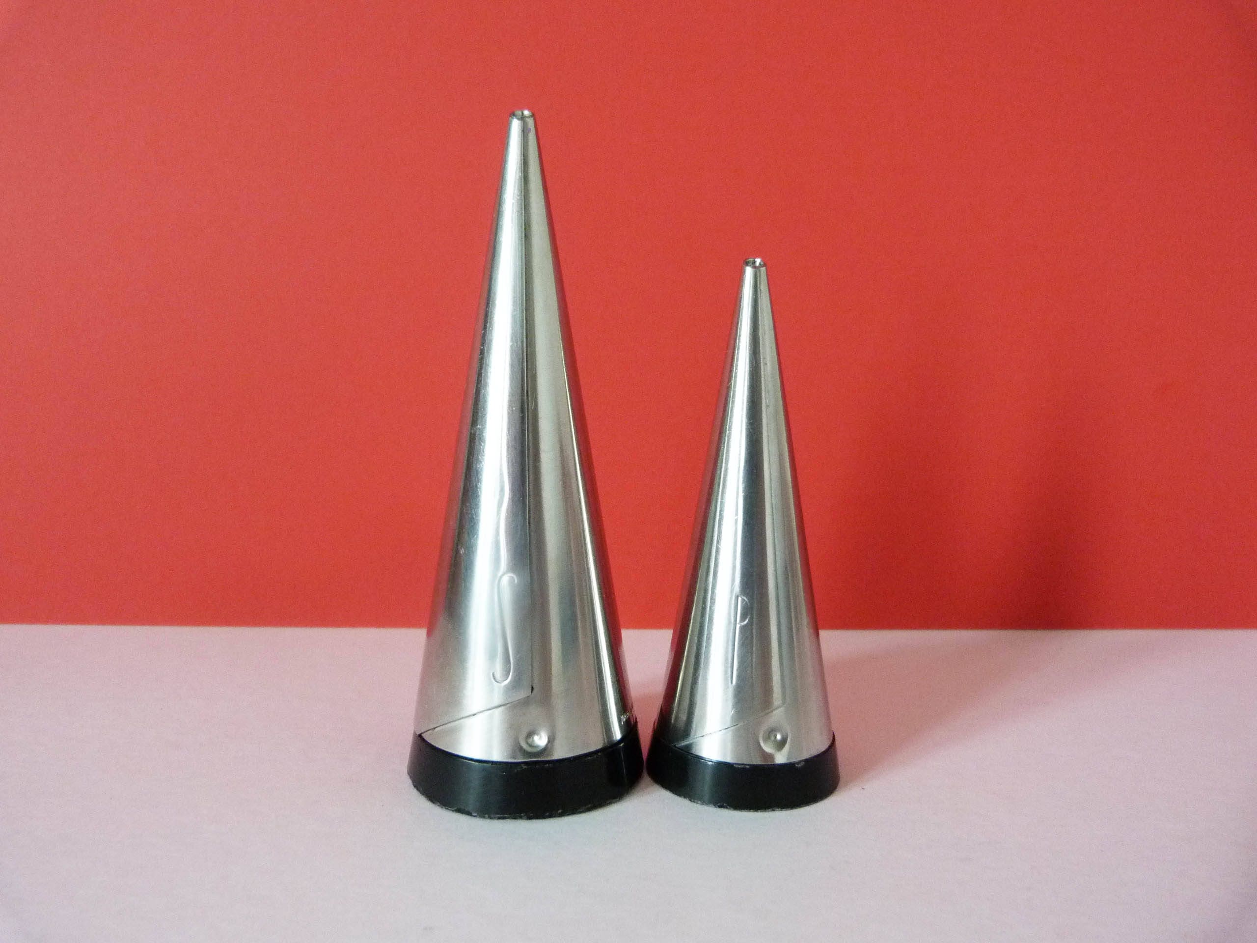 1955 18/8 stainless steel salt and pepper pots with Bakelite Bases designed by Pierre Forssell for Gense Sweden.