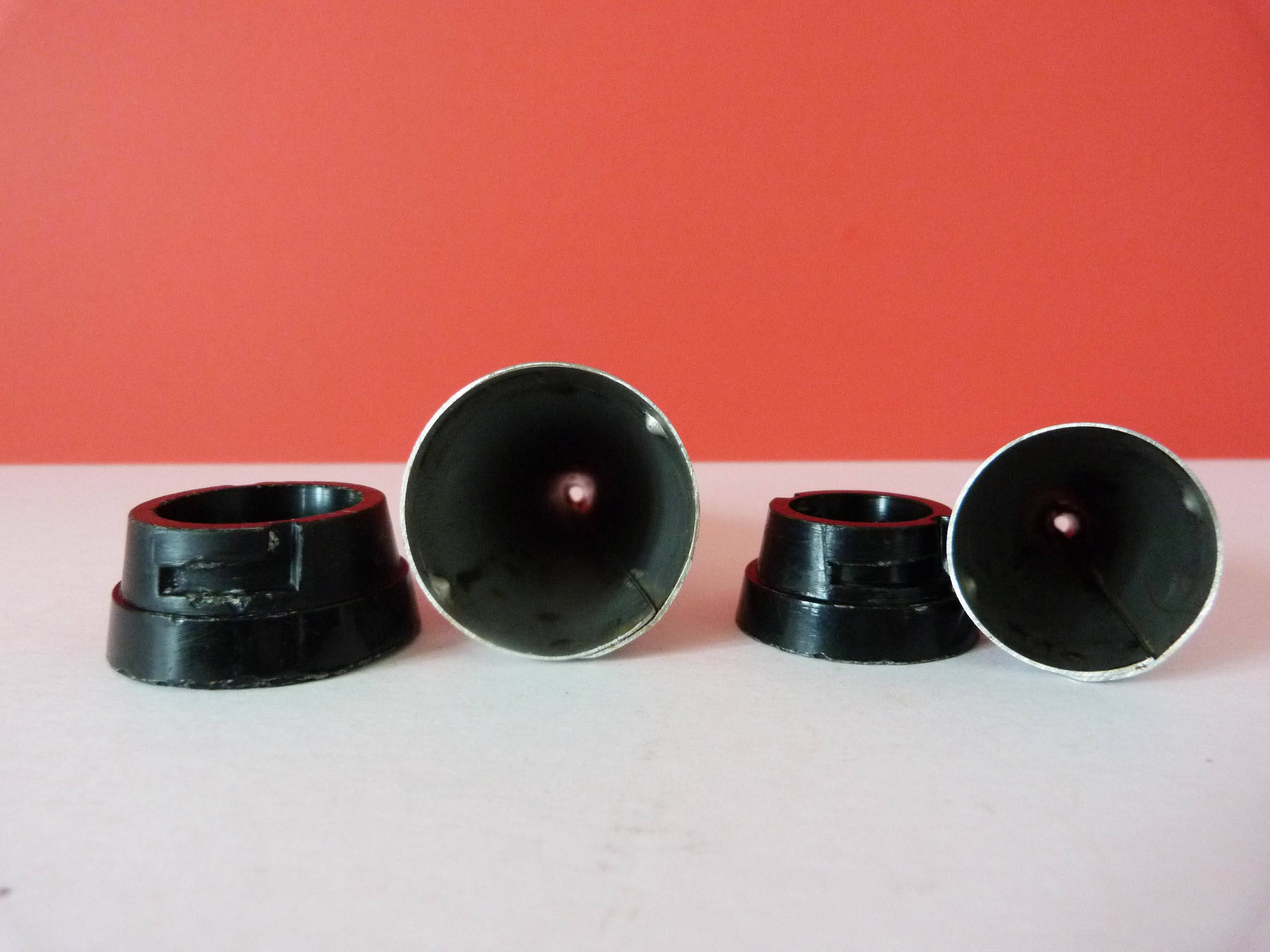 Condition is good, there is some ware to the bakelite bases, (see photos), although these are a little worn this does not affect the function of the groove and screw slots that hold the funnels to the bases.