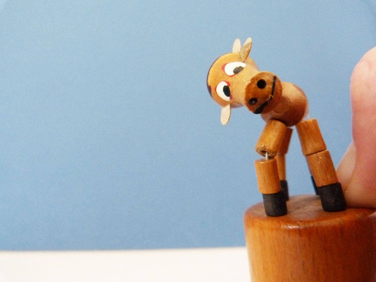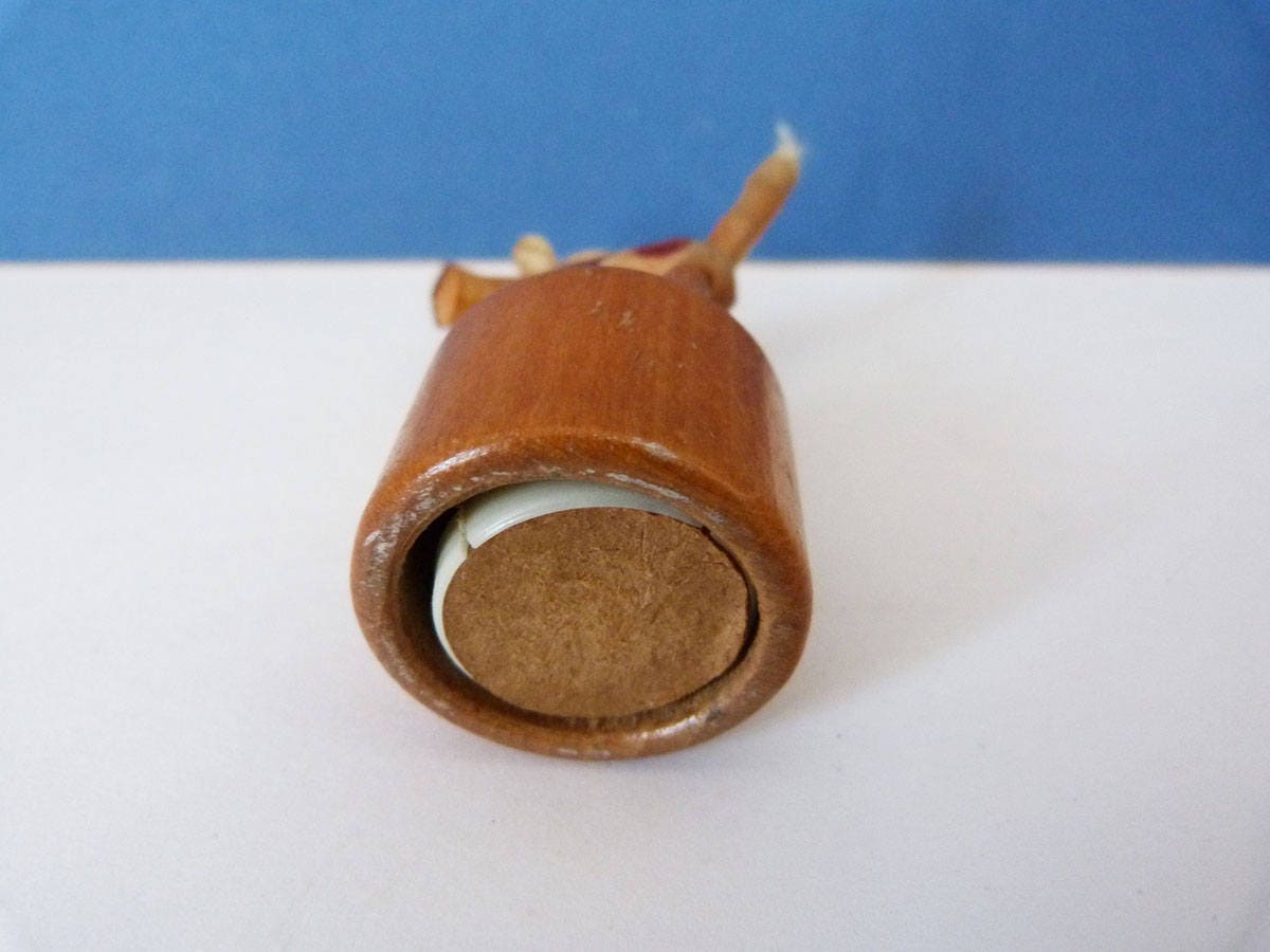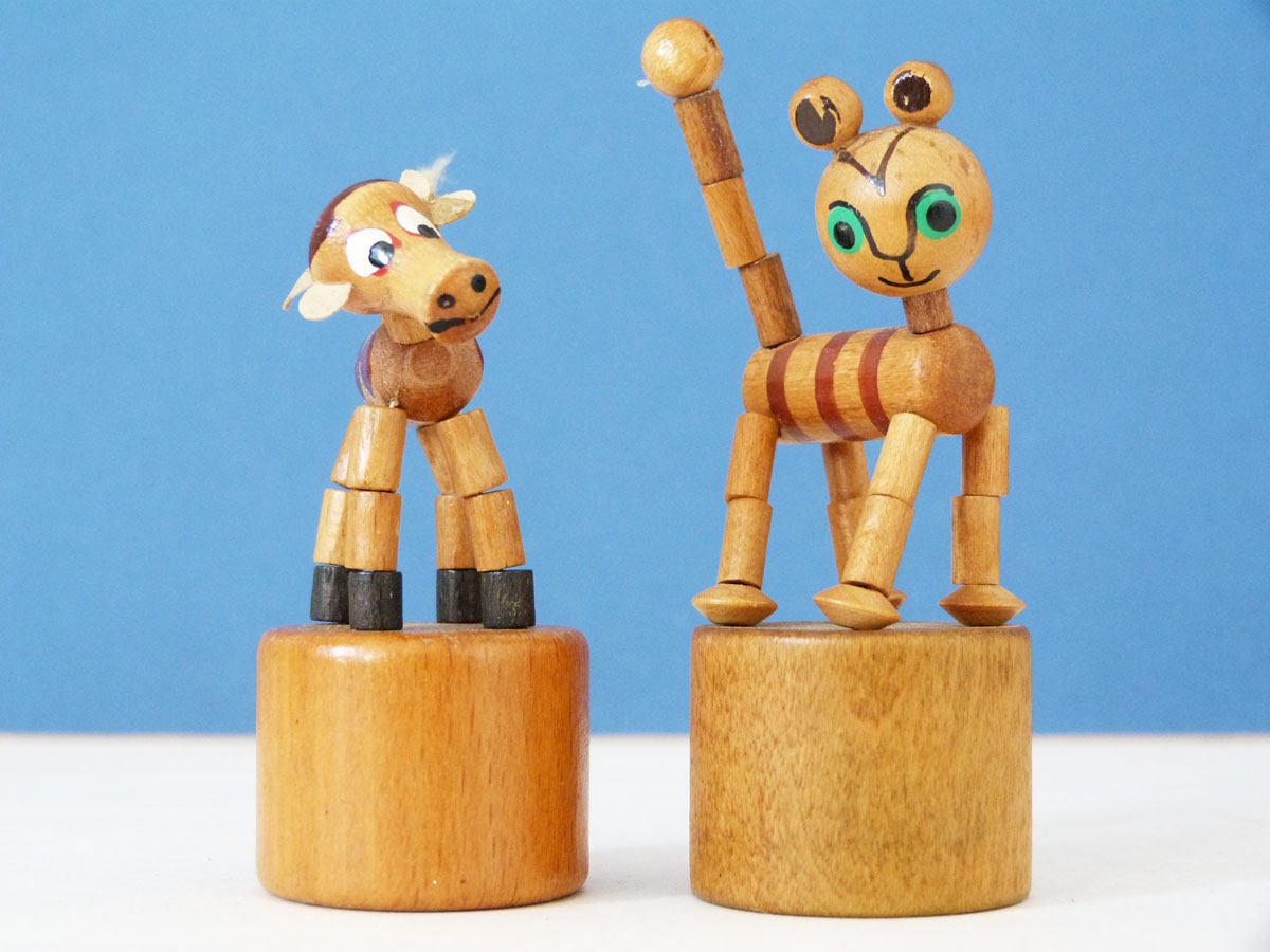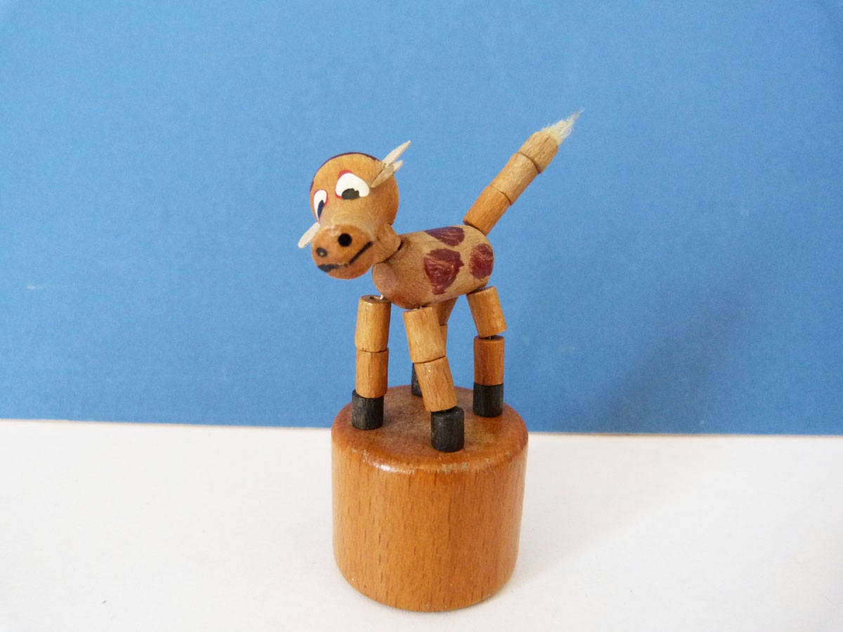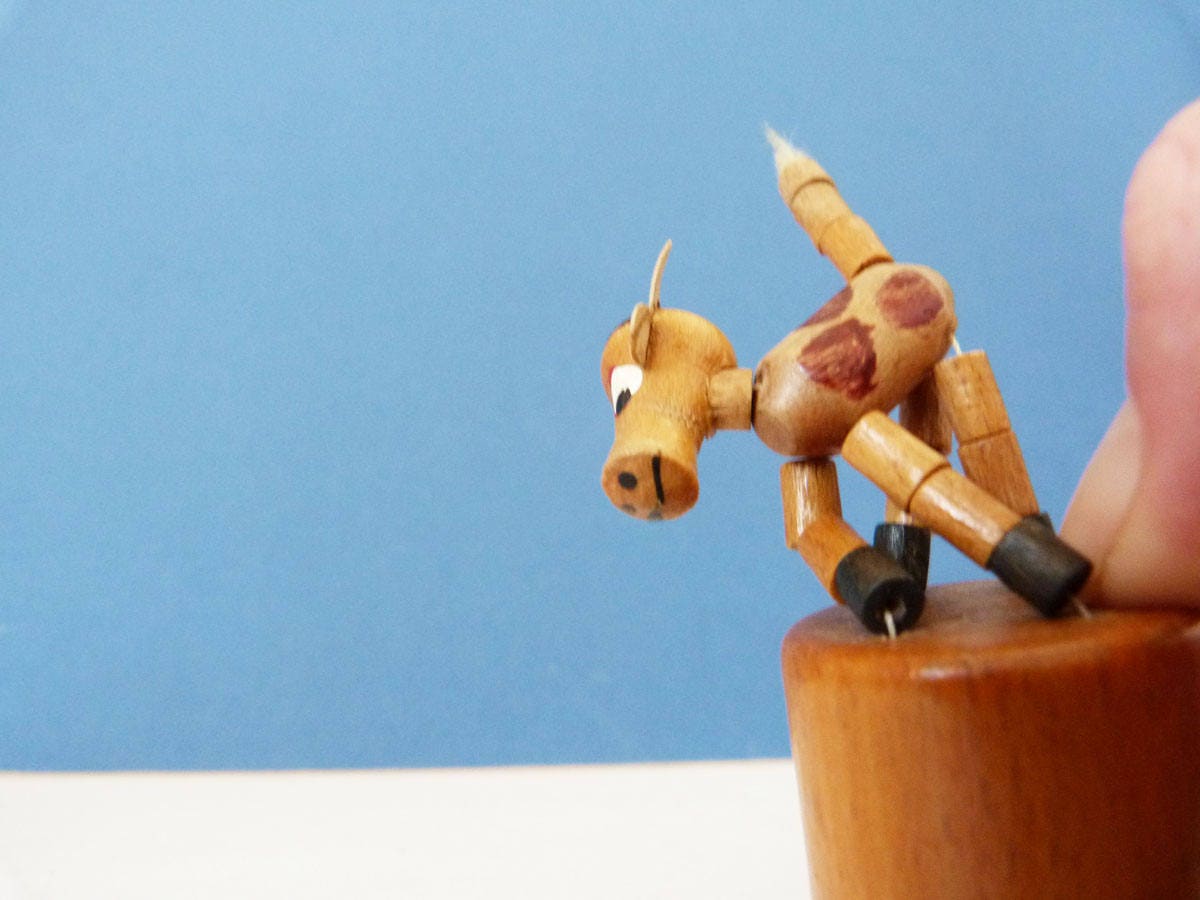 Here we have a highly collectable push button collapsing wooden cow, this one really is delightful, the little cow is made entirely from wood, inside there is a little plastic disc where you press the button. Its rare to see one in such good condition and still in full working order, although I must say taking the photos to show this was difficult one handed. The little toy stands 7cm tall, unlike the cat one I am selling this one doesn't have a maker's mark to the base, I estimate he was created in the early 1960's.