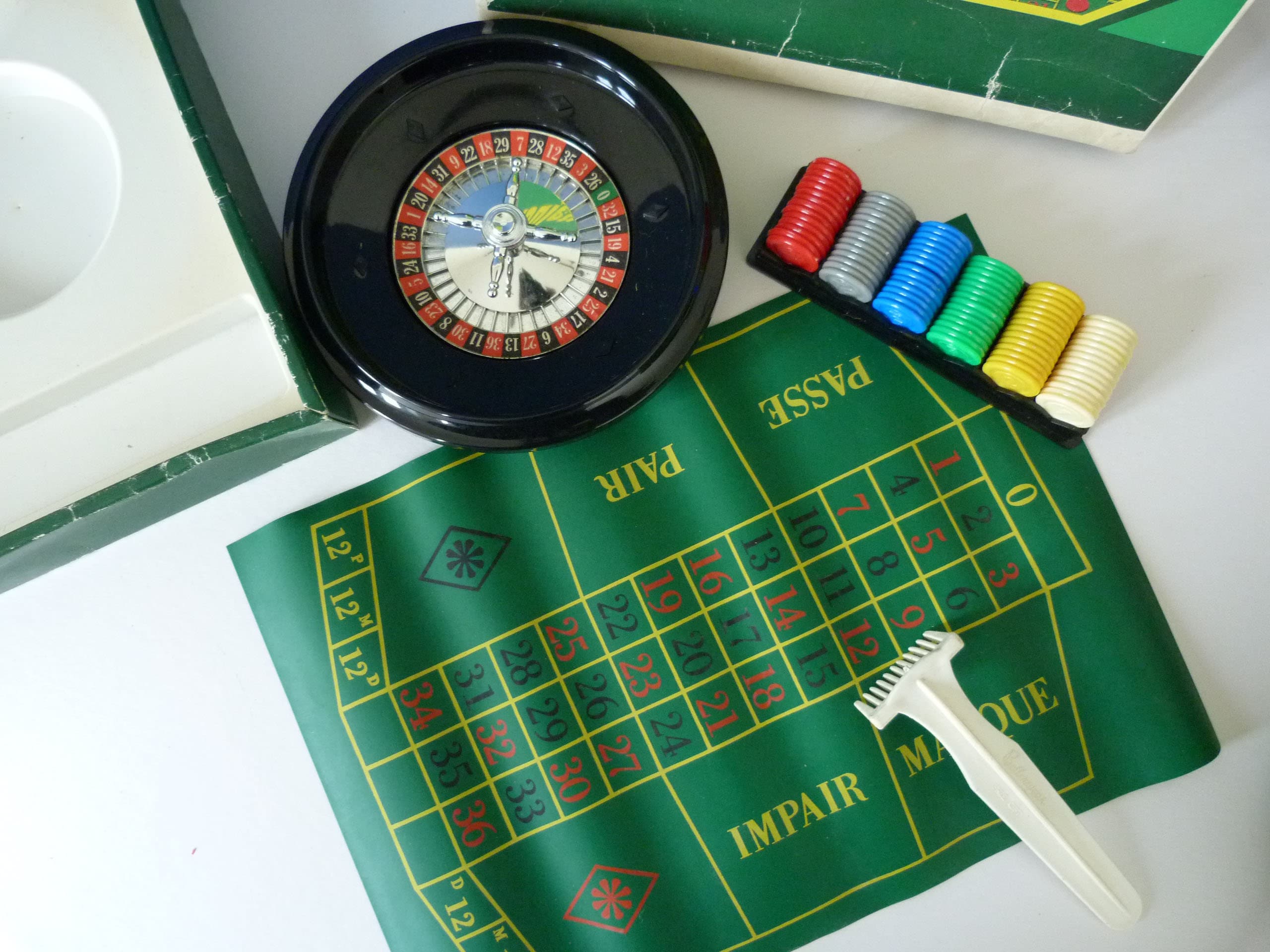 A wonderful game of Roulette complete with plastic wheel, chips, vinyl mat, rake, ball and instruction in French, English and German. The game is in excellent condition, perfect for bringing out for table top playing at any occasion, also small enough to travel with.