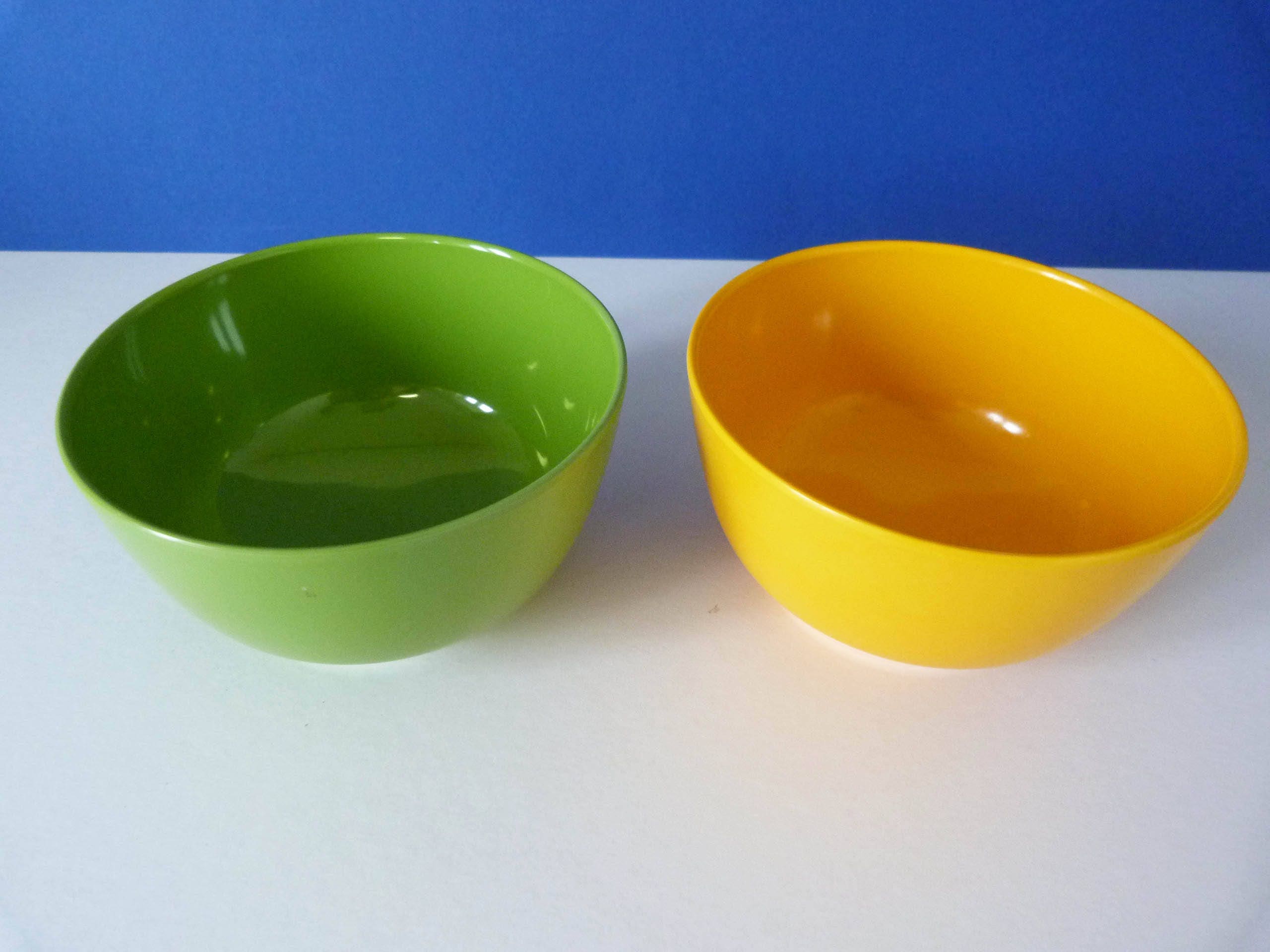 2 vintage melamine bowls created by ROSTI / Mepal, made in Copenhagen Denmark. The bowls both have light signs of use to the insides. I would describe the size of these lovely bowls as small cereal size, as they are made from melamine they are not suitable for the microwave.