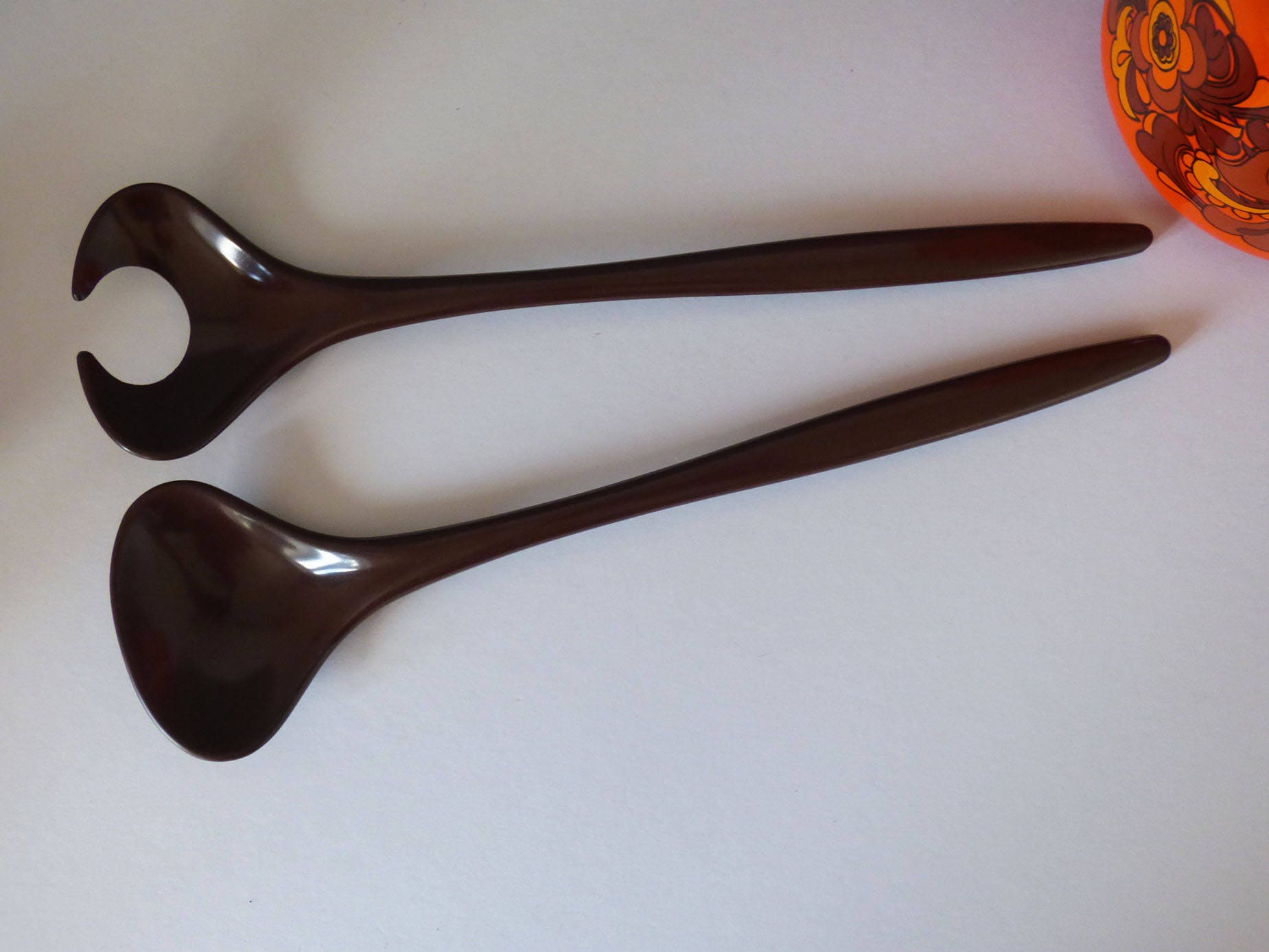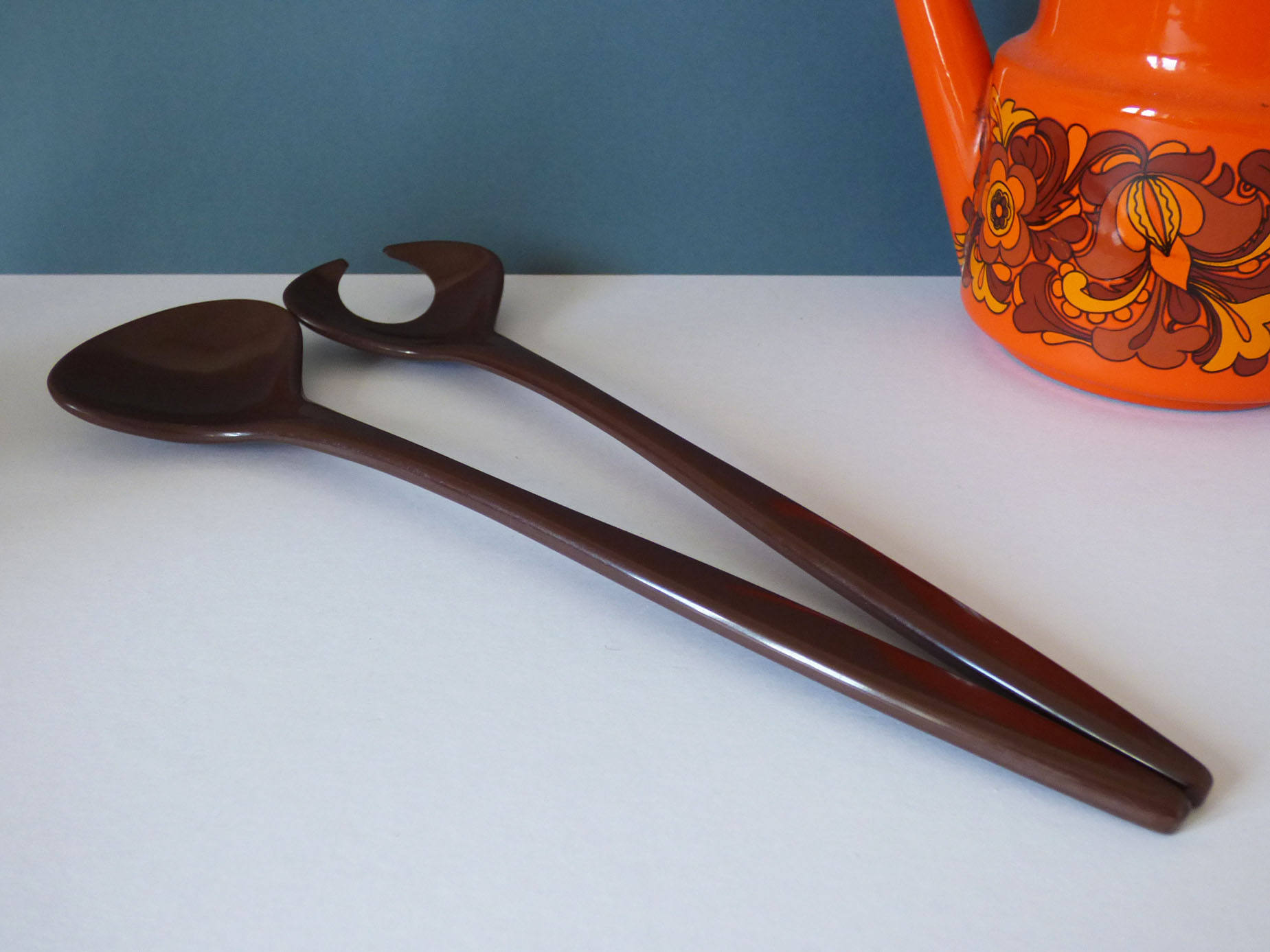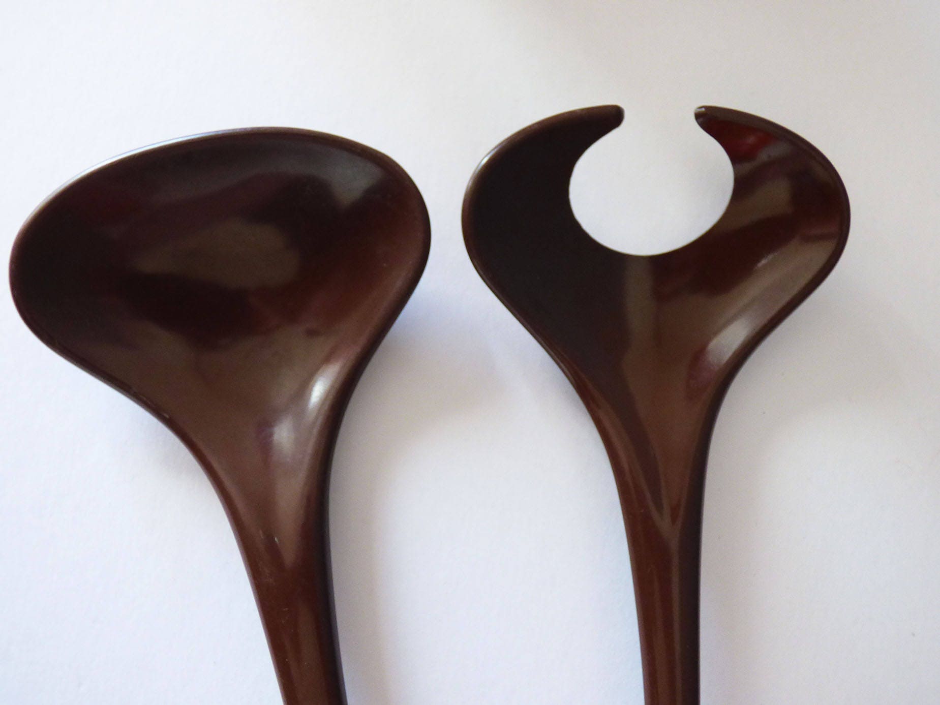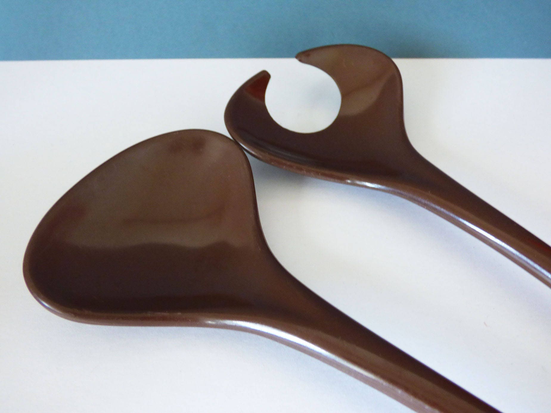 Lovely original salad servers from Denmark, Created by Rosti Mepal from brown melamine plastic.
