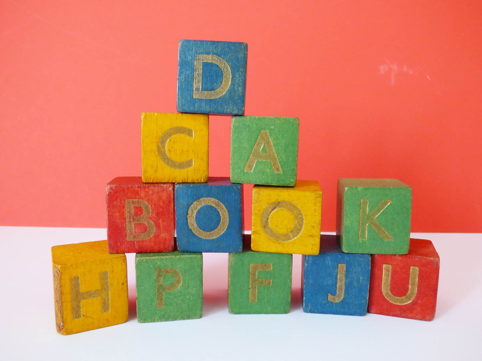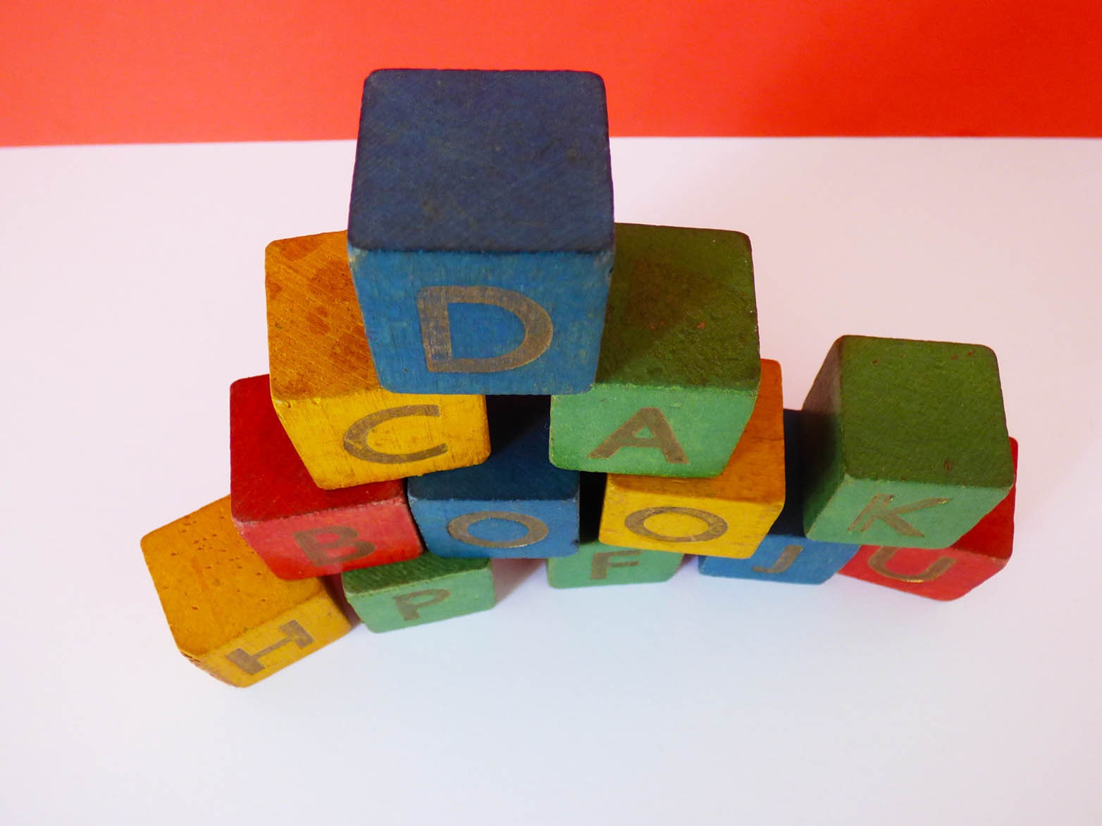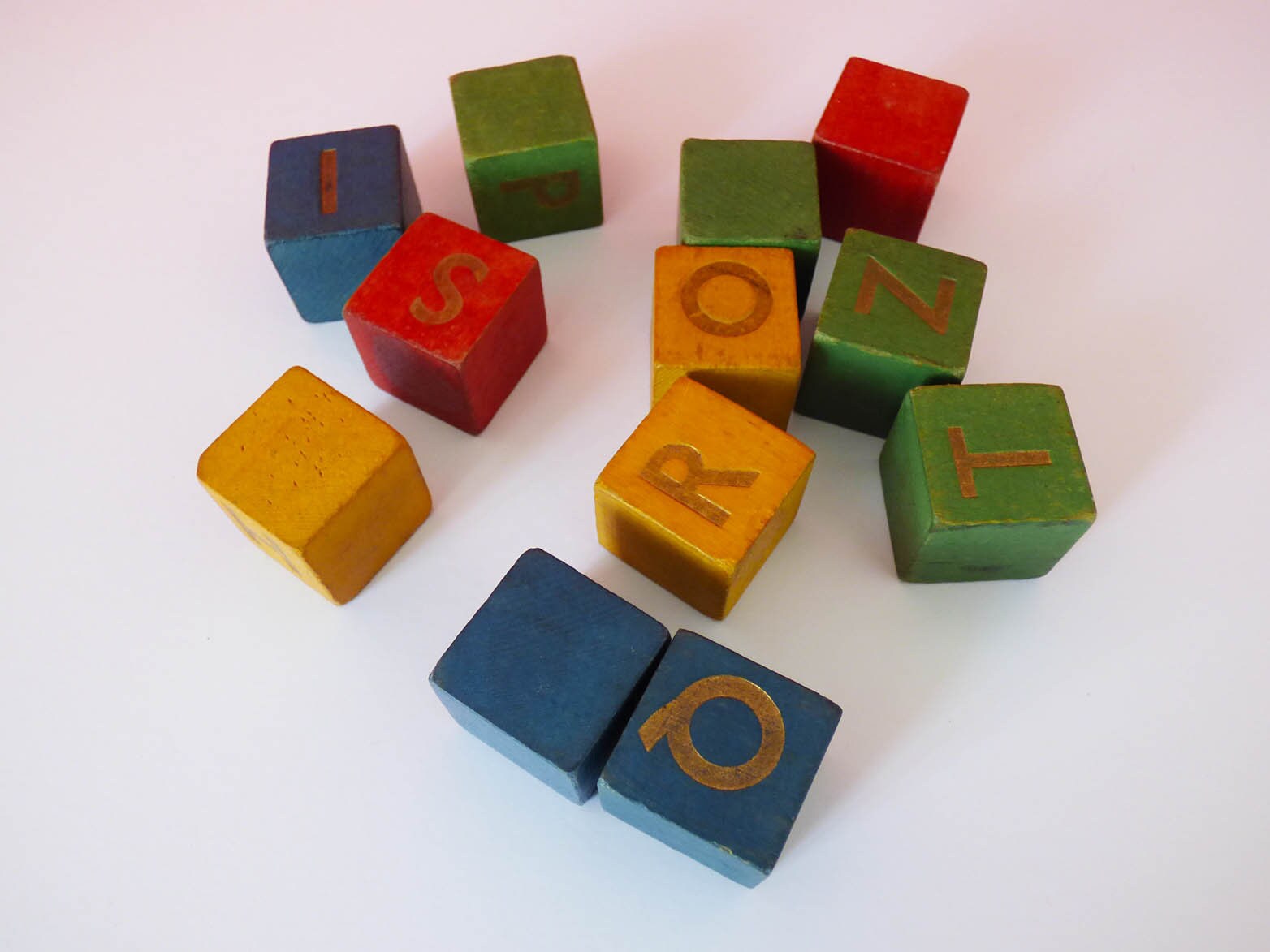 Lovely set of 12 wooden building cubes, each printed with a letter, on just two of the sides, the letters are as follows,