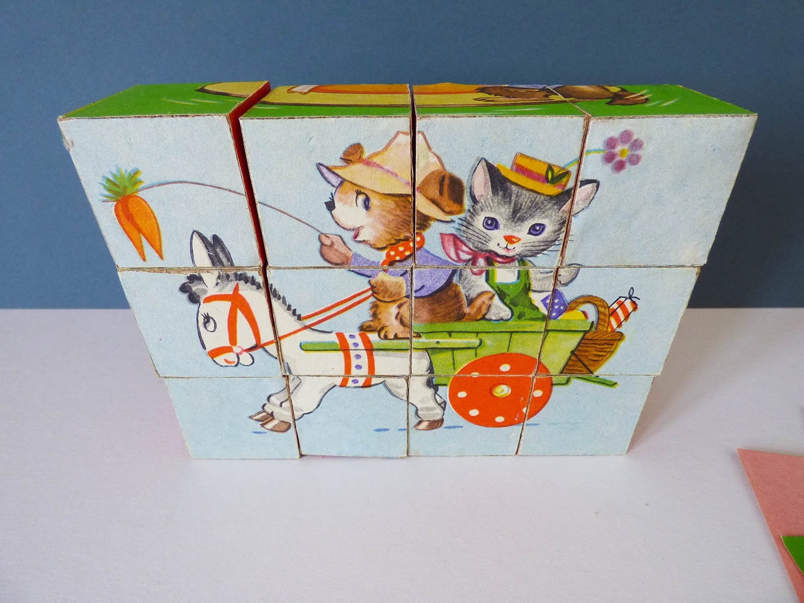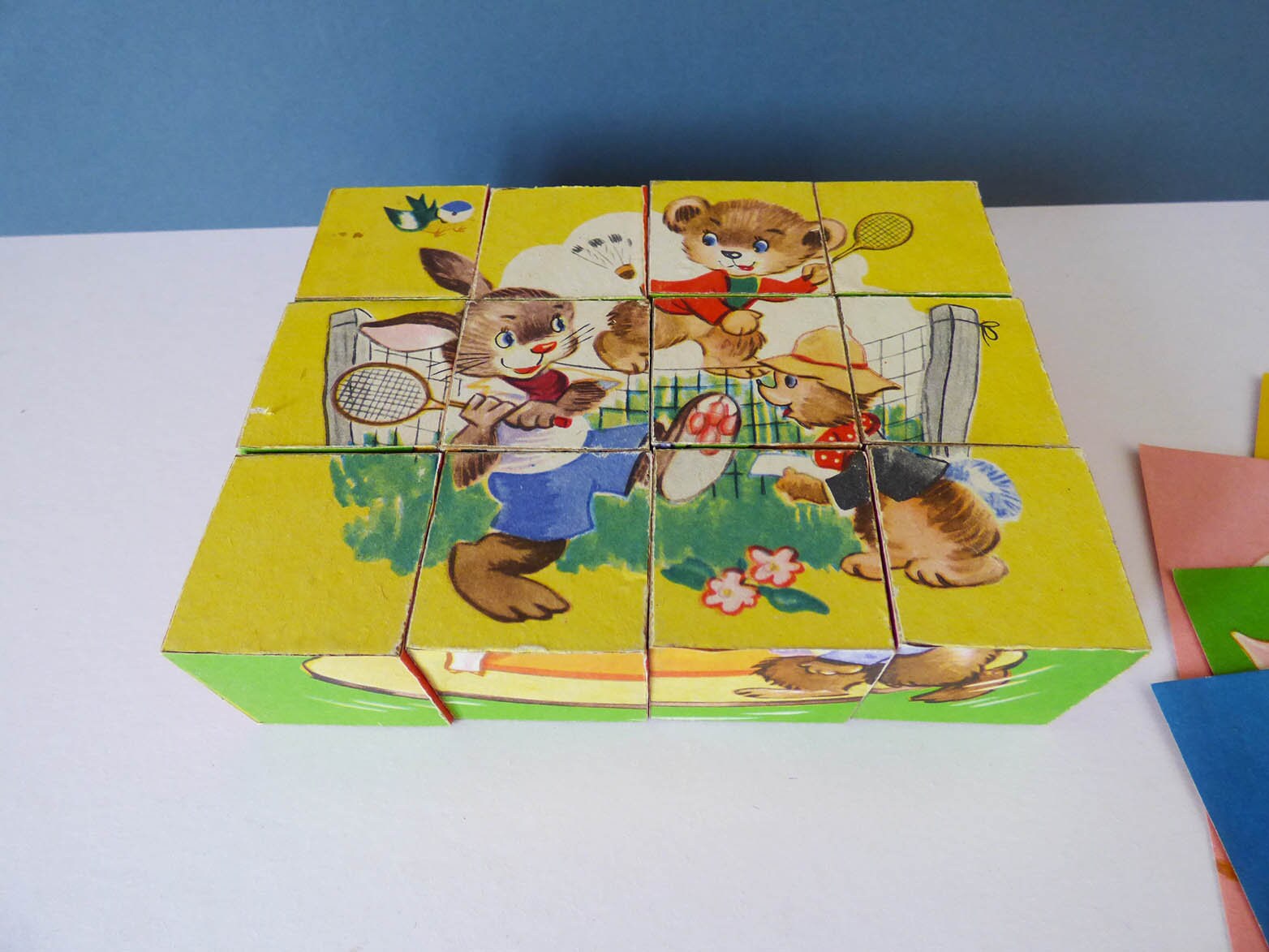 Although wooden the blocks are actually covered with paper and the set comes complete with 6 pictures so you can make each of the pictures featured.