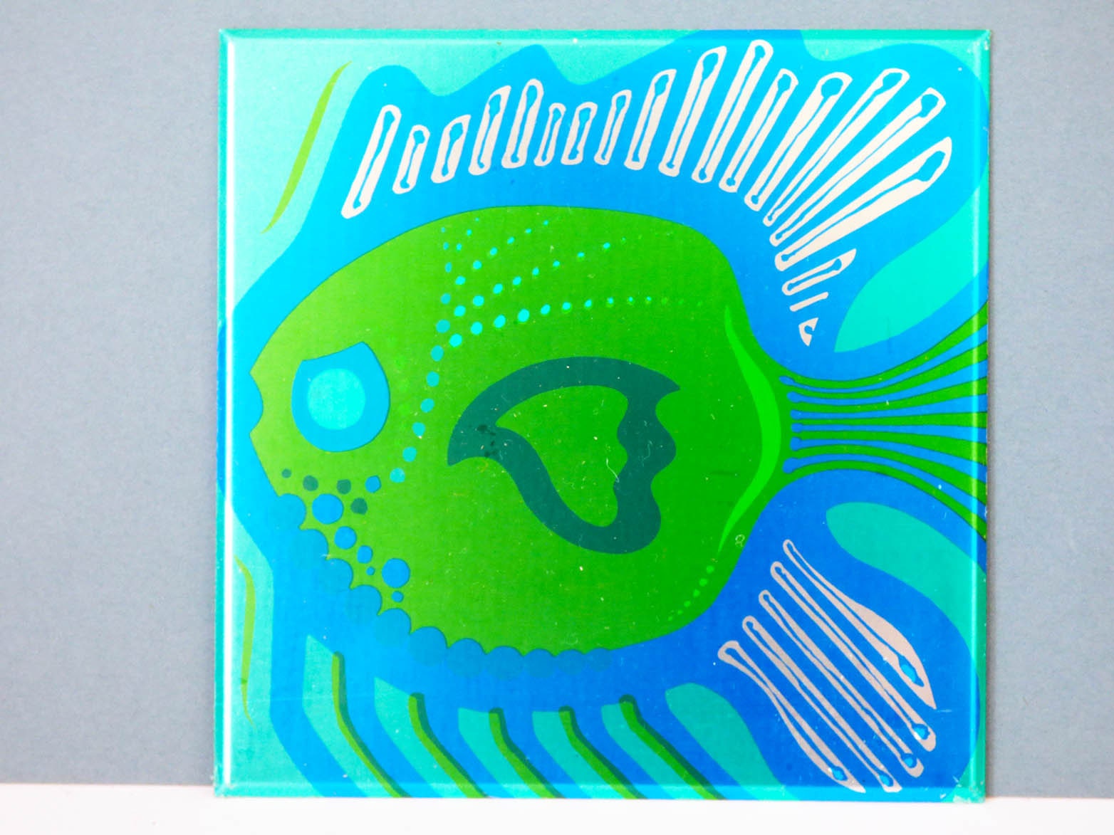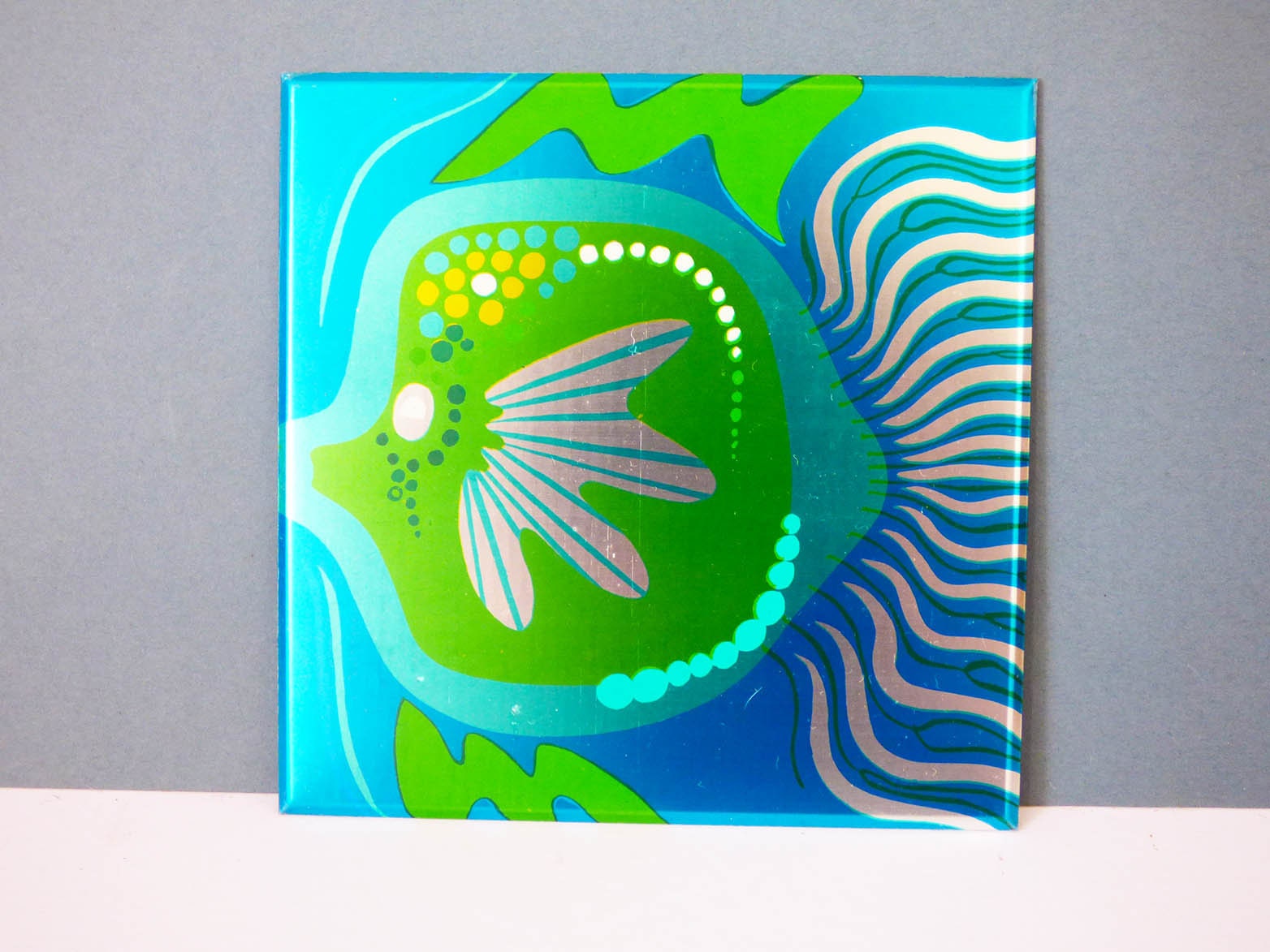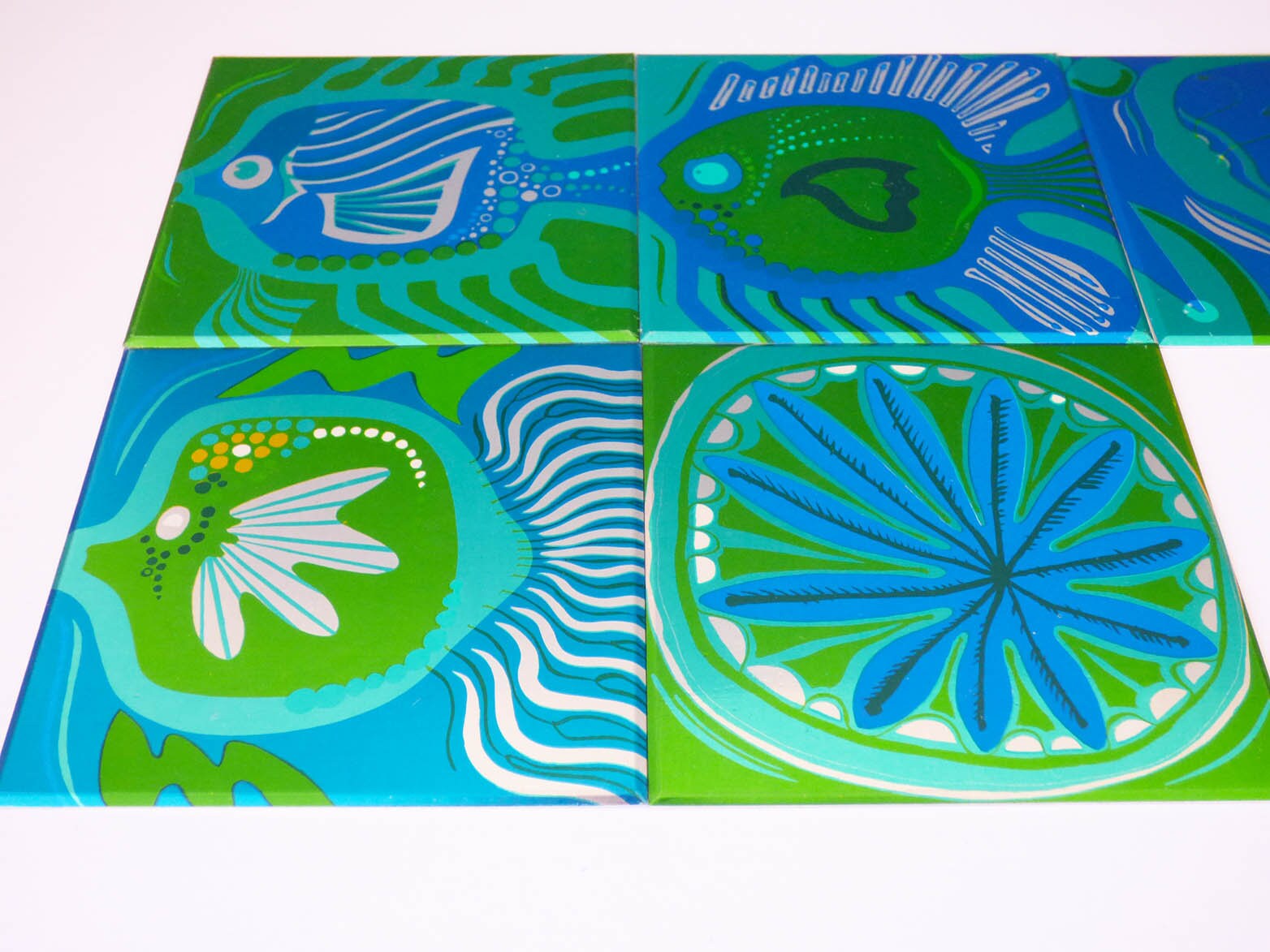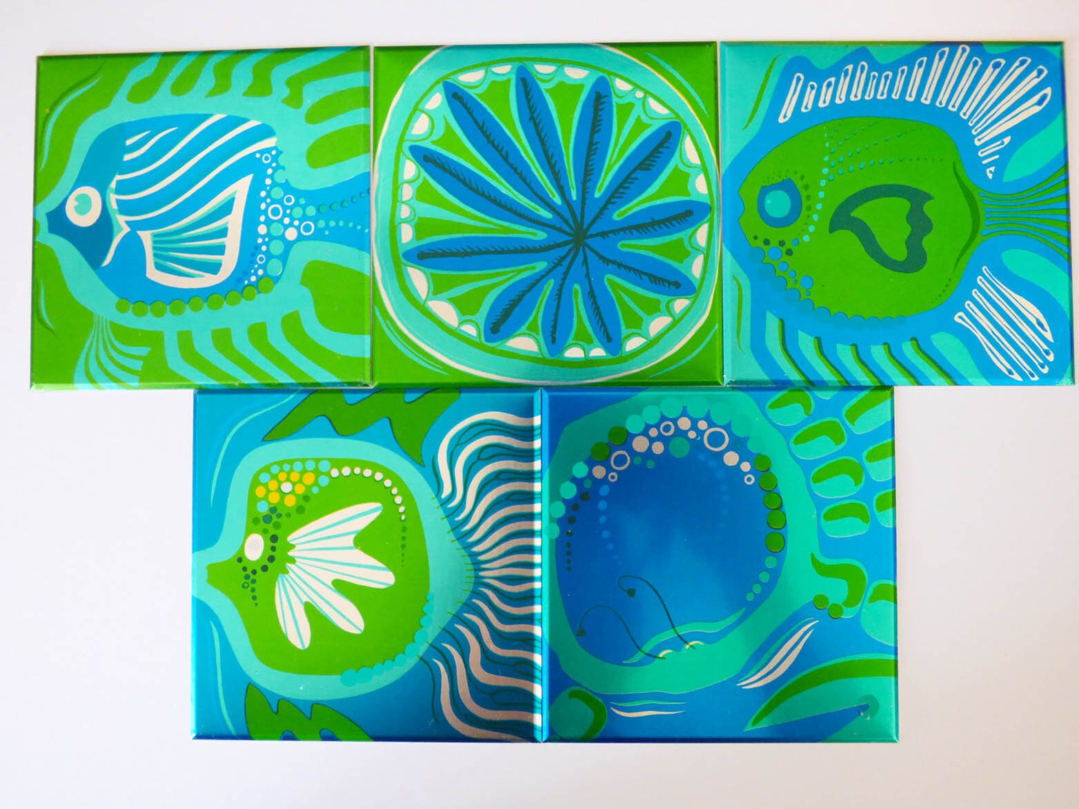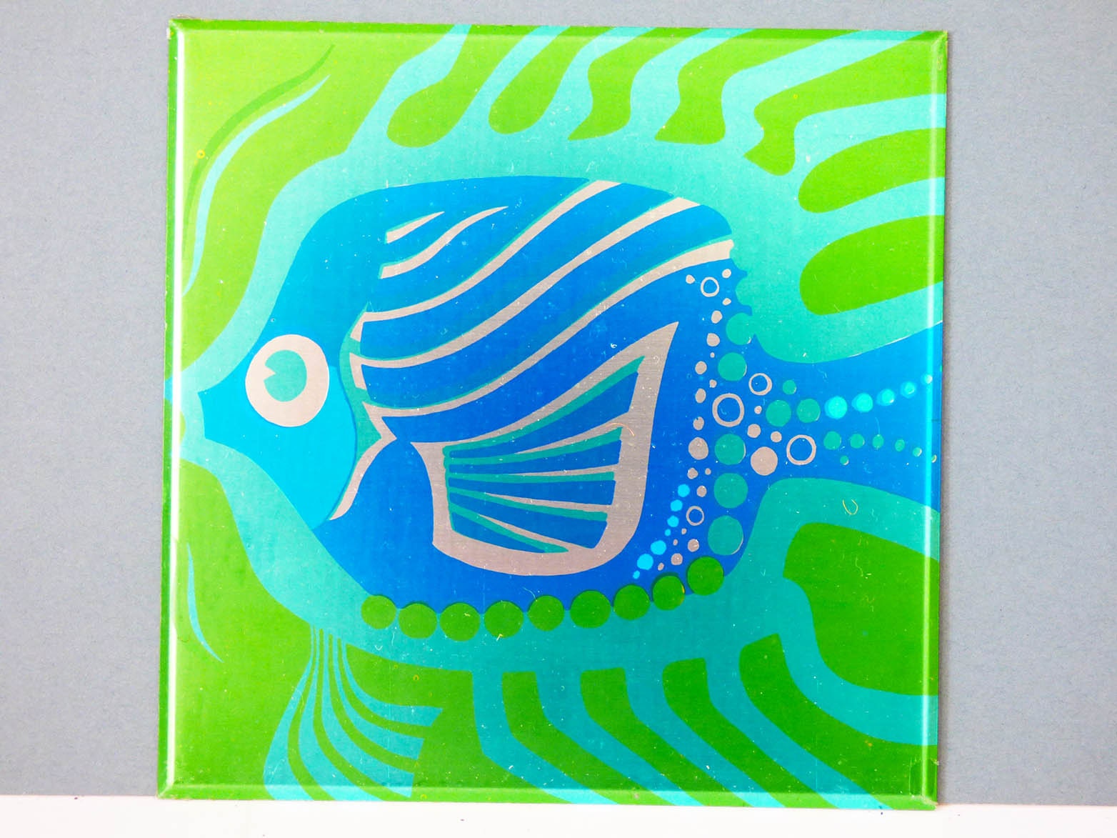 A set of 5 Aluminium tile covers, straight from the 1970's, these fit directly of the top of your old tiles, for a professional look. The covers are made from Aluminium and fit snuggly on to your existing tiles, you will need some sticky pads to fit them, as the original ones which came with these had dried up from age. Each tile cover has an anodised illustration of a fish, apart from one which is a sea plant. Please be aware the tiles have been photographed with their protective film on, so they are actually even more bright and shiny once this has been removed, you can see the film clearly in the last photo.