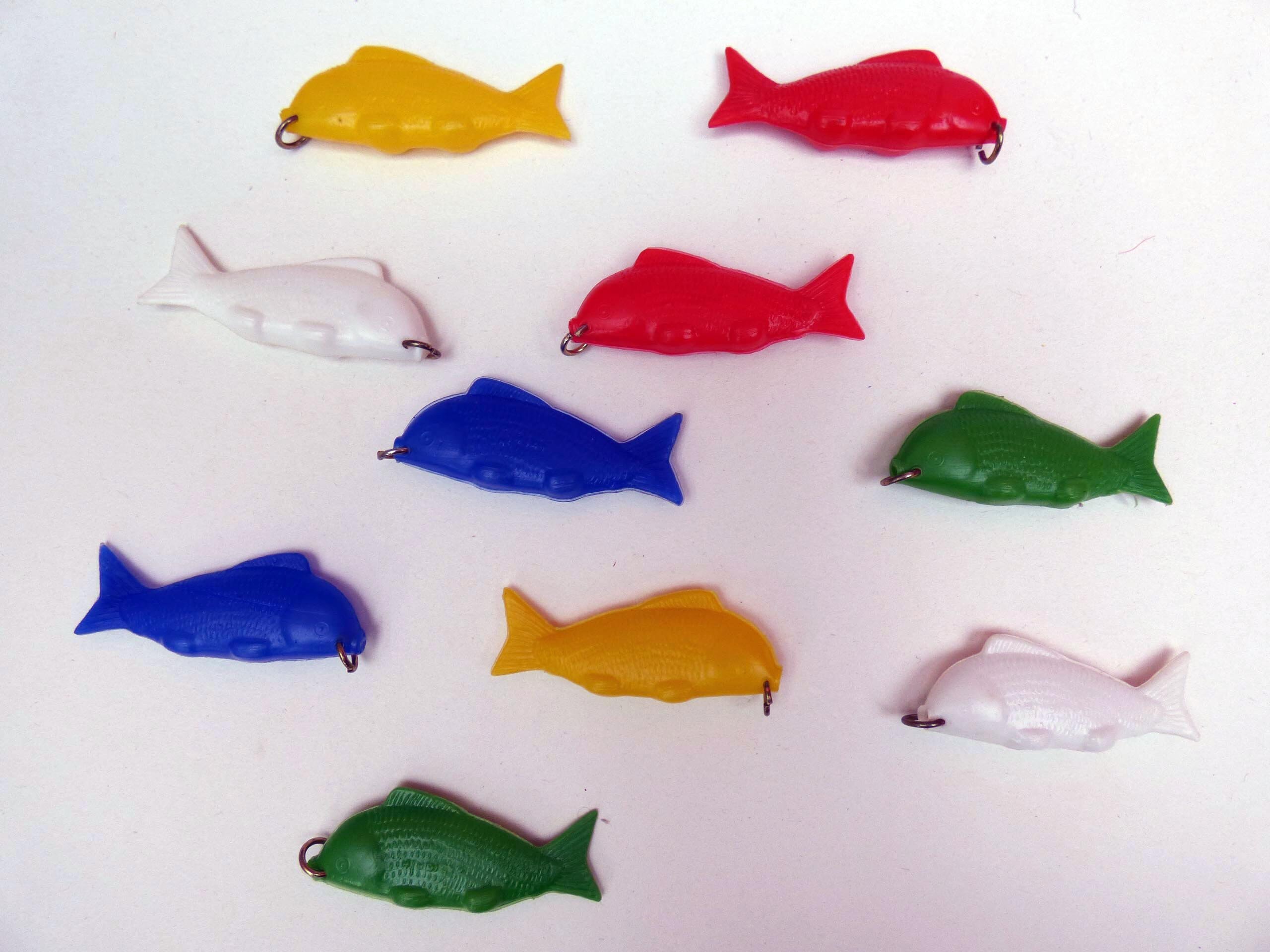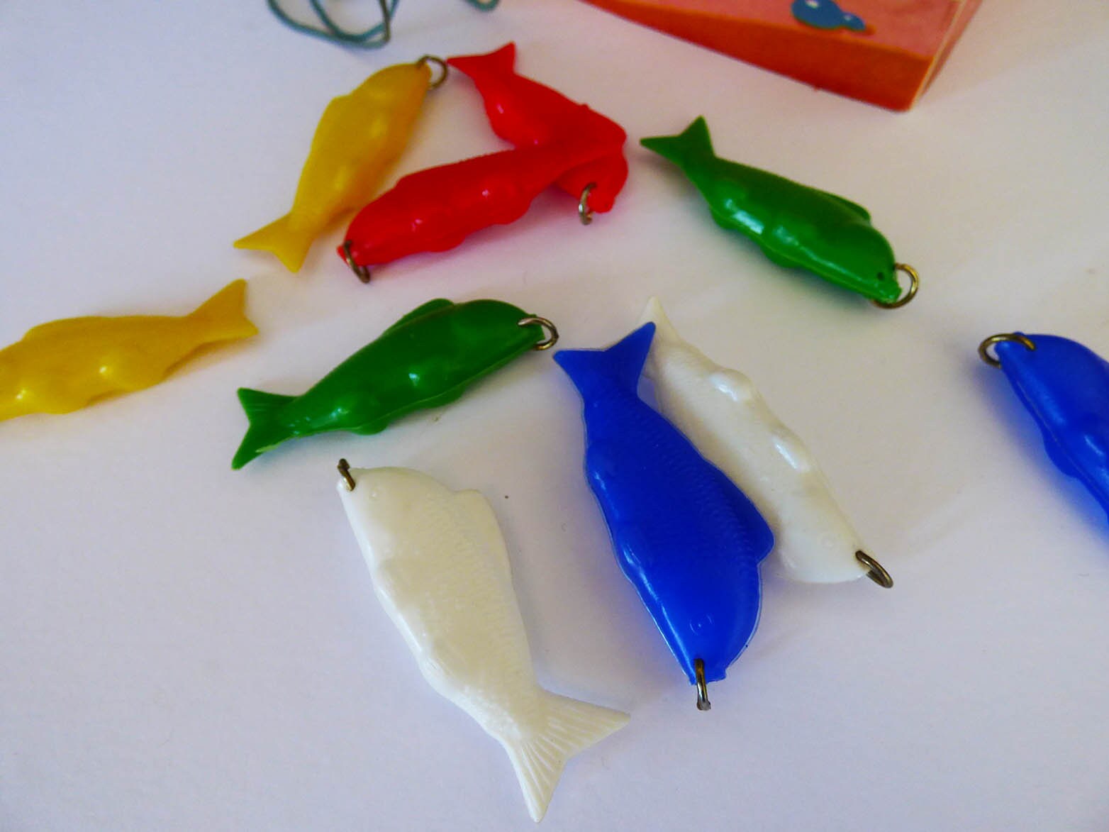 A wonderful game of magnetic fishing, a classic if you wish to relive your childhood with your own kids. Often the simplest games are the most fun, and encourage children to come up with there own free play games. The game was made in the early 1970s by British company Spears games of Middlesex, and consists of 10 plastic fish, the cardboard pond, and 4 wooden fishing rods, with magnets attached to the end to catch the fish, all the pieces are there, but one fishing rod is missing its magnet.