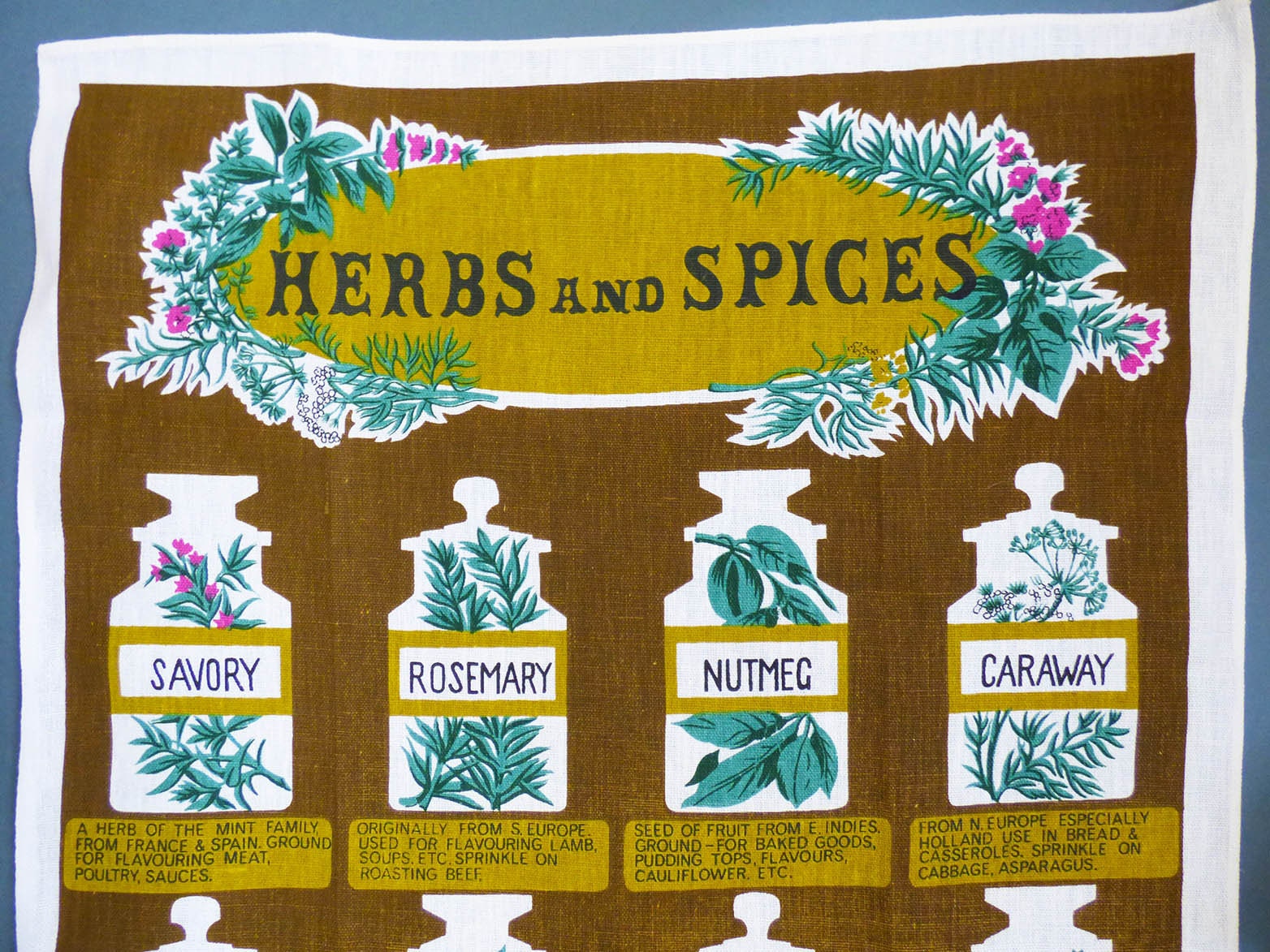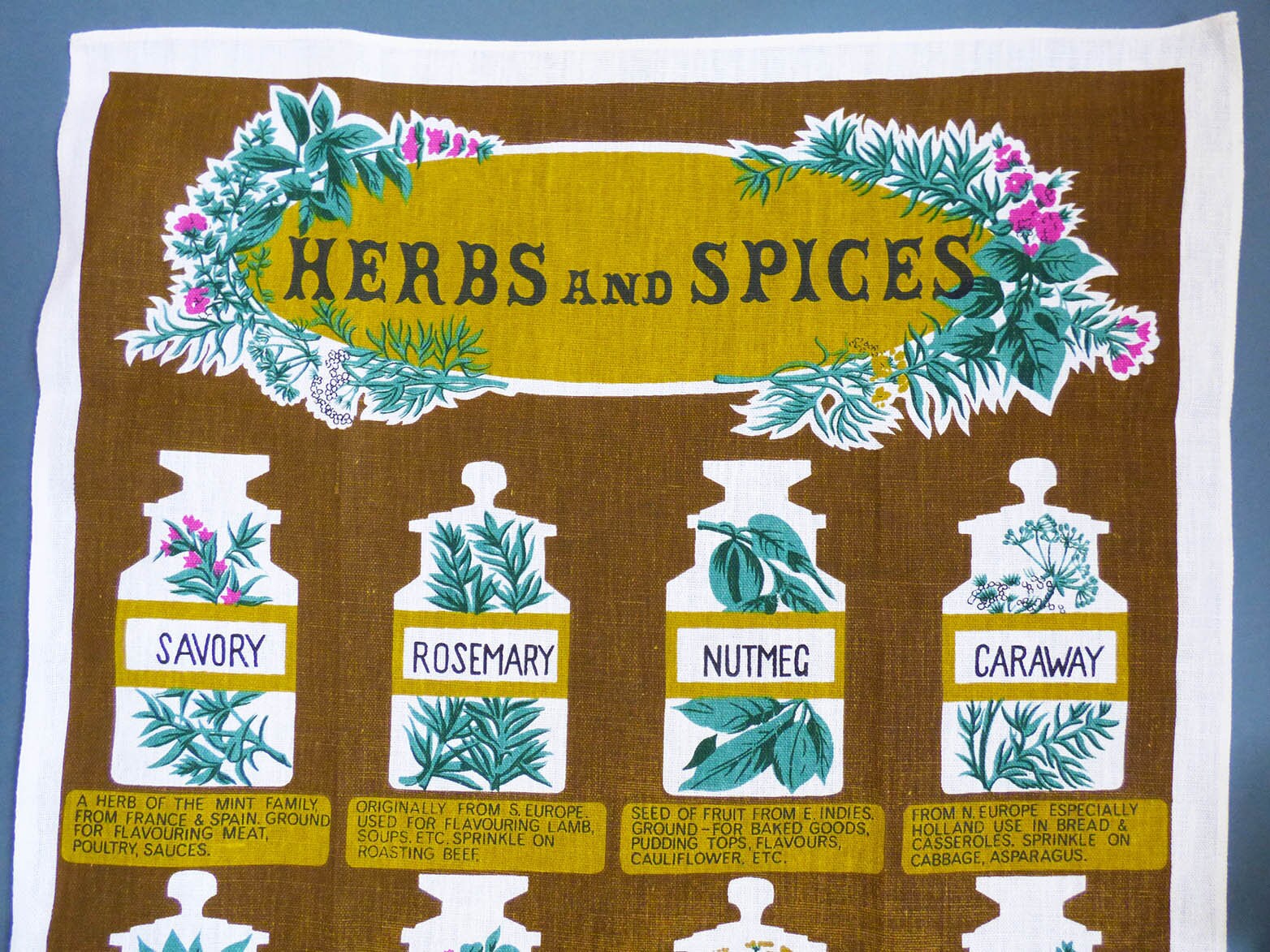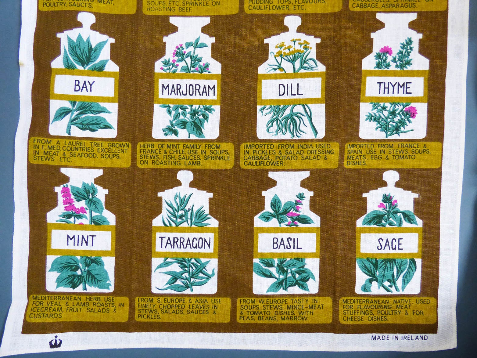 Beautiful large linen tea towel made by Ulster of Ireland, Entitled Herbs and spices, it depicts many herbs and spices with a brief description of each one, this is an absolute classic, we love it.