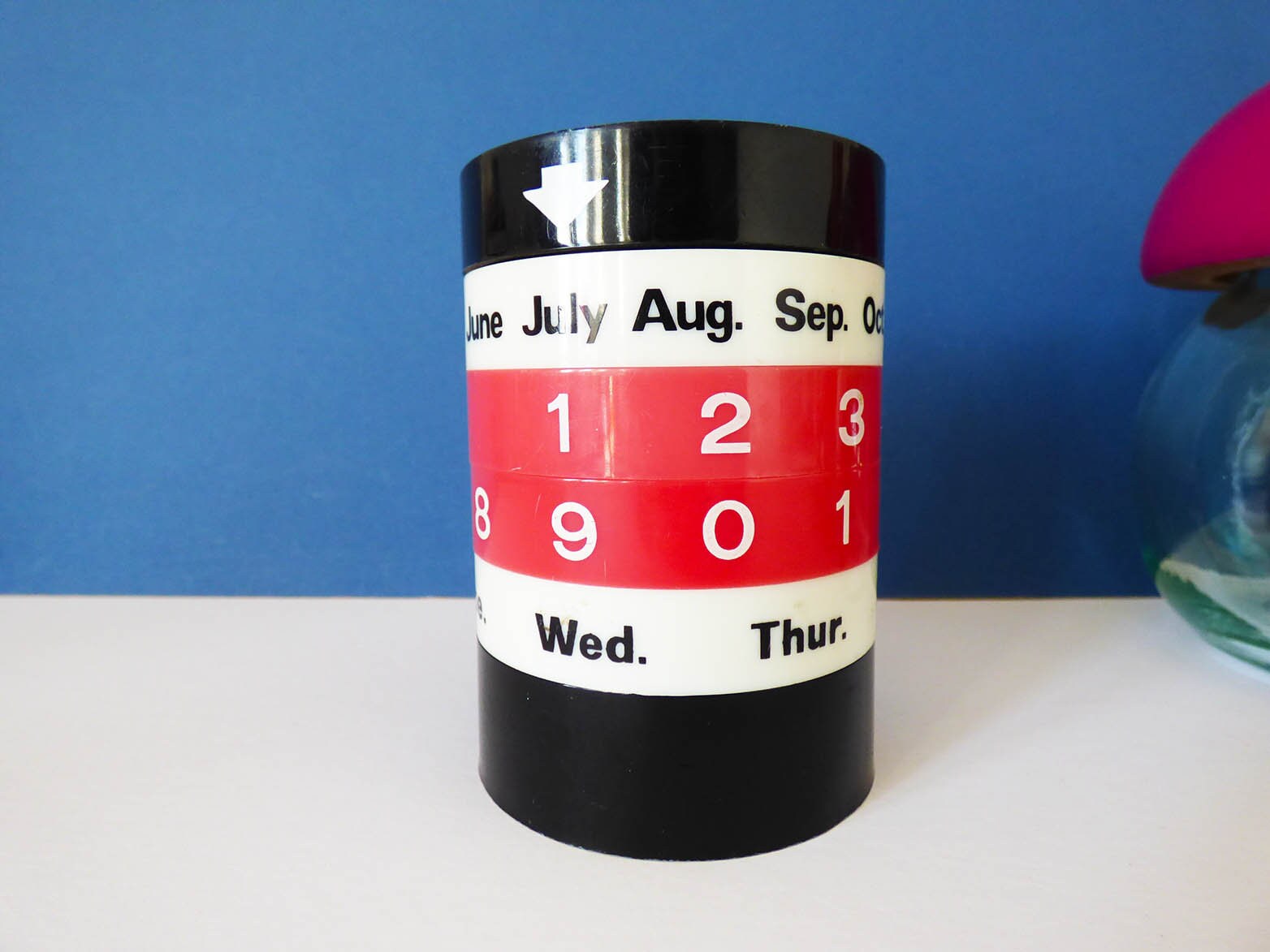Vintage super stylish 1970's perpetual calendar produced in black white and faded red coloured plastic. The calendar has its four rings which can be turned to the appropriate, day, date and month, and then moved each day. the calendar has the added bonus of being a pen pot too, so this really is a useful item for your vintage office. A classic design that is iconic of its time. Marked to the base "Hong Kong"