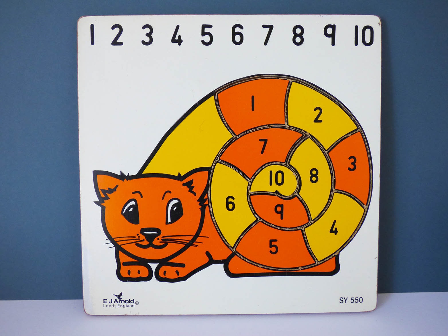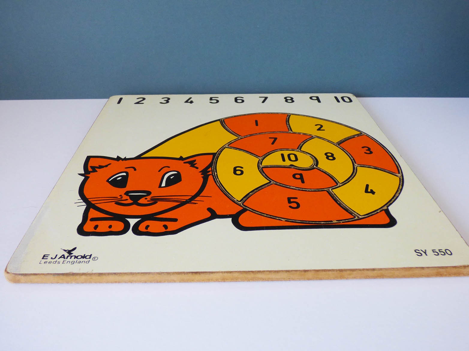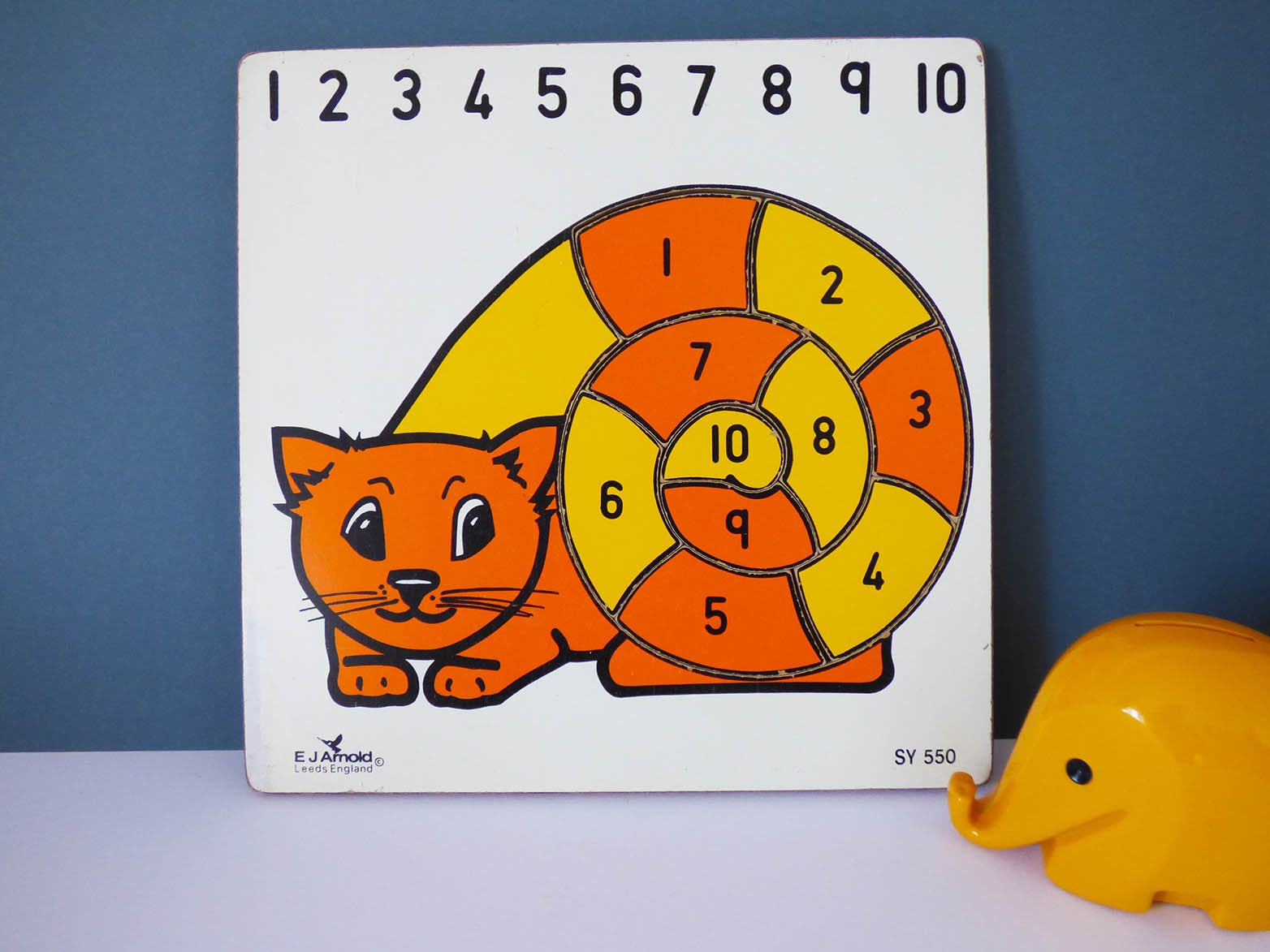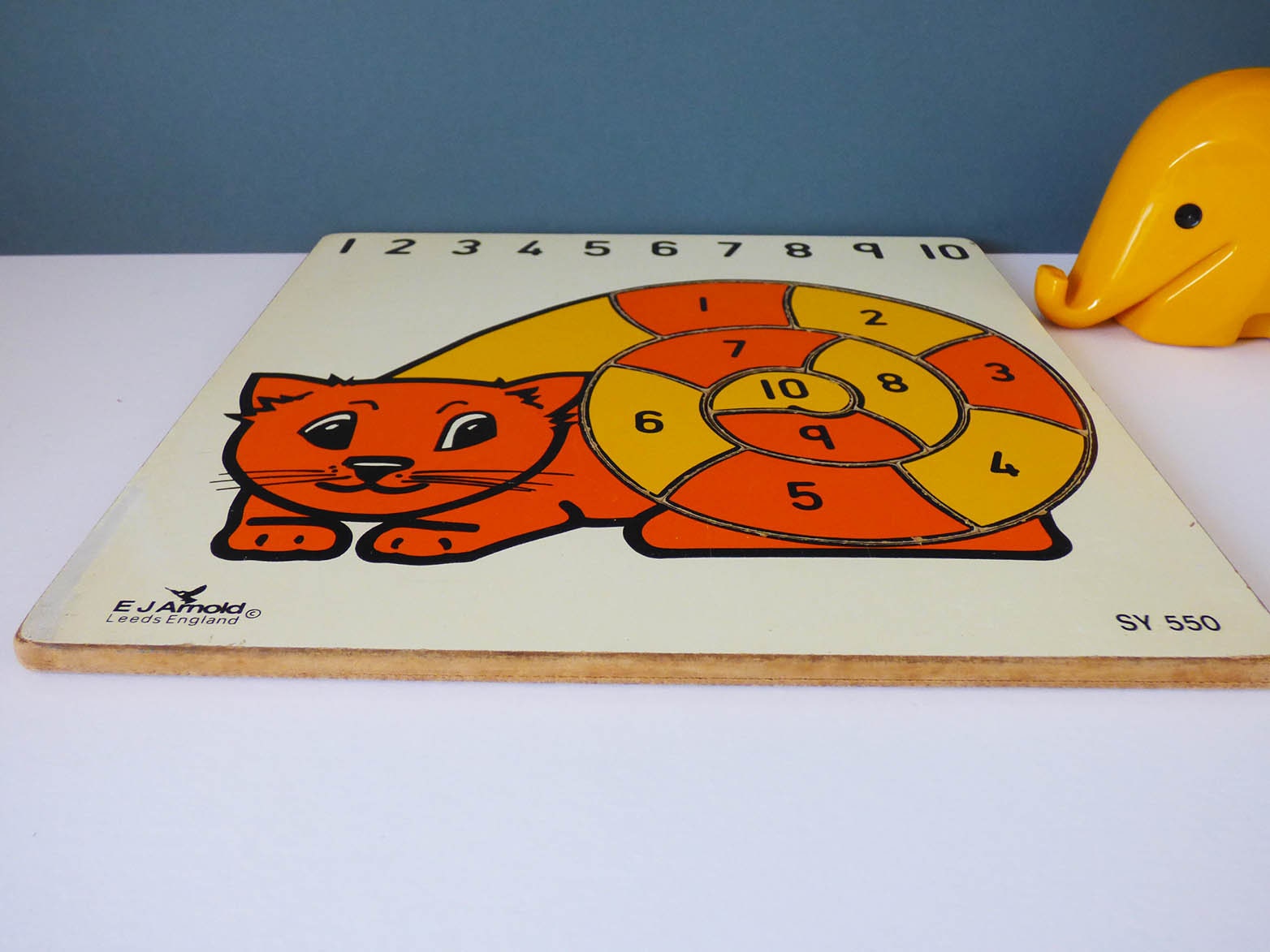A beautiful vintage wooden puzzle, produced in wonderful bright yellow and orange, the puzzle is in good condition, with just some very light signs of play, the paint has slightly worn away on the left-hand edge, The puzzle was beautifully made by British toy company E J Arnold, who made many educational toys for children which due to there quality and durability were often found in primary schools around Britain.
