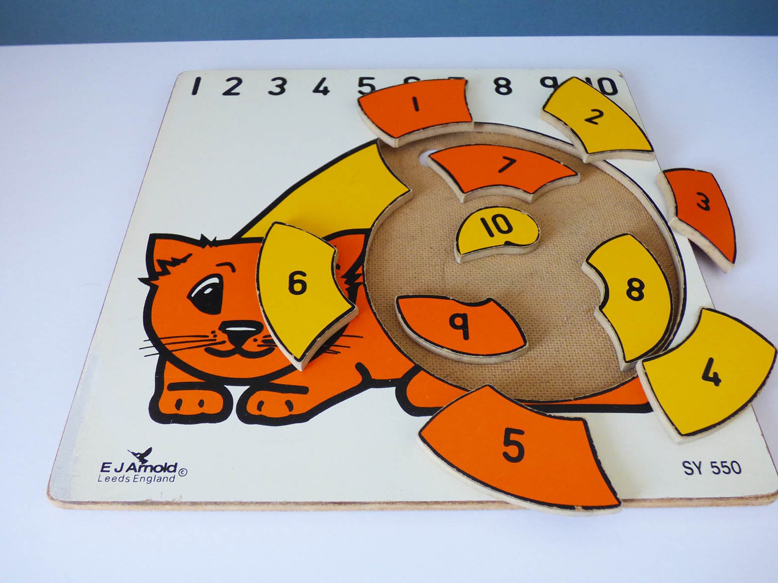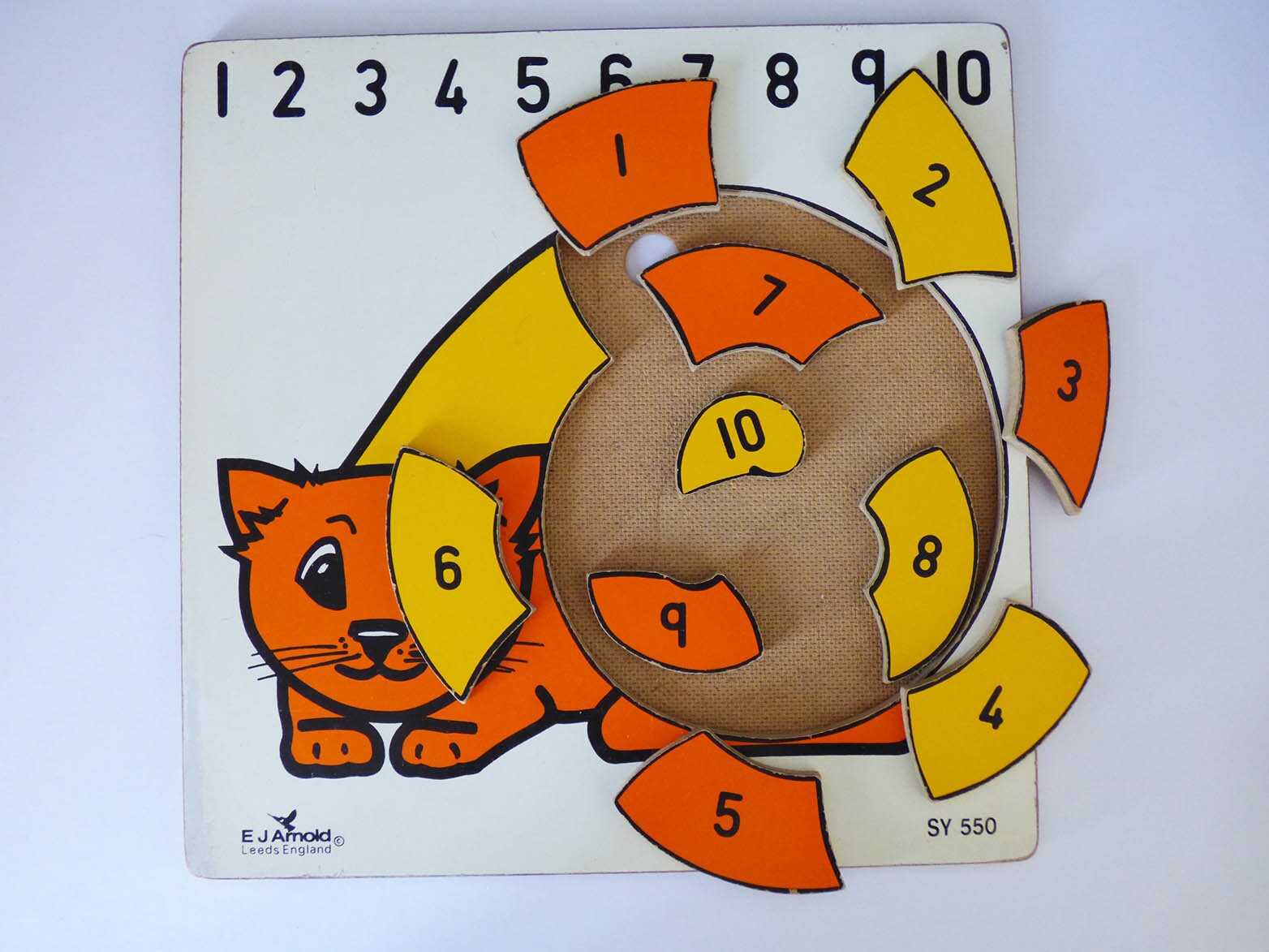 The cat puzzle is quite large, and consists of 10pieces each numbered, along the top of the wooden frame the numbers 1 to 10 are printed, to help the child remember which number comes next.