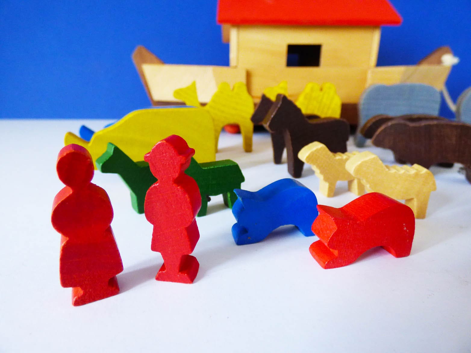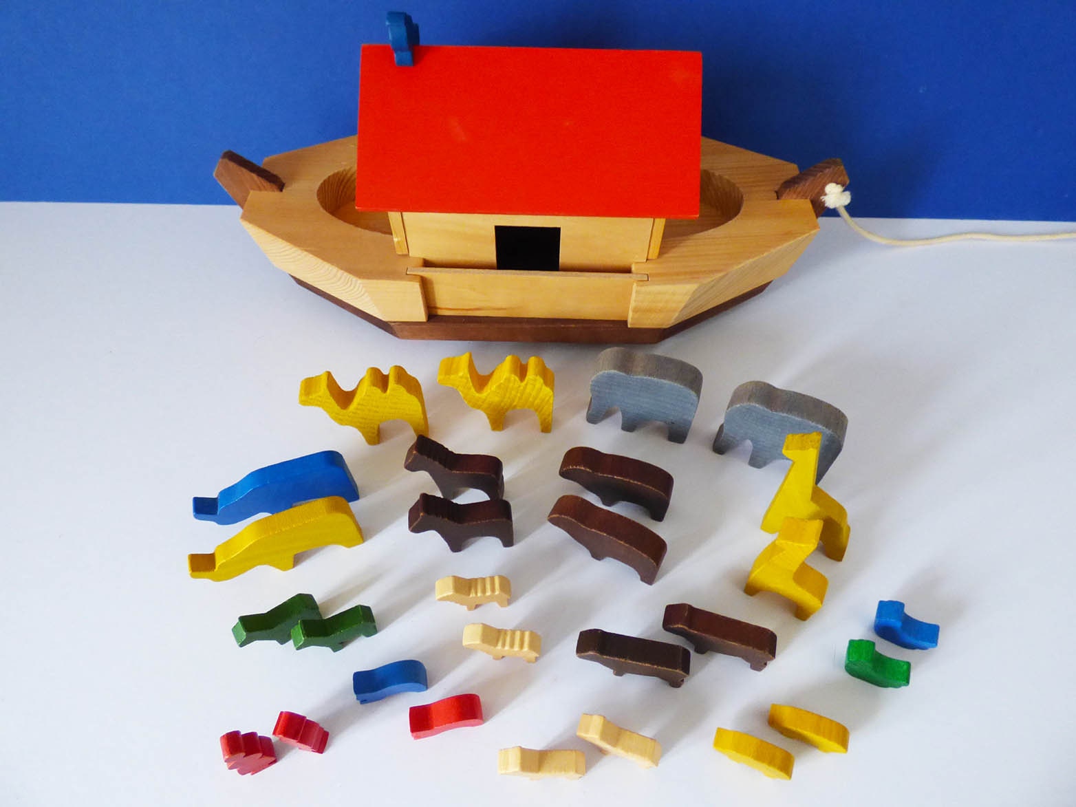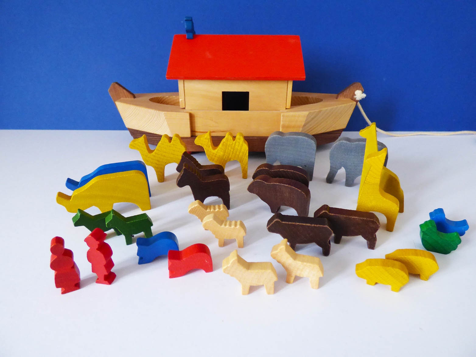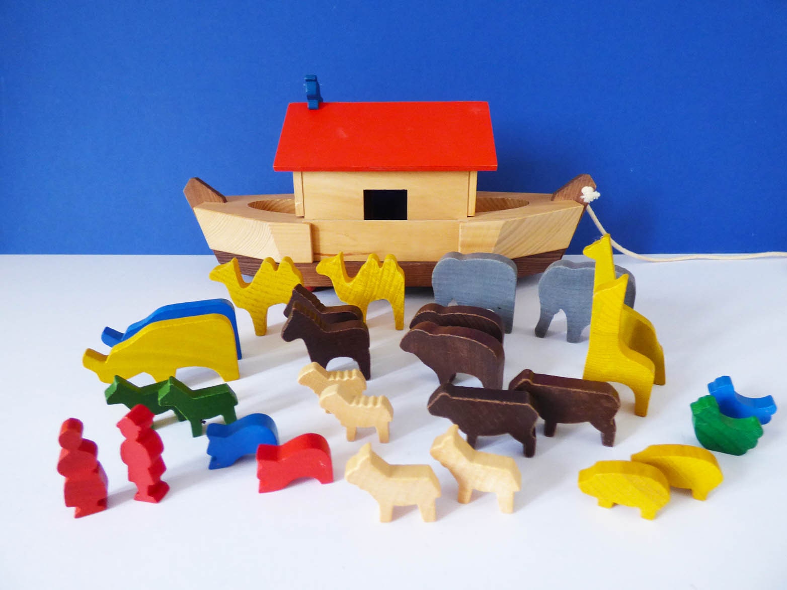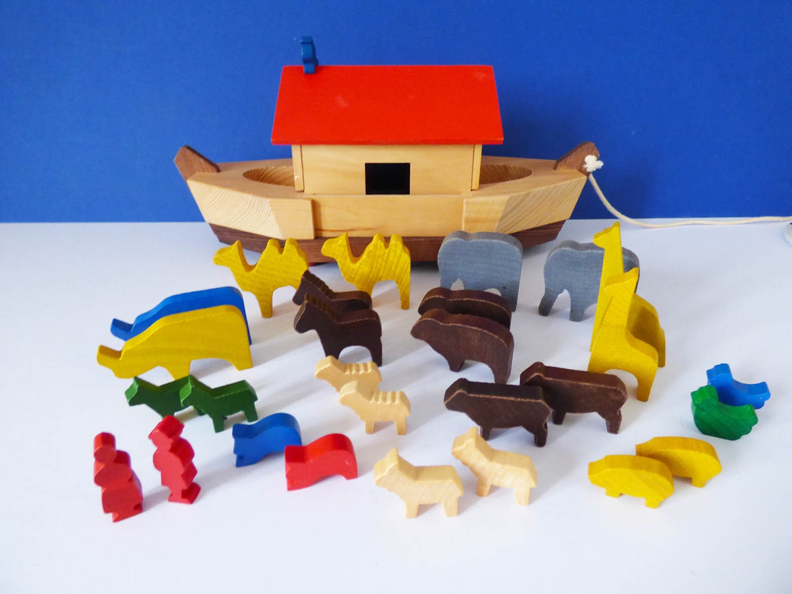 Created by Bauer of West Germany here we have a beautiful wooden Noahs ark toy, the toy consists of many wooden parts, you can actually build the Arch yourself, and then pop all the animals, Noah and his wife into the Ark, and pull them along on there journey.