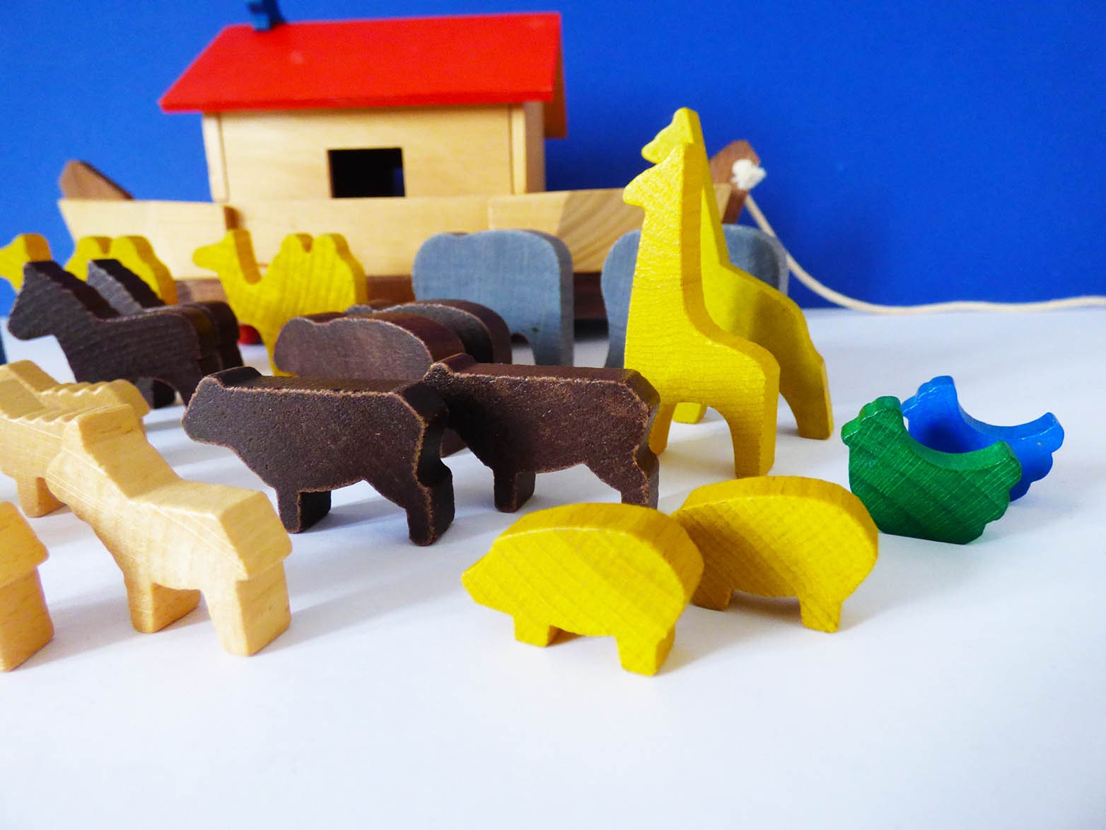 The Ark comes apart into 5 simple pieces, unfortunately, one of the fence pieces which also doubles up as a ramp is missing but the one on the other side is present. The Ark also has ball wheels to the underside, so once all your animals are aboard you can pull the Ark to a new place, hopefully, where its less flooded. The animals are just delightful, there appears to be 2 of everything, except the bluebirds, of which there is only one, also the giraffe's partner is not matching. According to the box, there should be 26 pieces, but there are 29, so perhaps some are not the originals. But this really is a beautiful toy, with so many opportunities for free play and imagination.