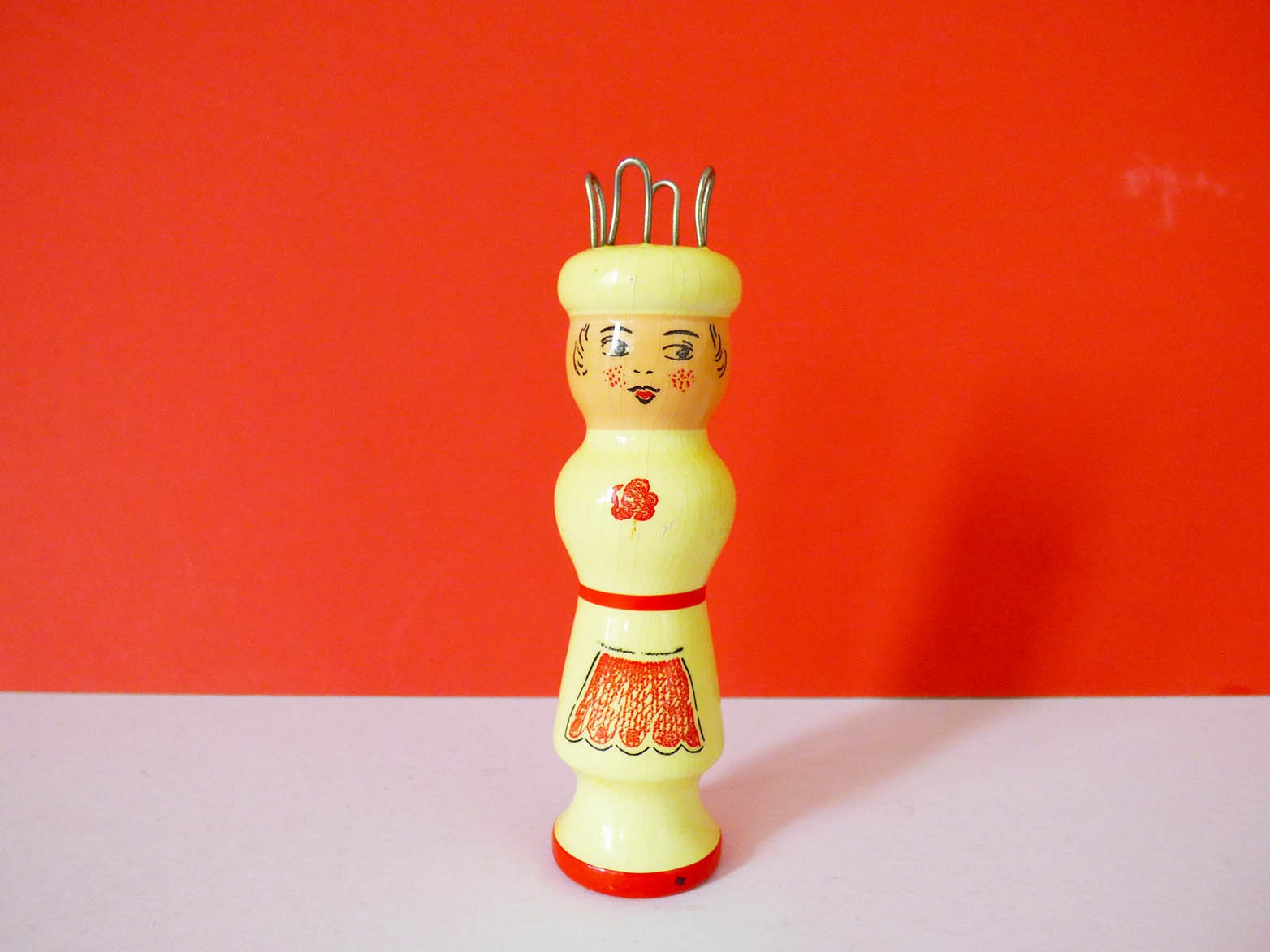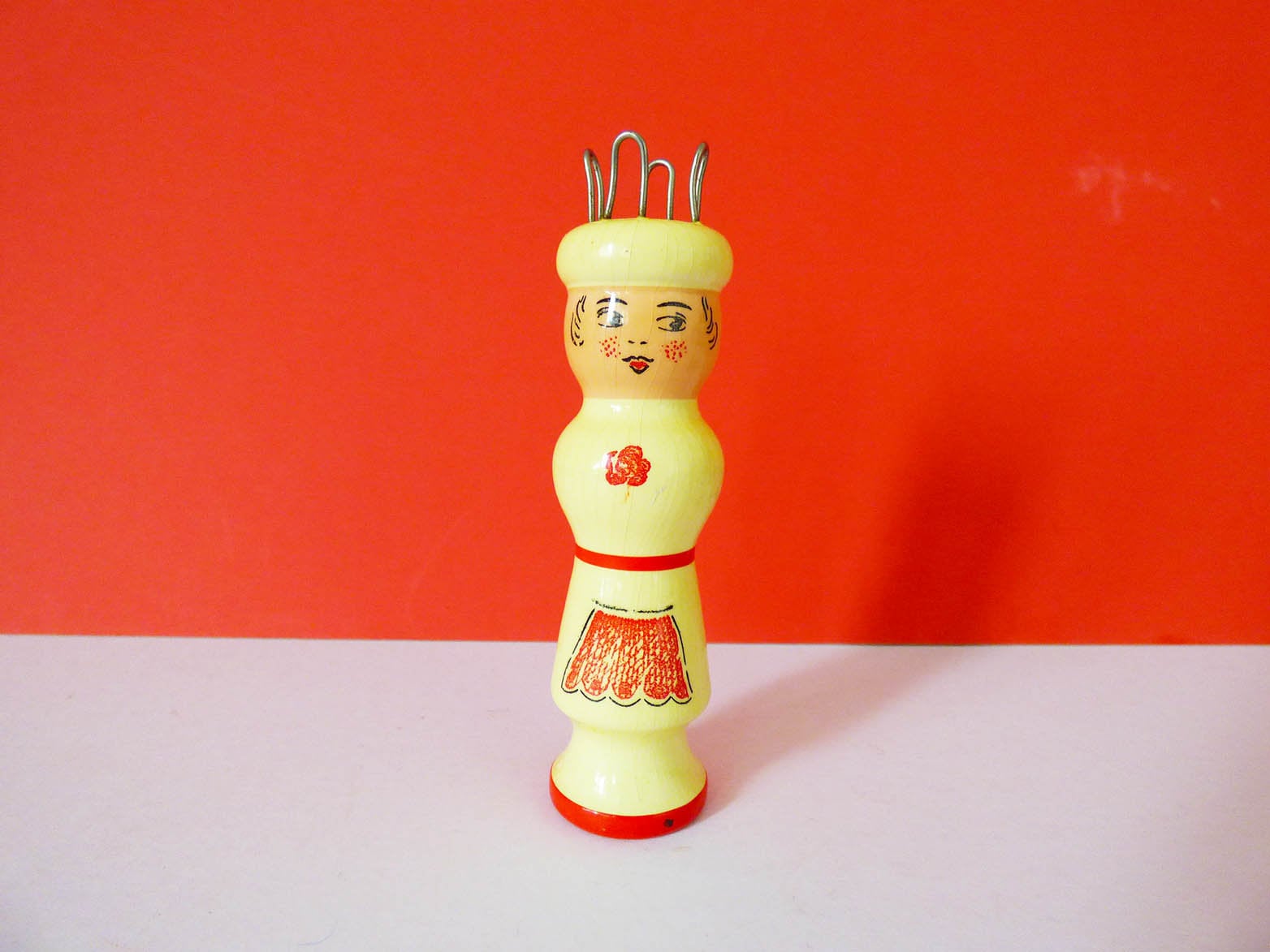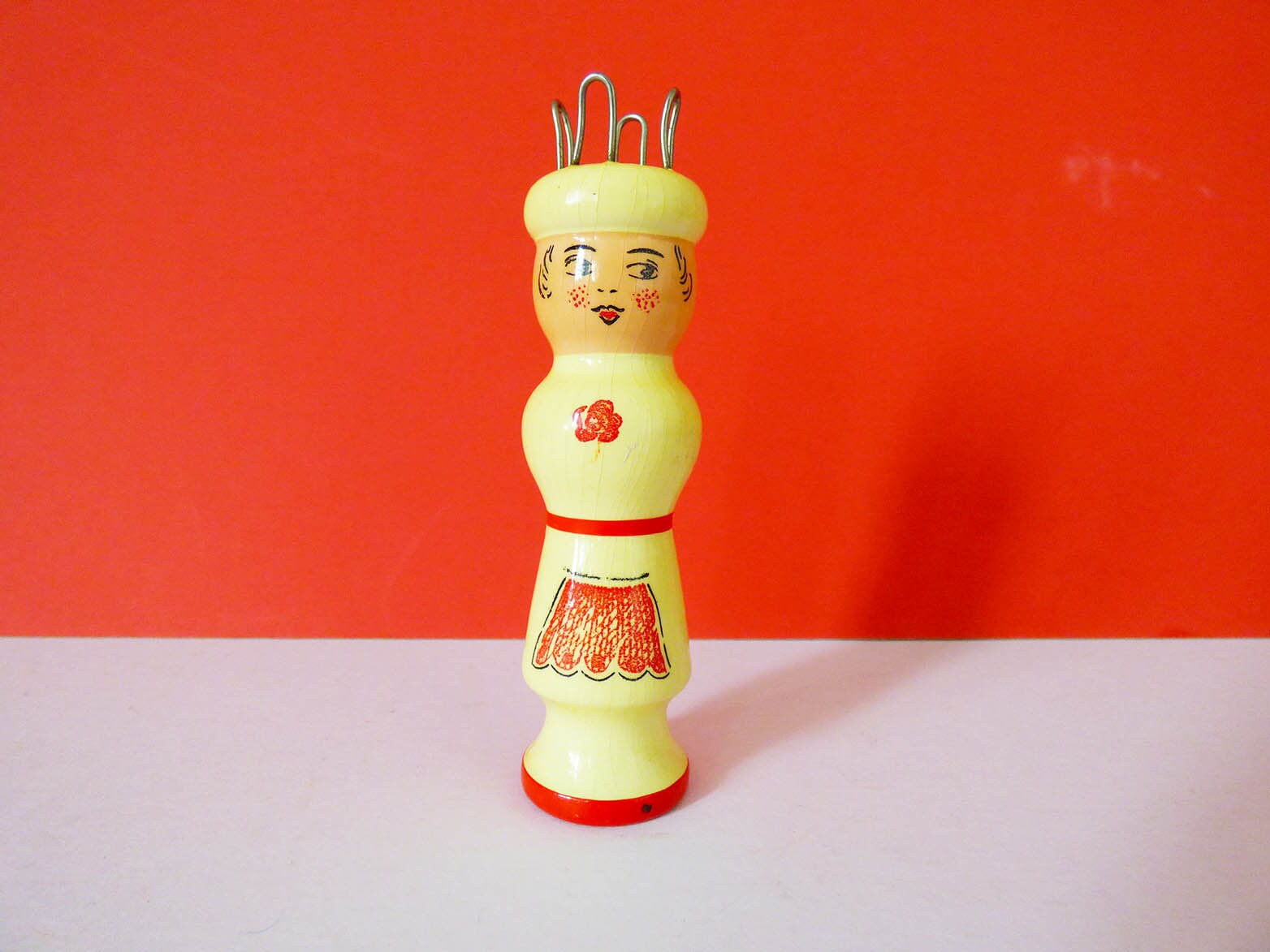 Just too cute, this original vintage wooden lady shaped knitting spool, here in England we call them knitting Nancy's.