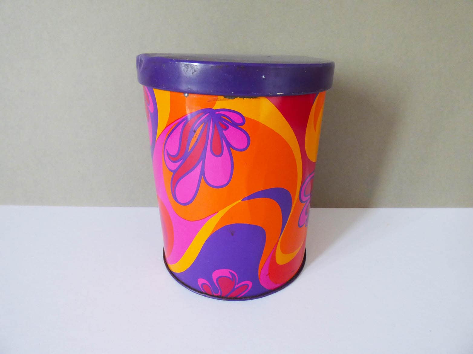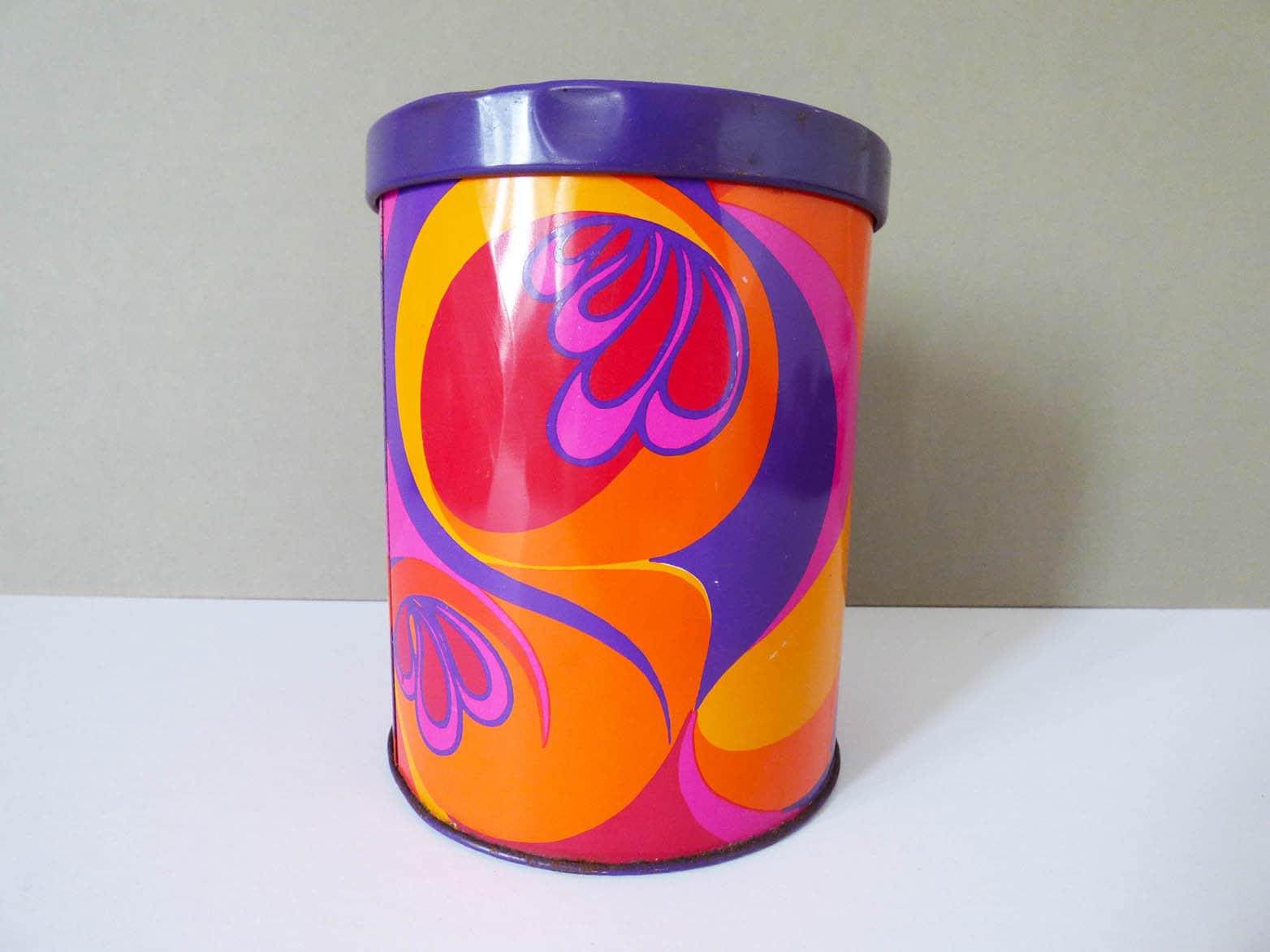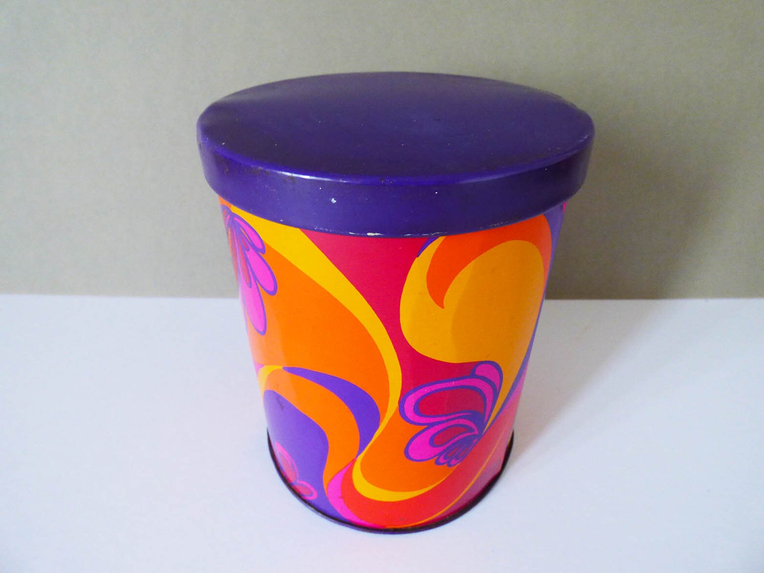Beautiful and original 1970's Psychedelic tin, the canister is made from tin, with push down tin lids, keeping the contents fresh and secure. A Great tin with a wonderful swirly psychedelic pattern, perfect for your favourite tea, biscuits or craft supplies.