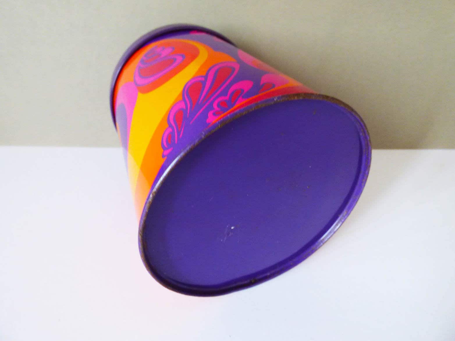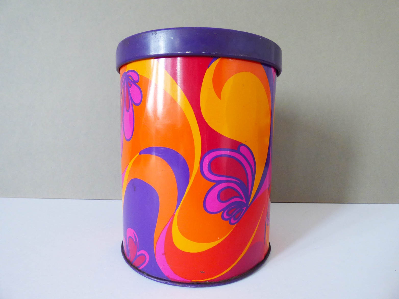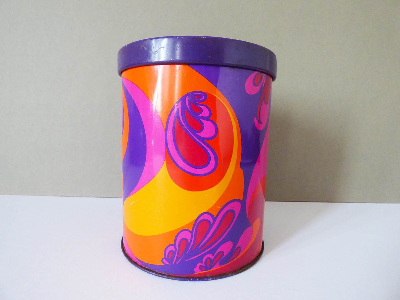Beautiful and original 1970's Psychedelic tin, the canister is made from tin, with push down tin lids, keeping the contents fresh and secure. A Great tin with a wonderful swirly psychedelic pattern, perfect for your favourite tea, biscuits or craft supplies.