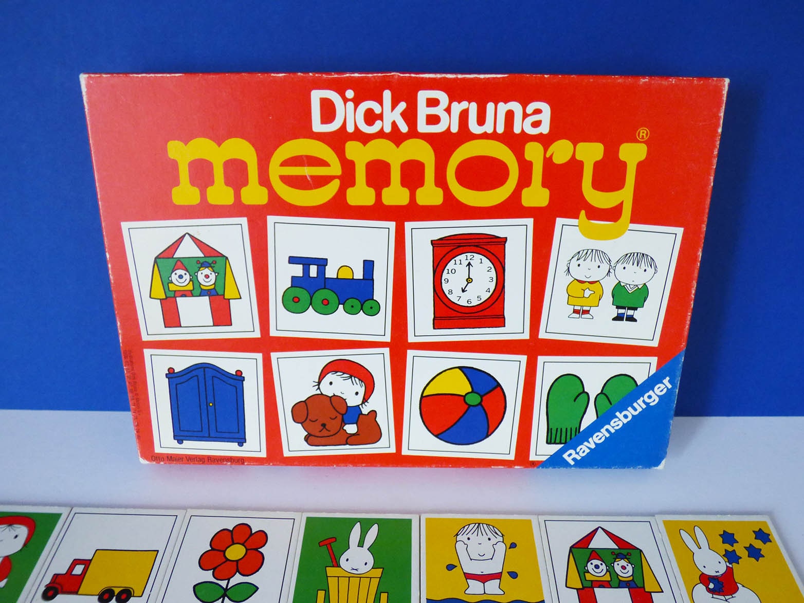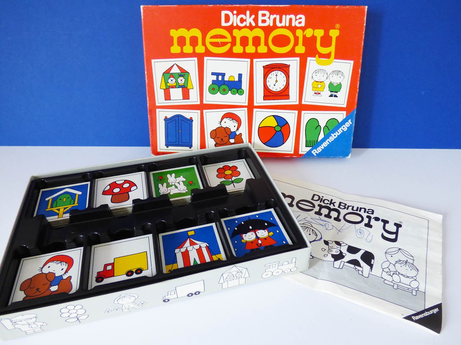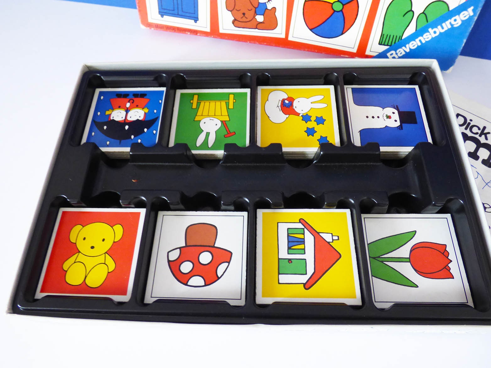 Original 1981 chunky memory game with classic images of Dick Bruna's characters. Created by Ravensburger, the game is in excellent condition, The game is unfortunately not complete there are 33 pairs, rather than the 36 pairs stated on the box. So that's 66 cards in total but at least all the matching cards are present.