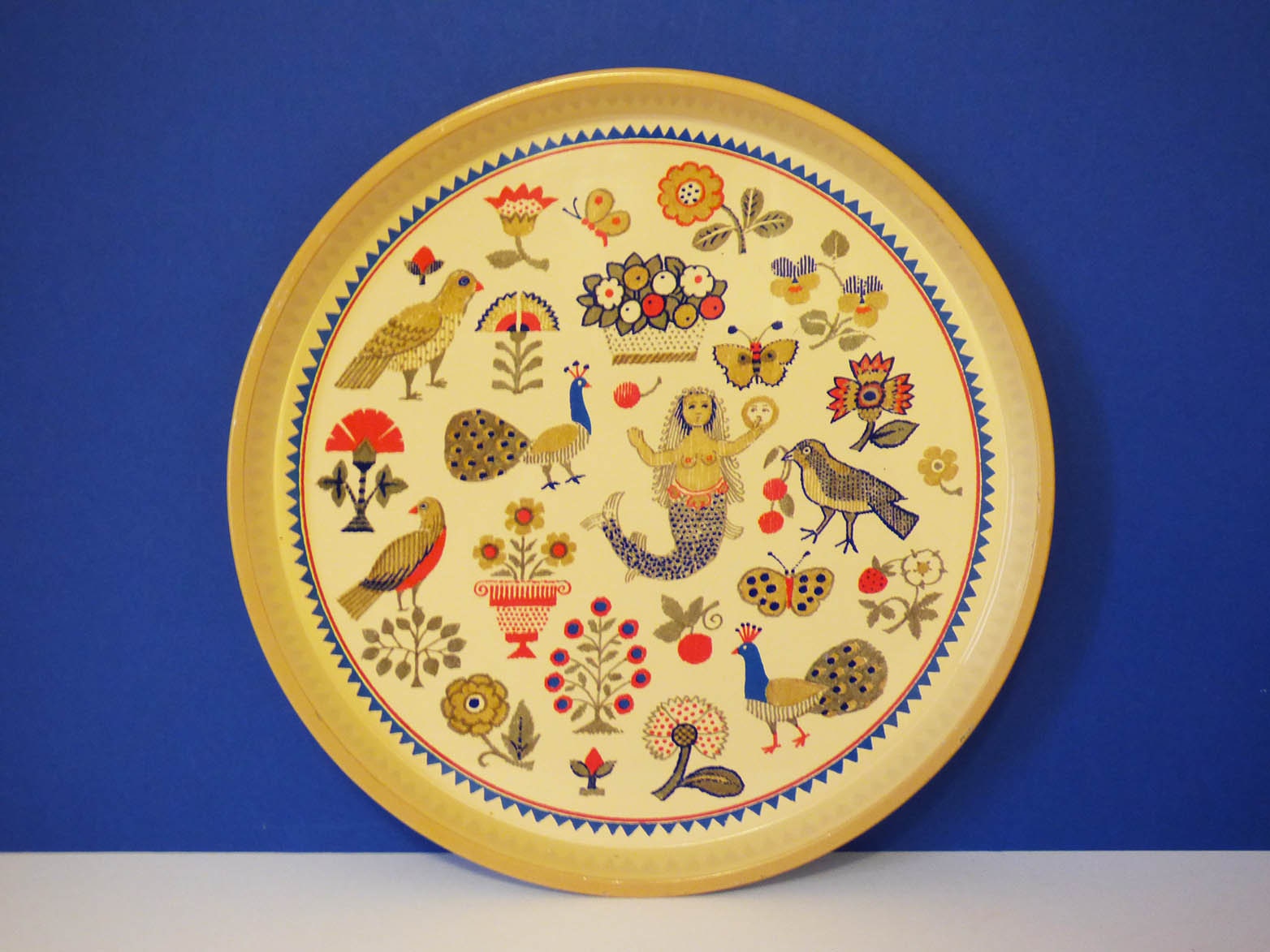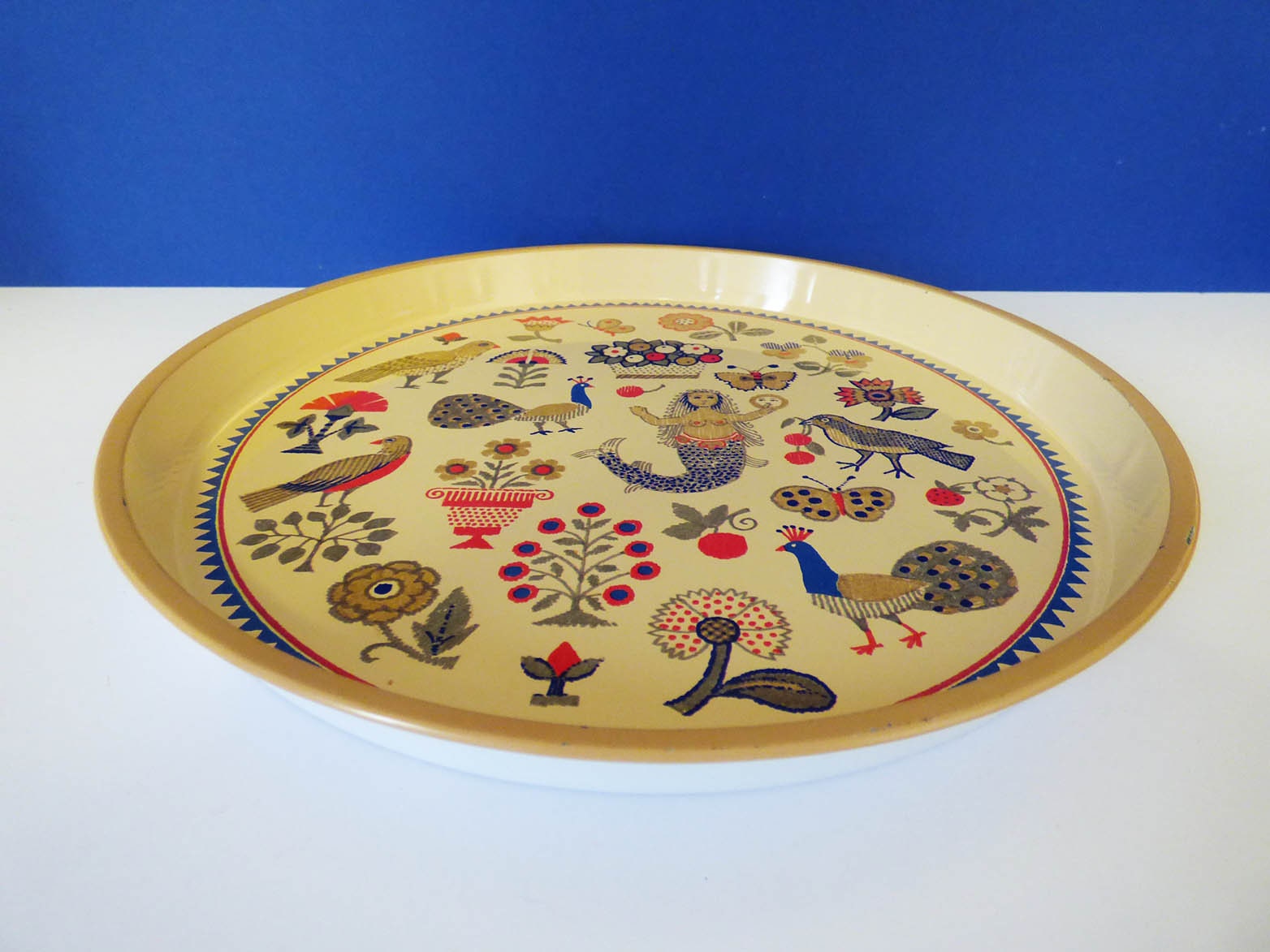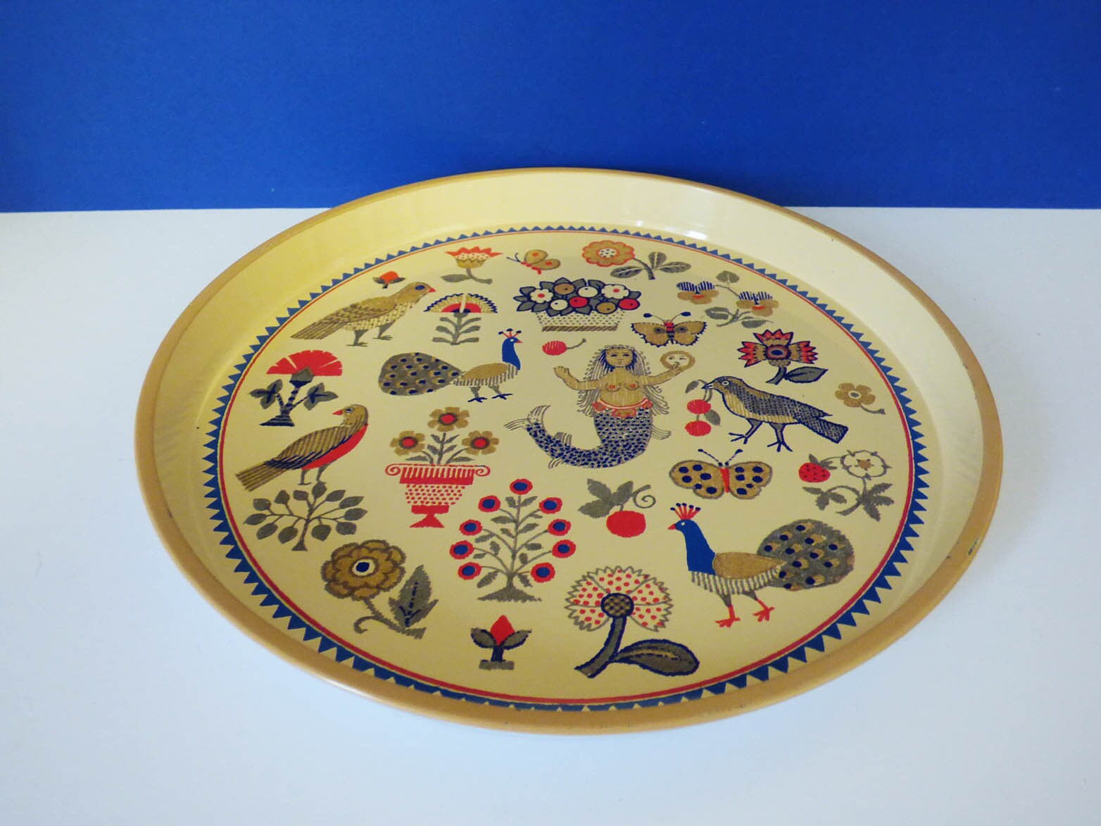 Metal serving tray, the tray has an amazing illustration featuring flowers, butterflies, birds and a mermaid, produced in beautiful muted colours, on a cream coloured background...