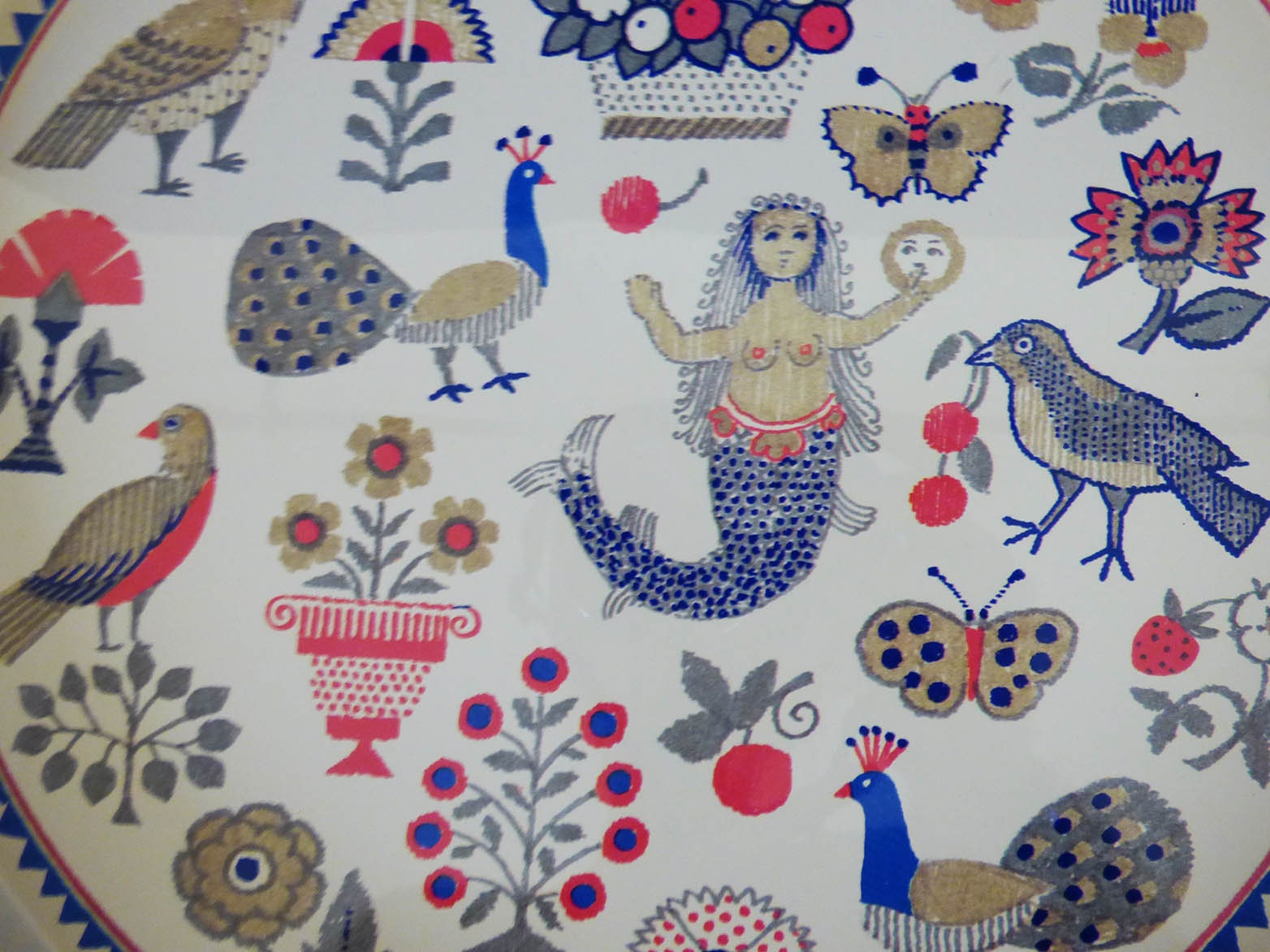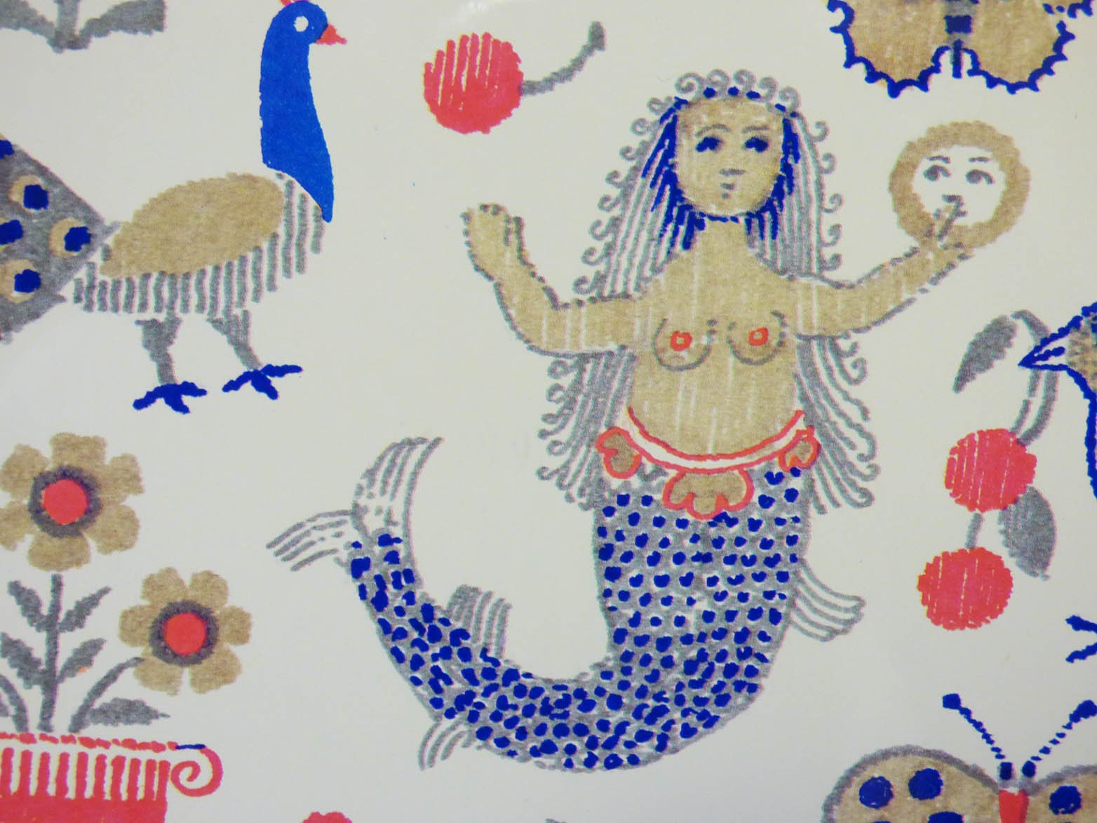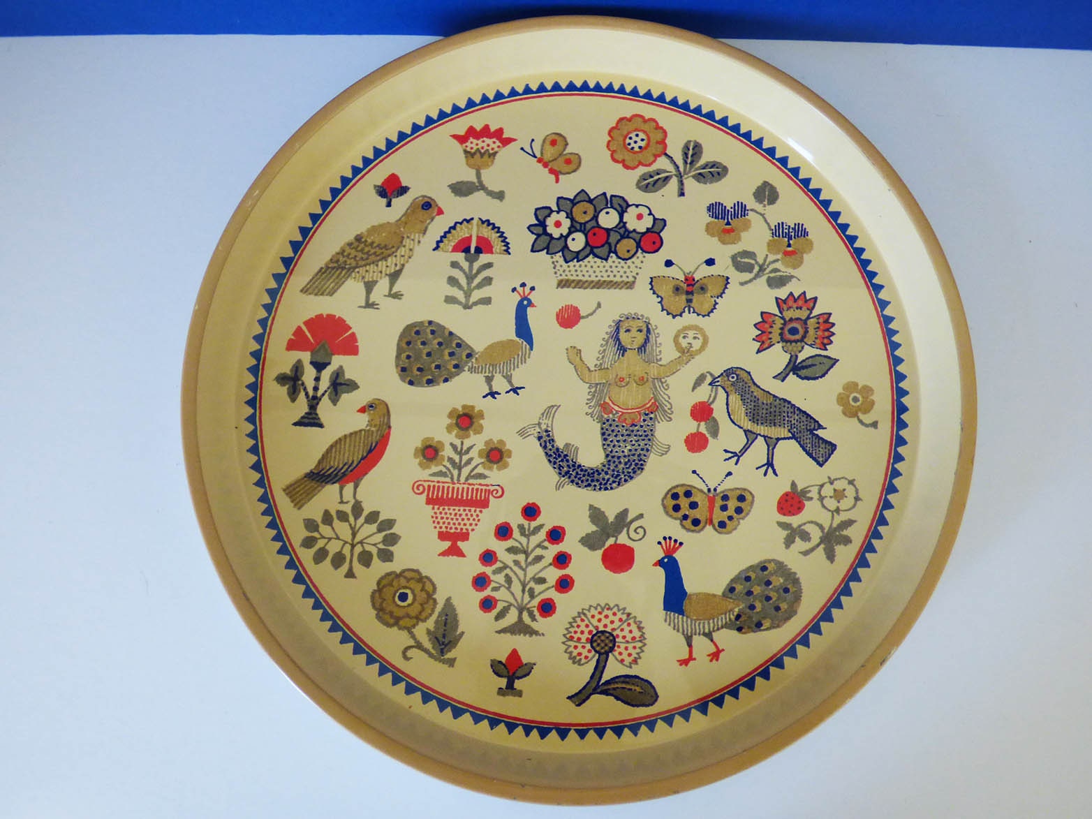 Metal serving tray, the tray has an amazing illustration featuring flowers, butterflies, birds and a mermaid, produced in beautiful muted colours, on a cream coloured background...
