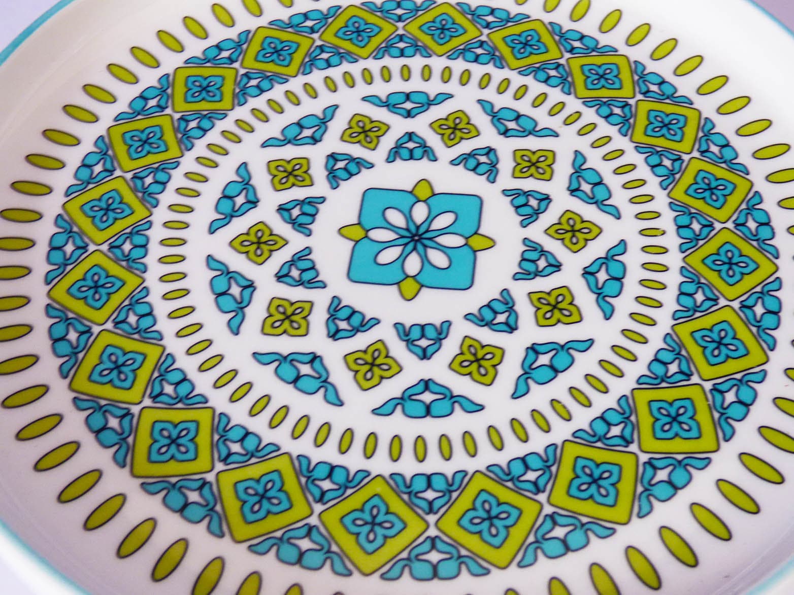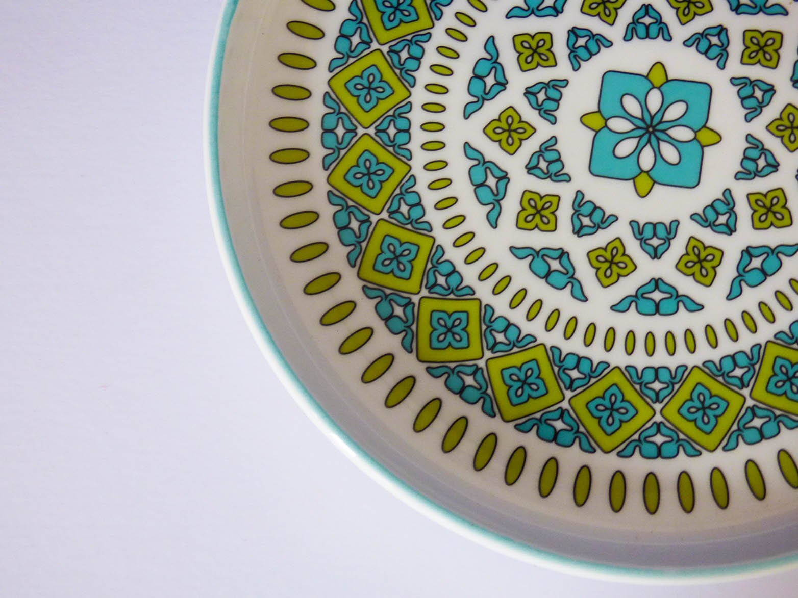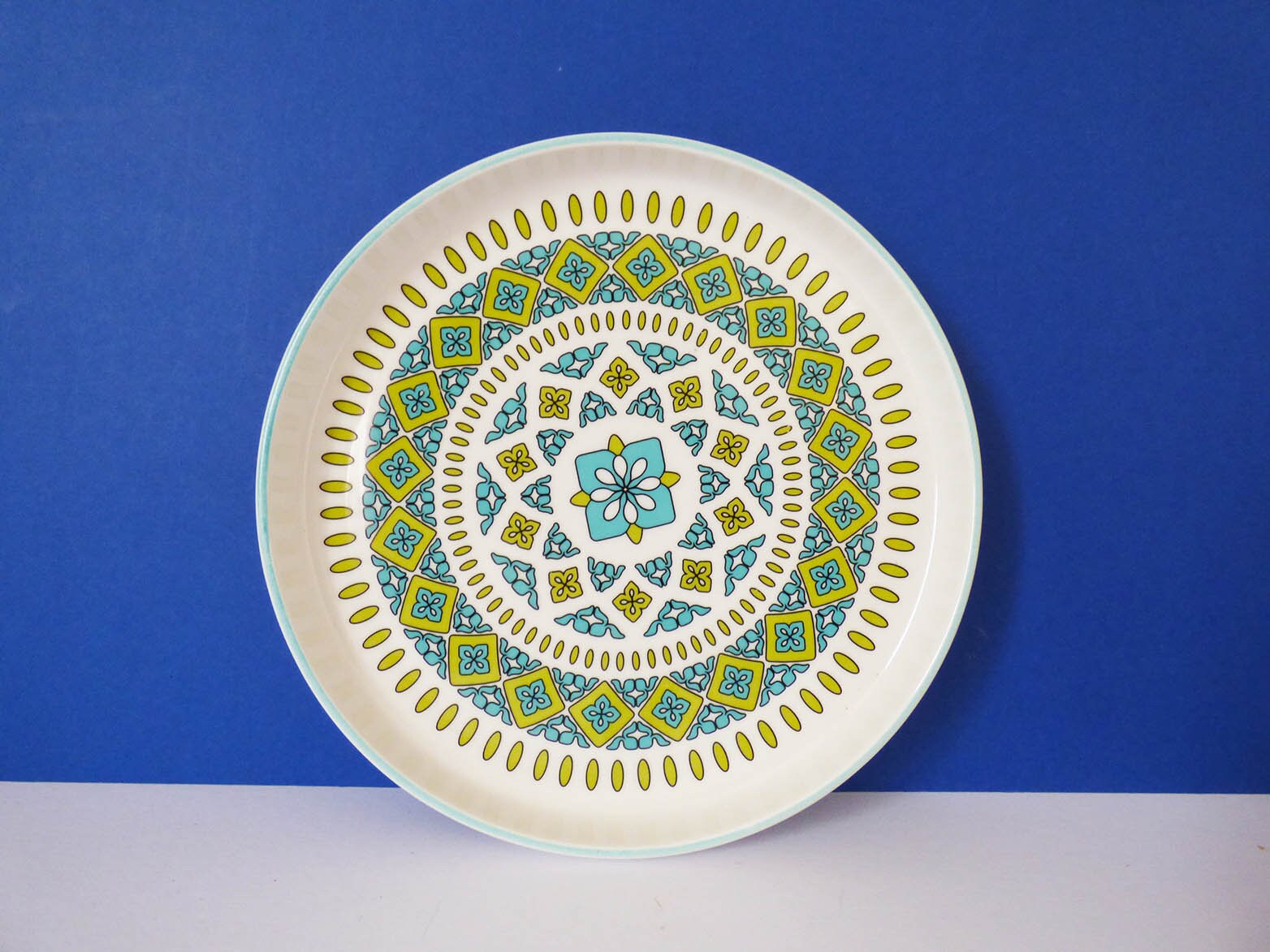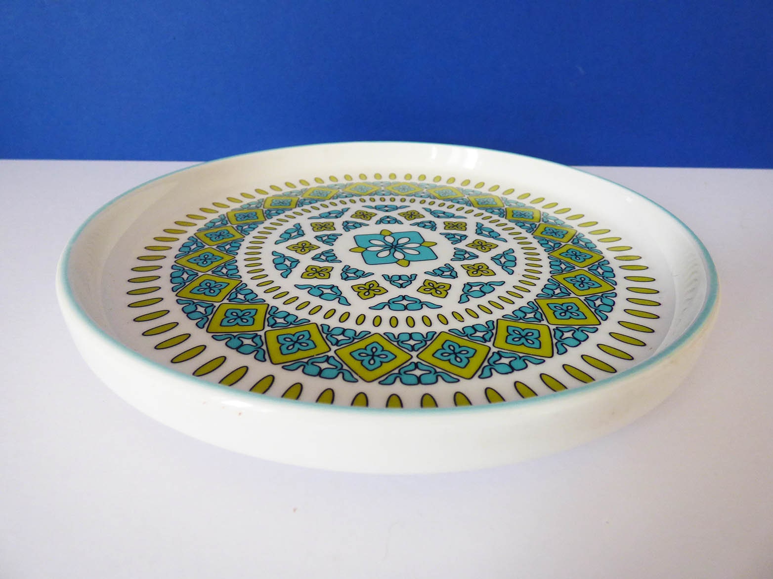 A lovely vintage ceramic plate, with raised edges, great to use to keep salt and sauces together or as a serving plate, it would make a lovely breakfast plate for toast to be shared from. The plate has a classic vintage pattern, produced in turquoise and lime green, the pattern is slightly raised, and the condition of this piece is excellent. There is no makers mark, but this piece originally came from Holland and oozes late 60s style.