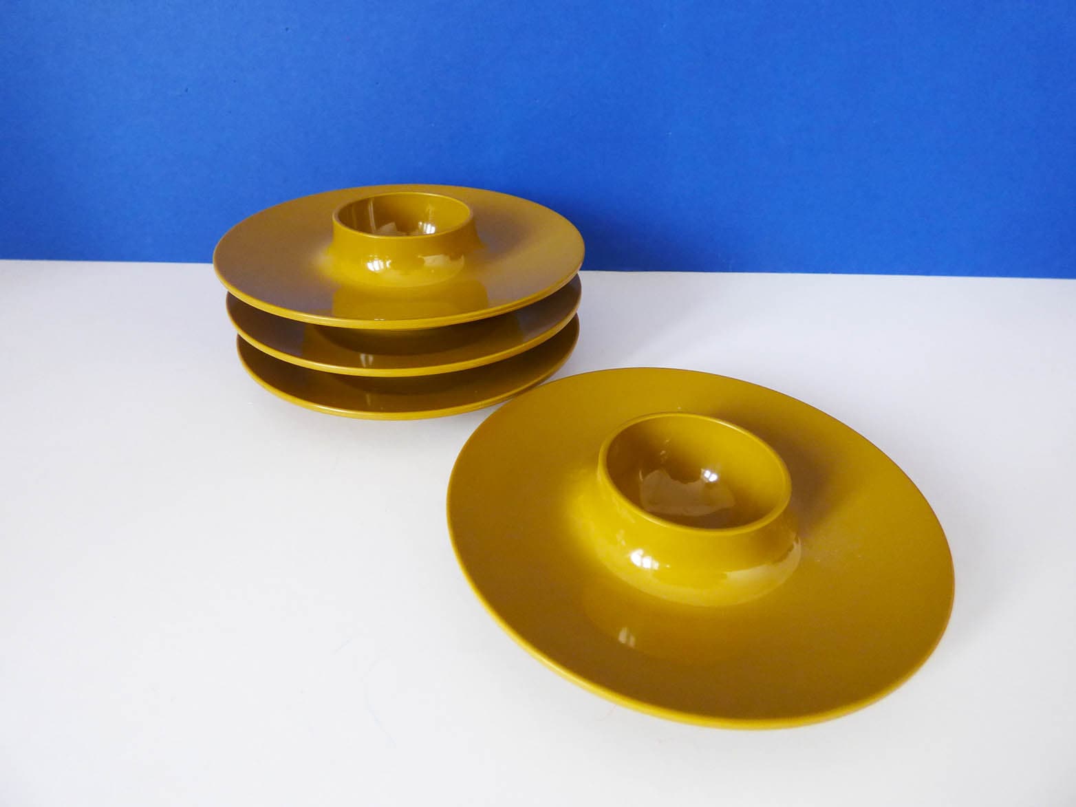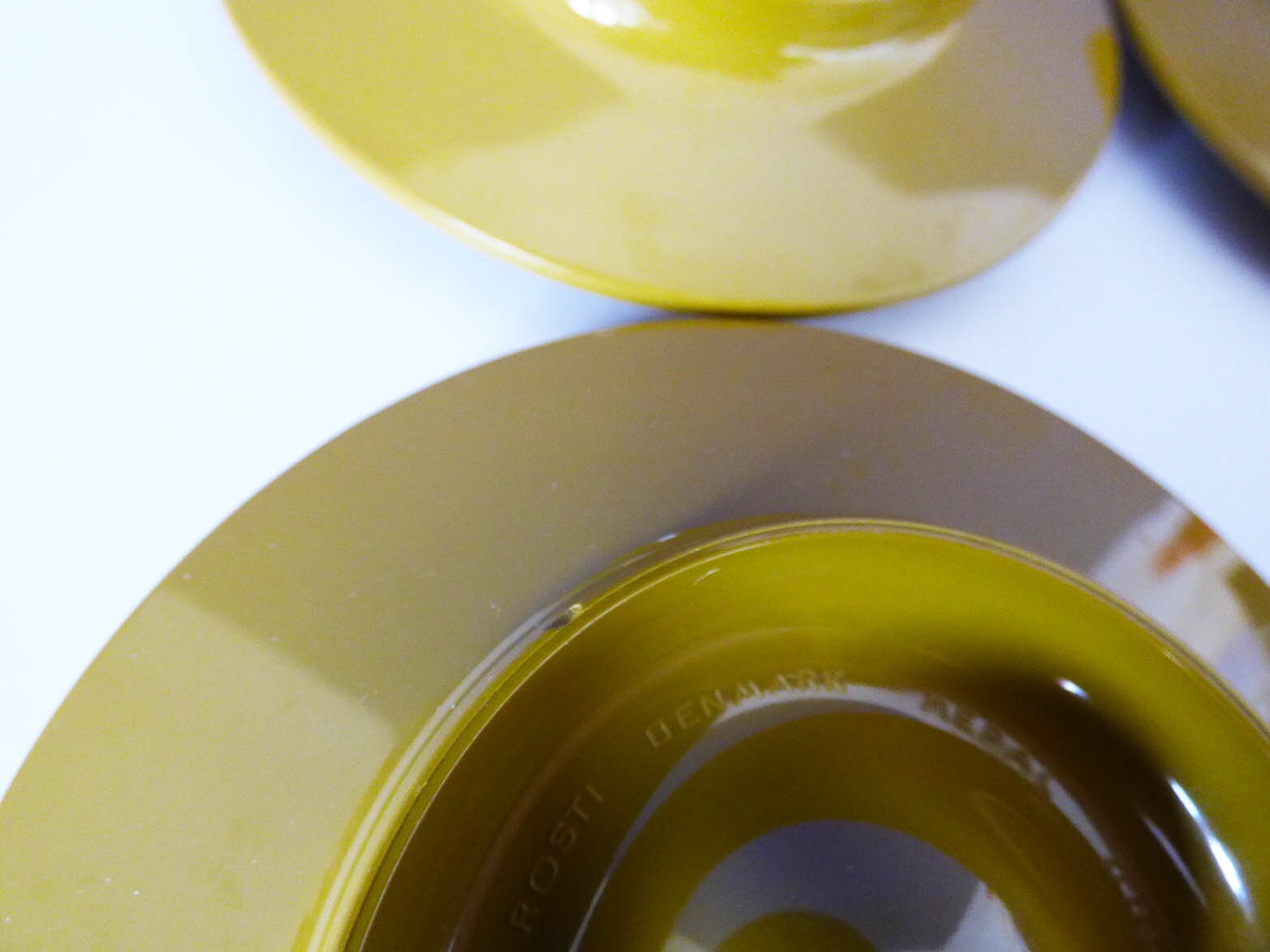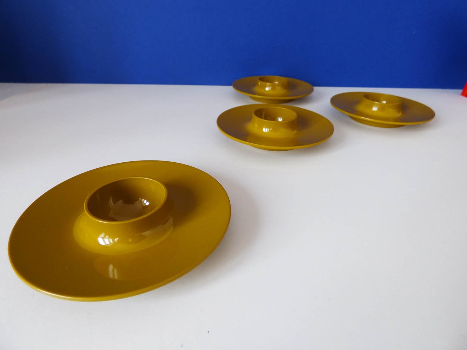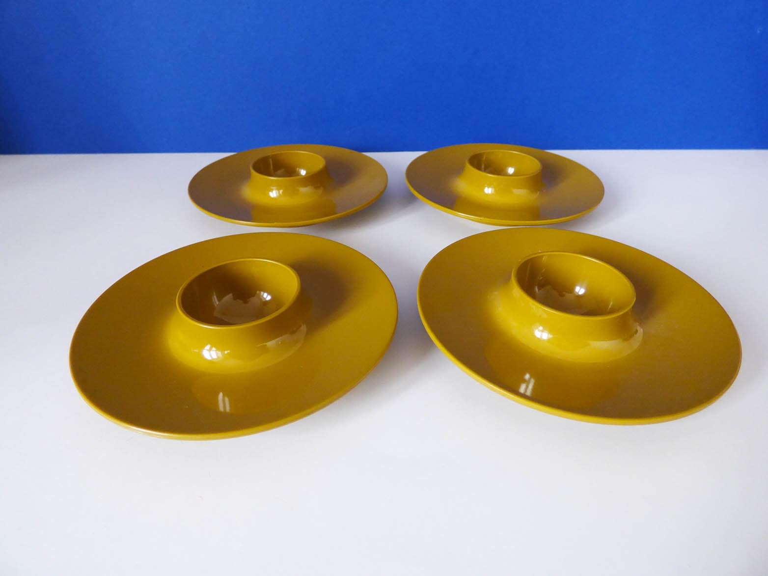 We totally love these, 4 dark olive green/mustard yellow Rosti Mepal egg cups designed by Bjoern Christensen, made in Copenhagen Denmark. An absolutely classic design, which really just can't be beaten, these egg cups have it all, beautifully designed, stackable, in a superb colour... These simply are the best. :)