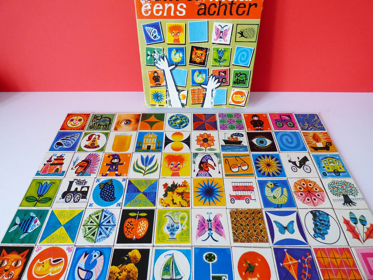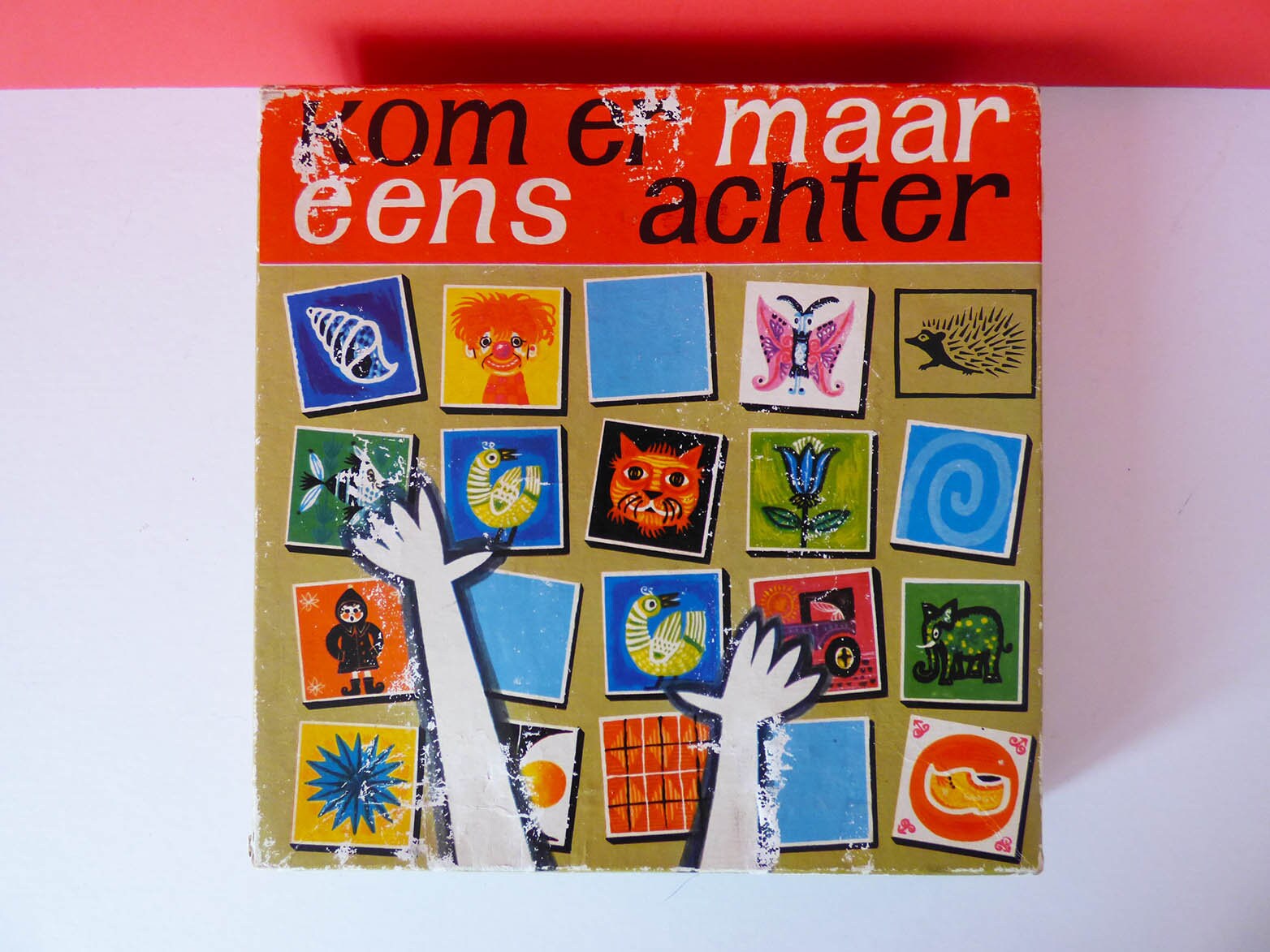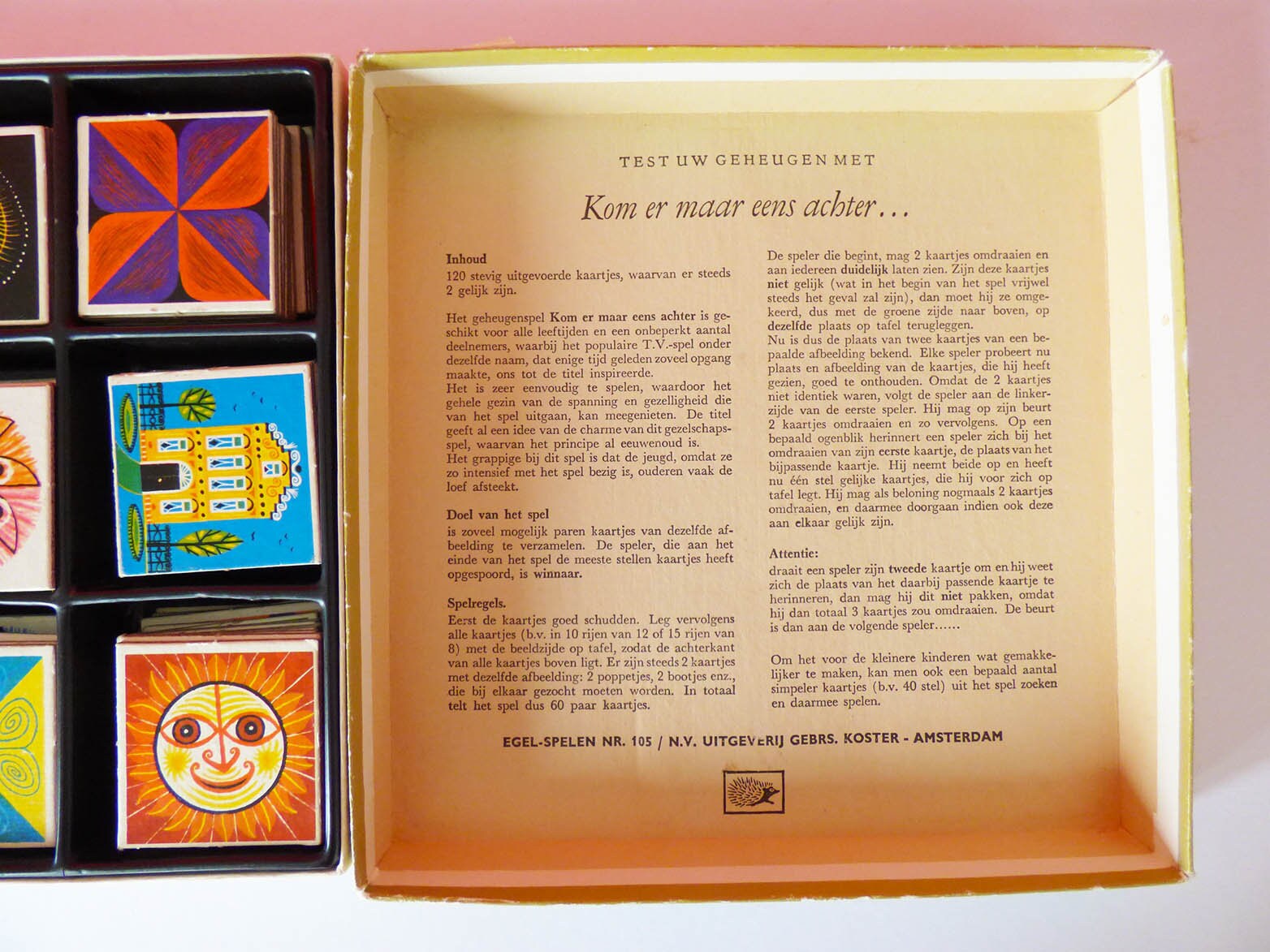 A wonderful 1960's full version of the wonderful classic Dutch memory game "Kom er maar eens achter," the game is a little incomplete, there are 57 pairs. rather than 60 pairs.