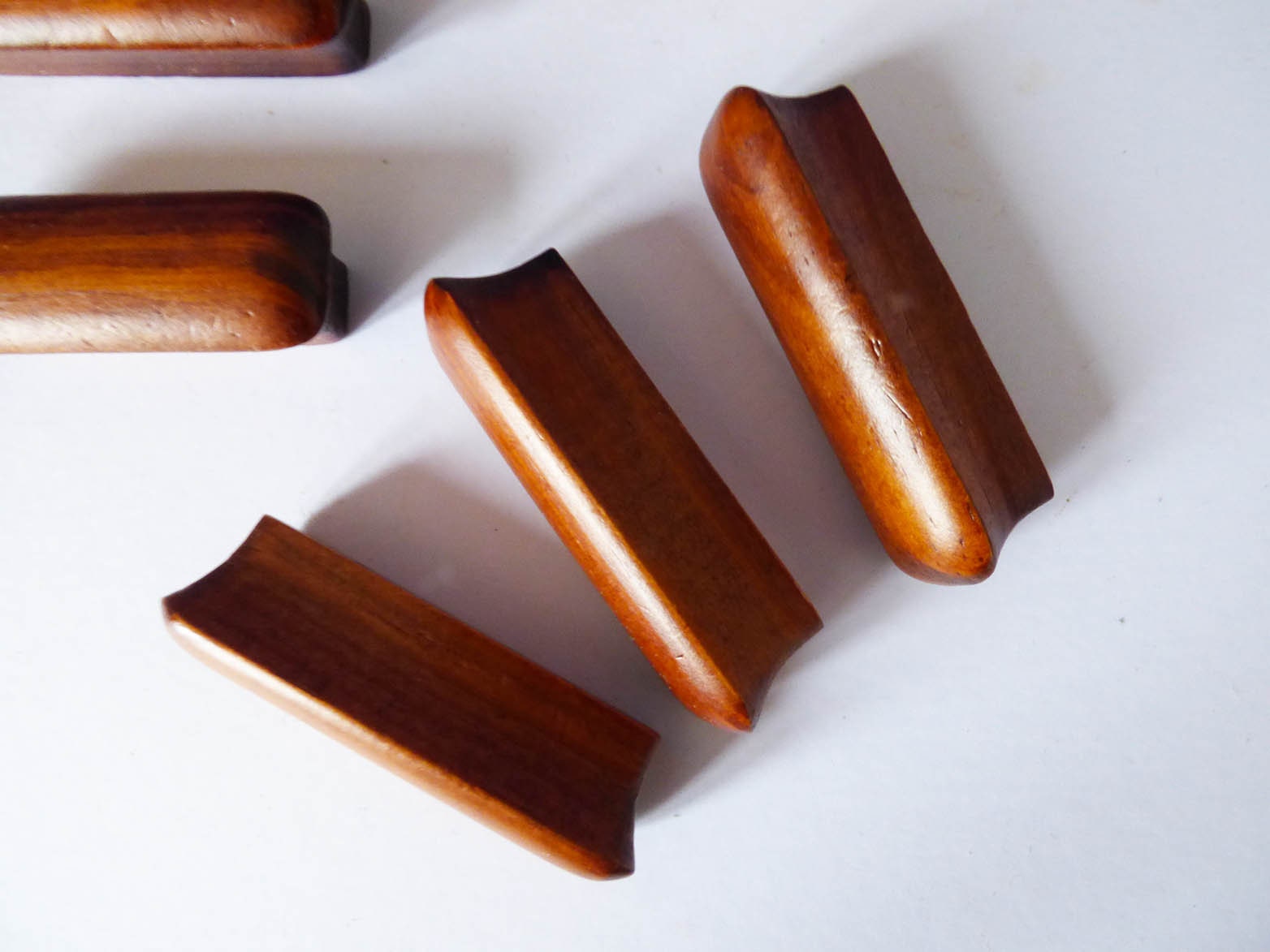 Wonderful original 1960's cupboard handles, created from wood, I'm unsure what type, There are 17 in total which I'm selling as 1 lot. These would be perfect for cupboard doors, they could be used on a door, but they would probably be a little small. Each handle has two screw holes to the back, but you will need screws to attach them.