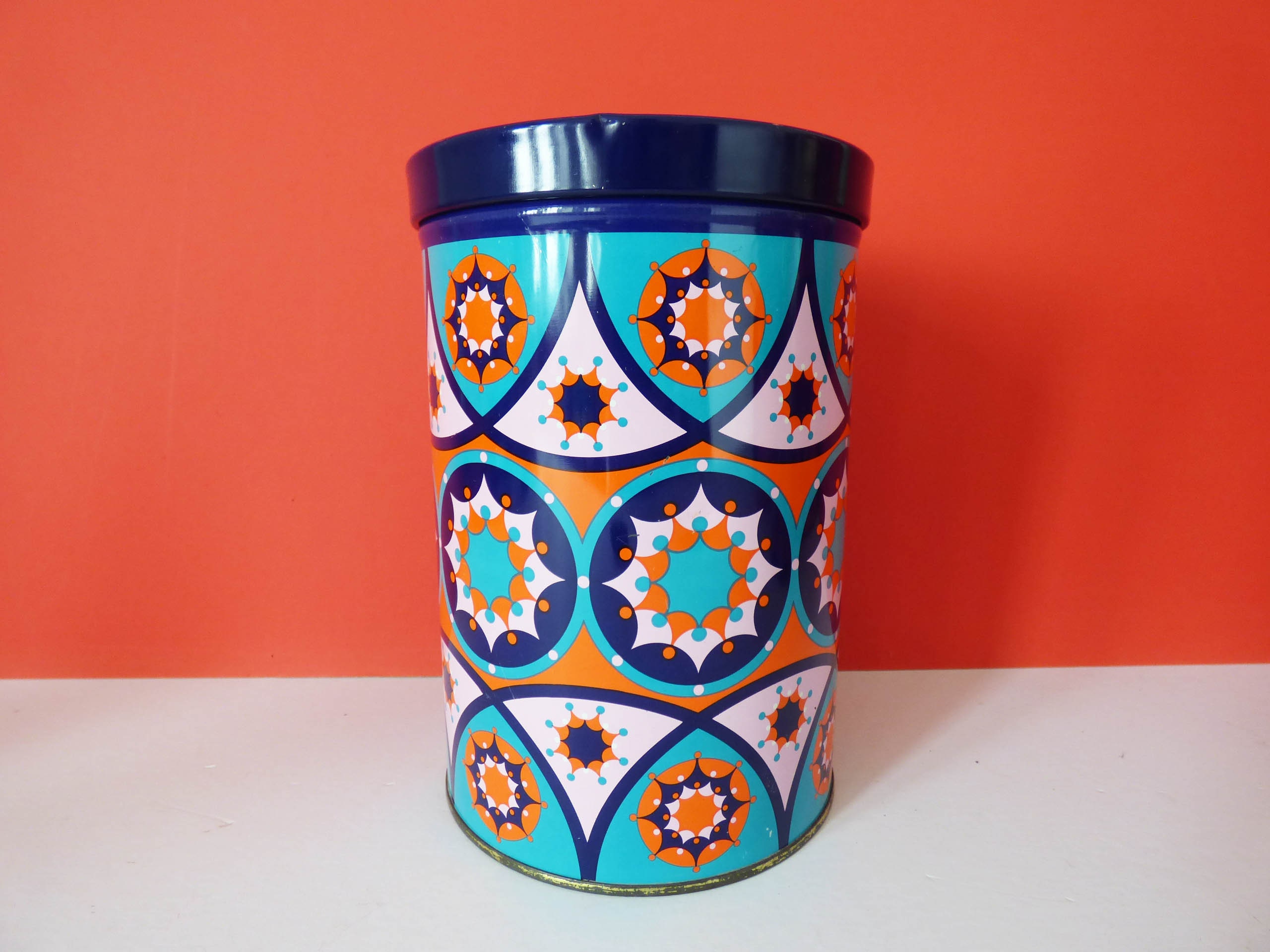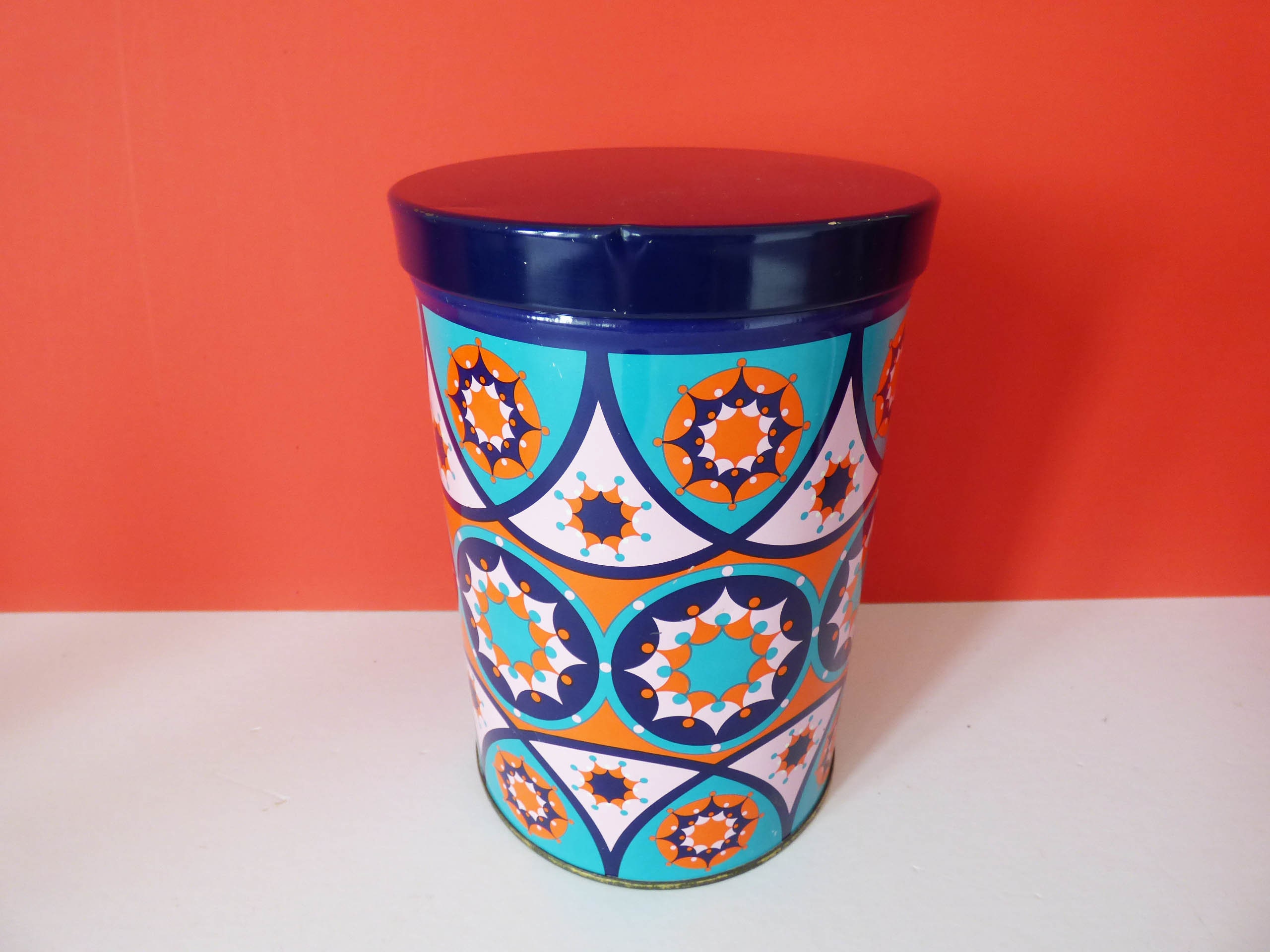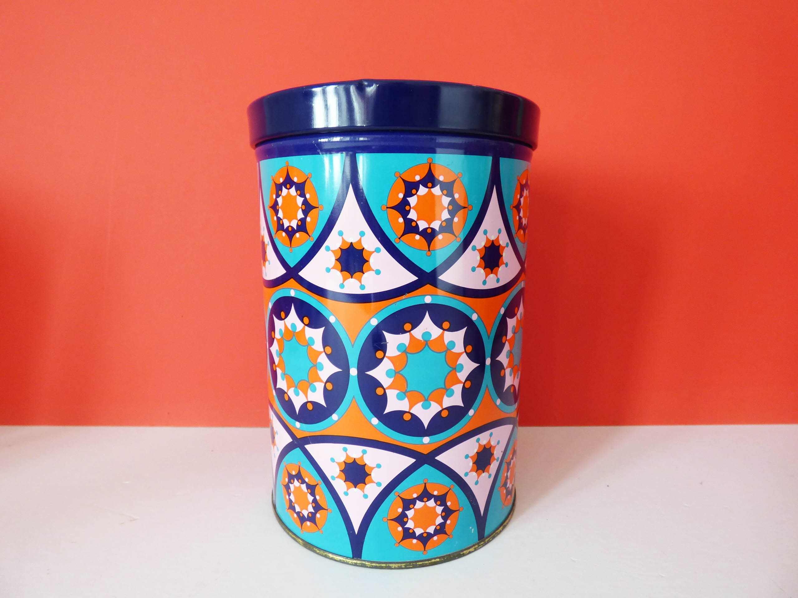 Beautiful and original 1970's Psychedelic tin, the canister is made from tin, with push down tin lids, keeping the contents fresh and secure. A Great tin with a wonderful swirly psychedelic pattern, perfect for your favourite tea, biscuits or craft supplies, created in Holland by Tomado.