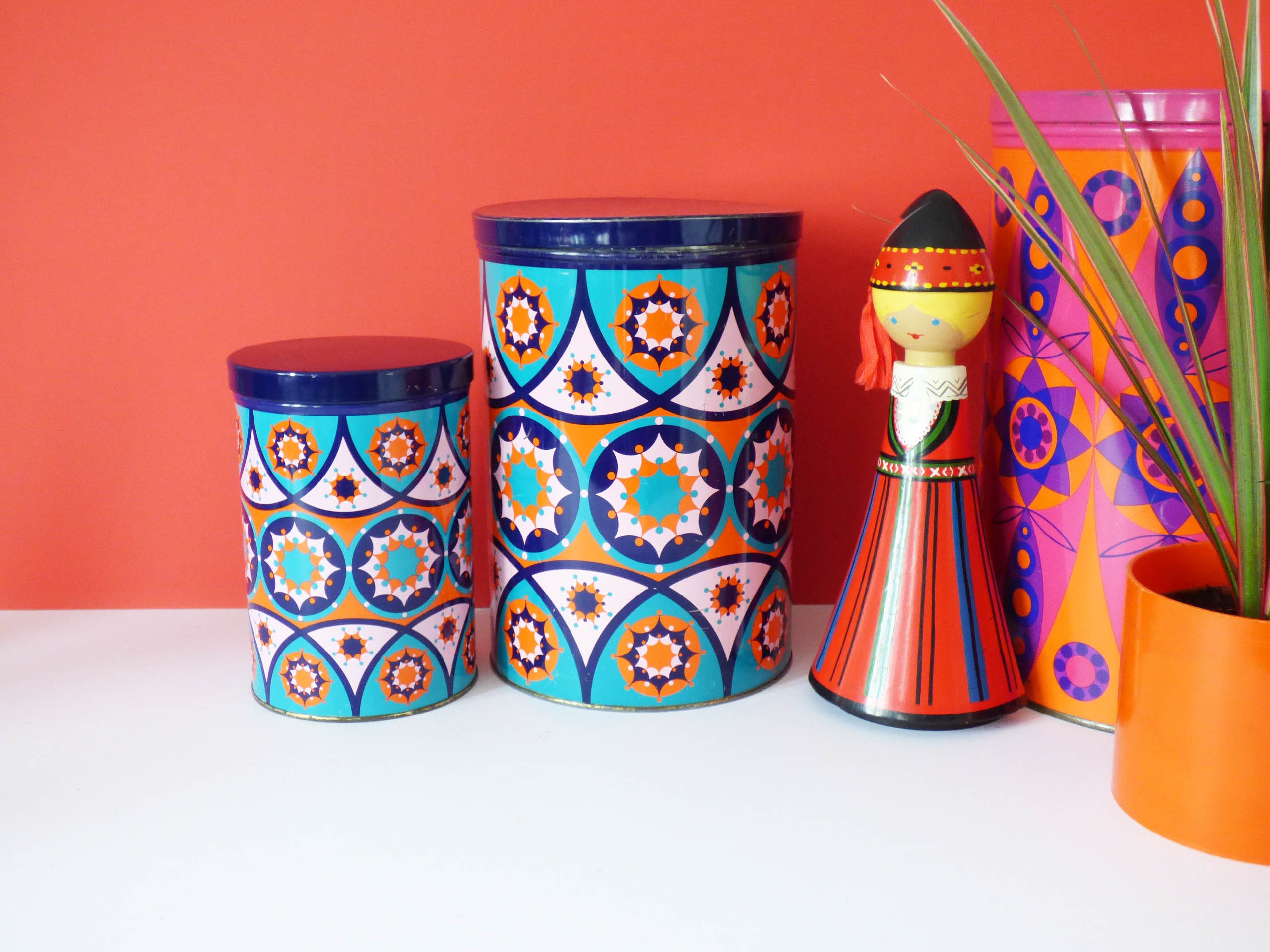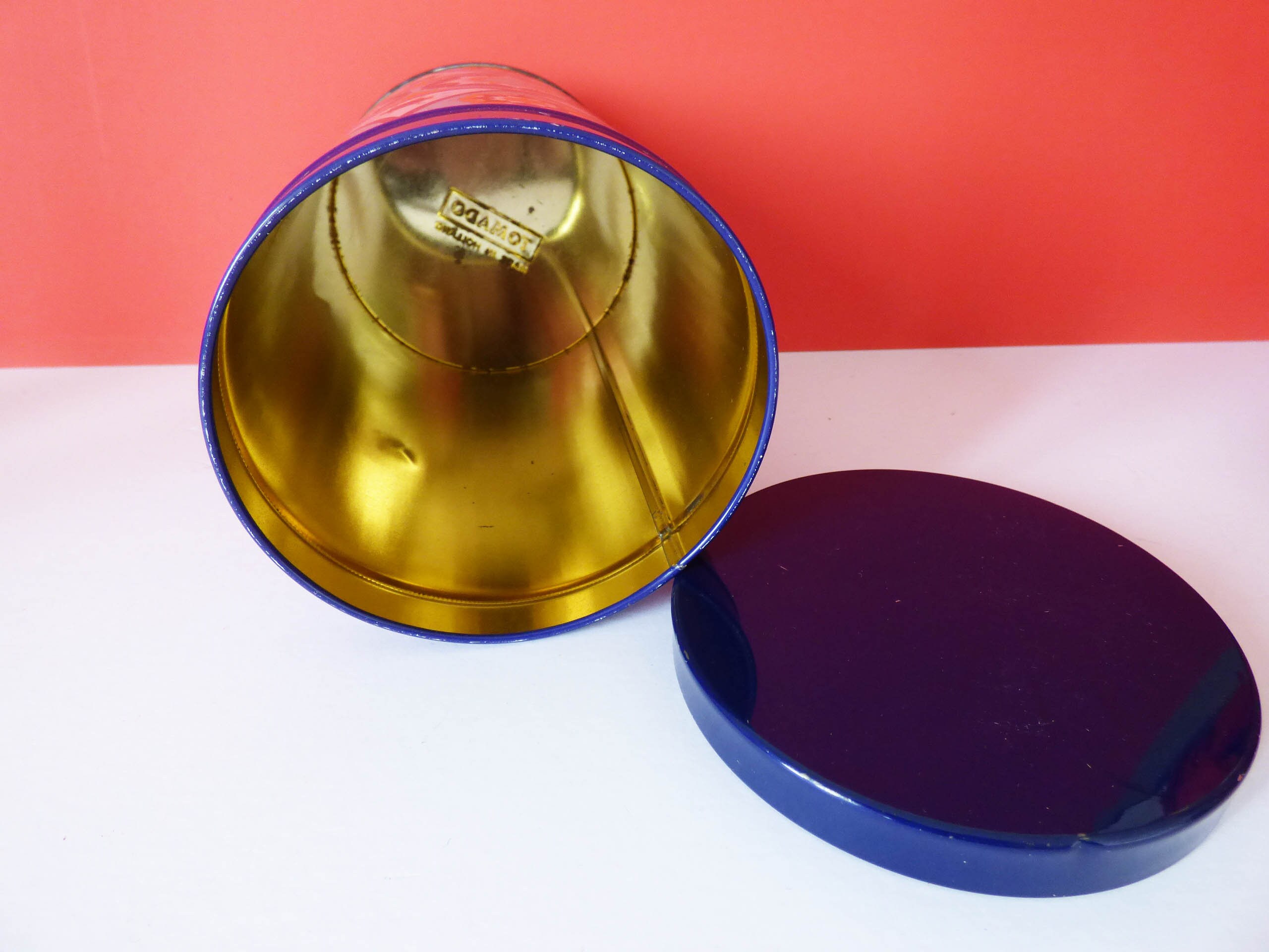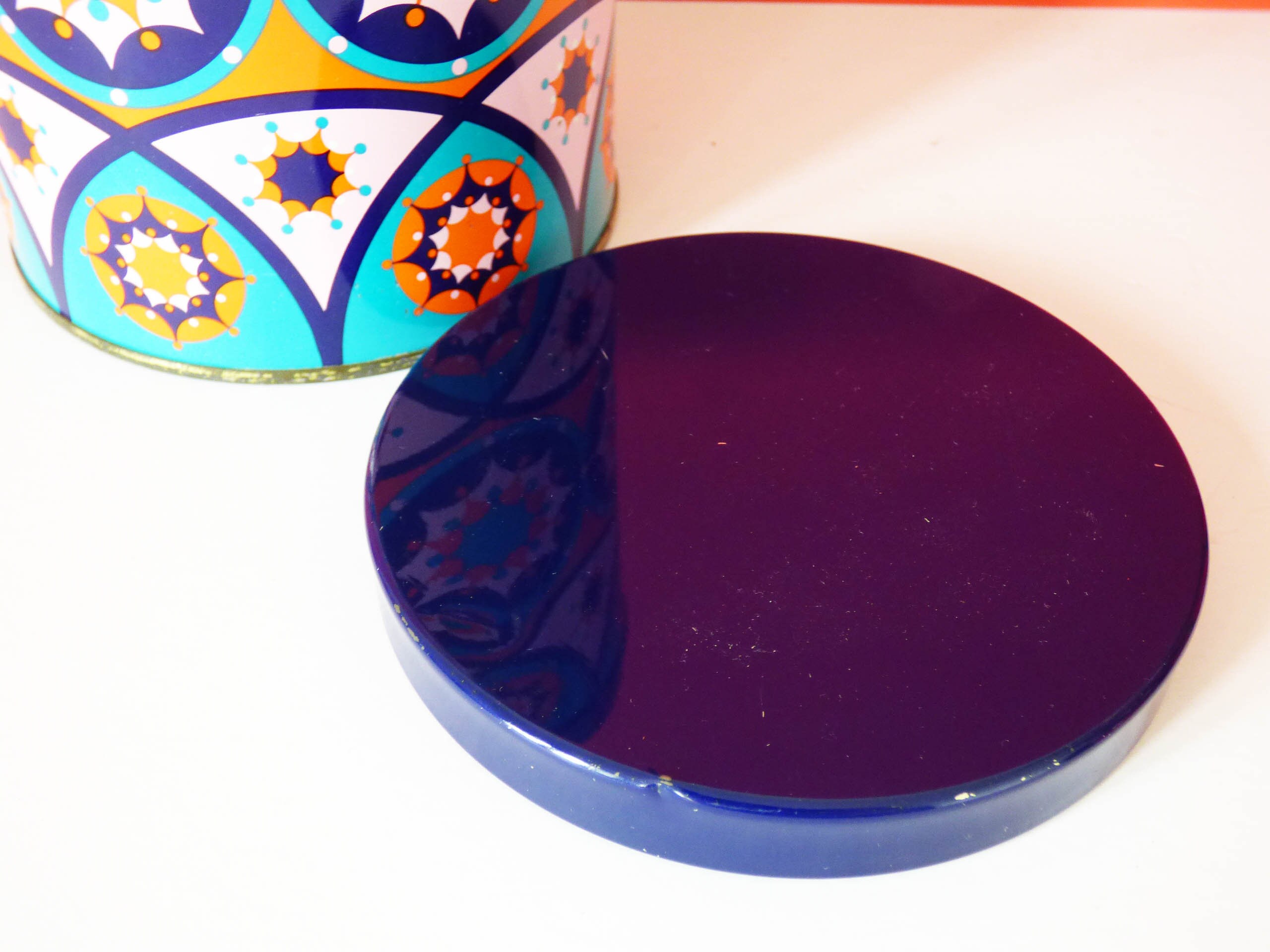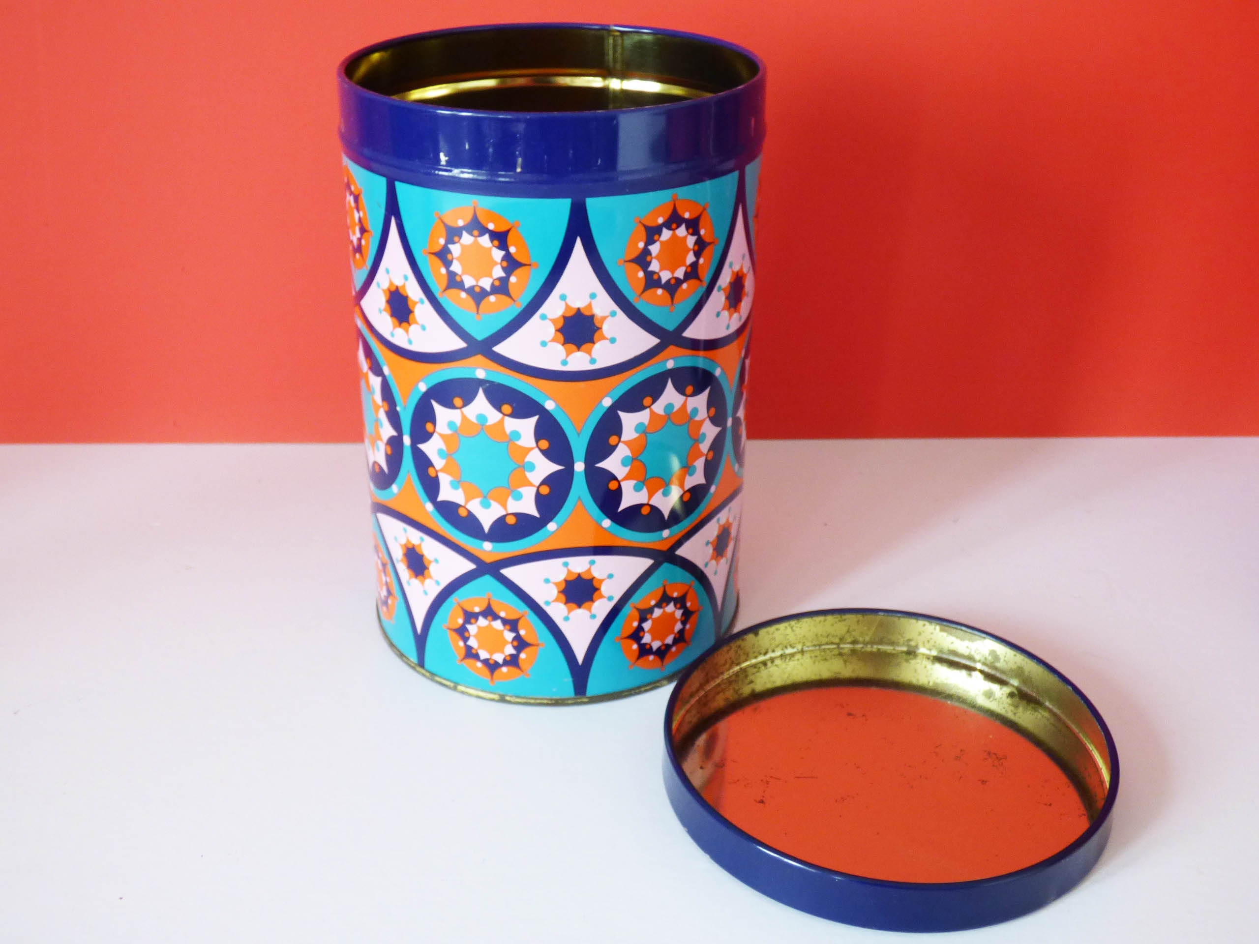 Beautiful and original 1970's Psychedelic tin, the canister is made from tin, with push down tin lids, keeping the contents fresh and secure. A Great tin with a wonderful swirly psychedelic pattern, perfect for your favourite tea, biscuits or craft supplies, created in Holland by Tomado.
