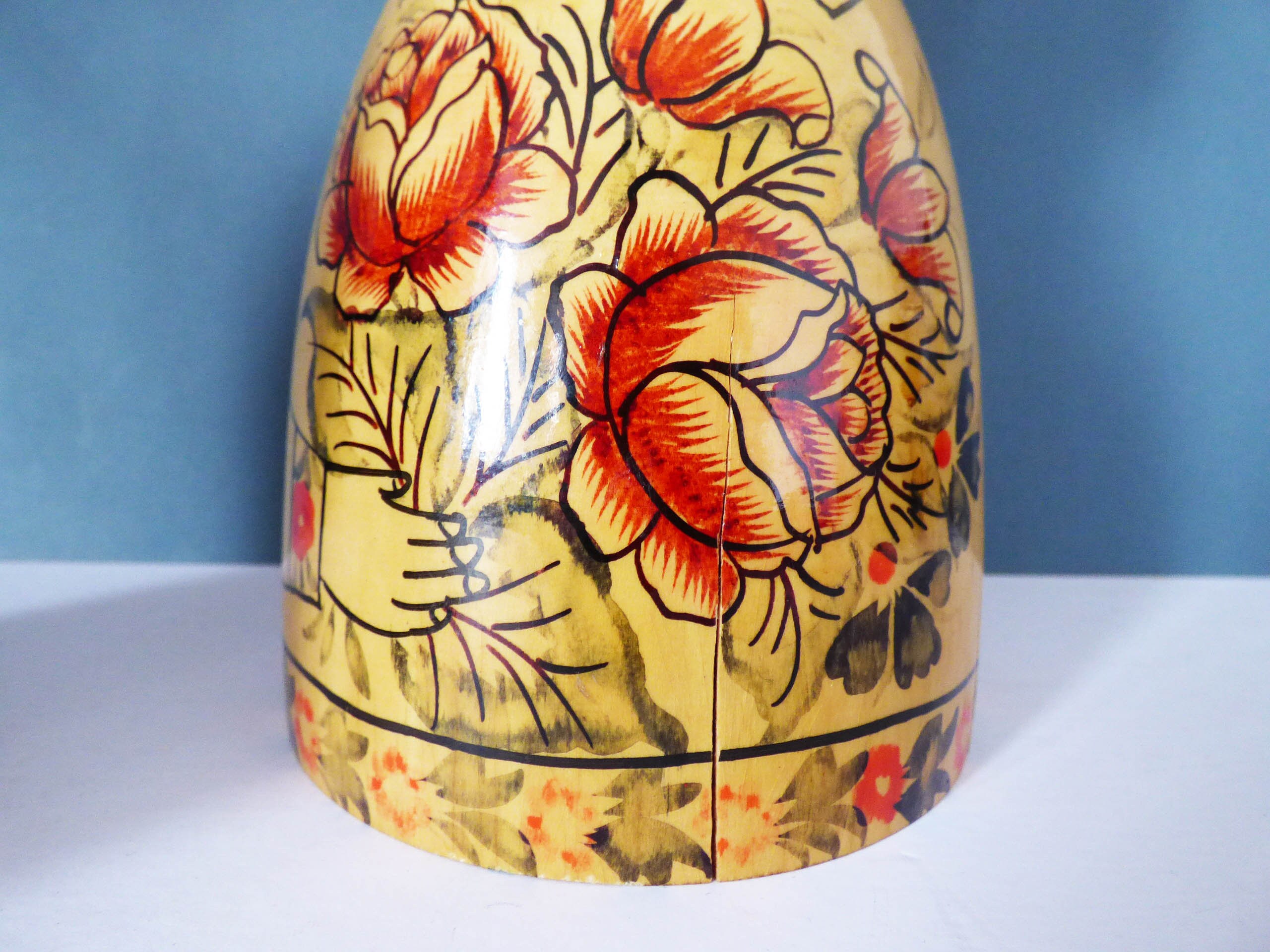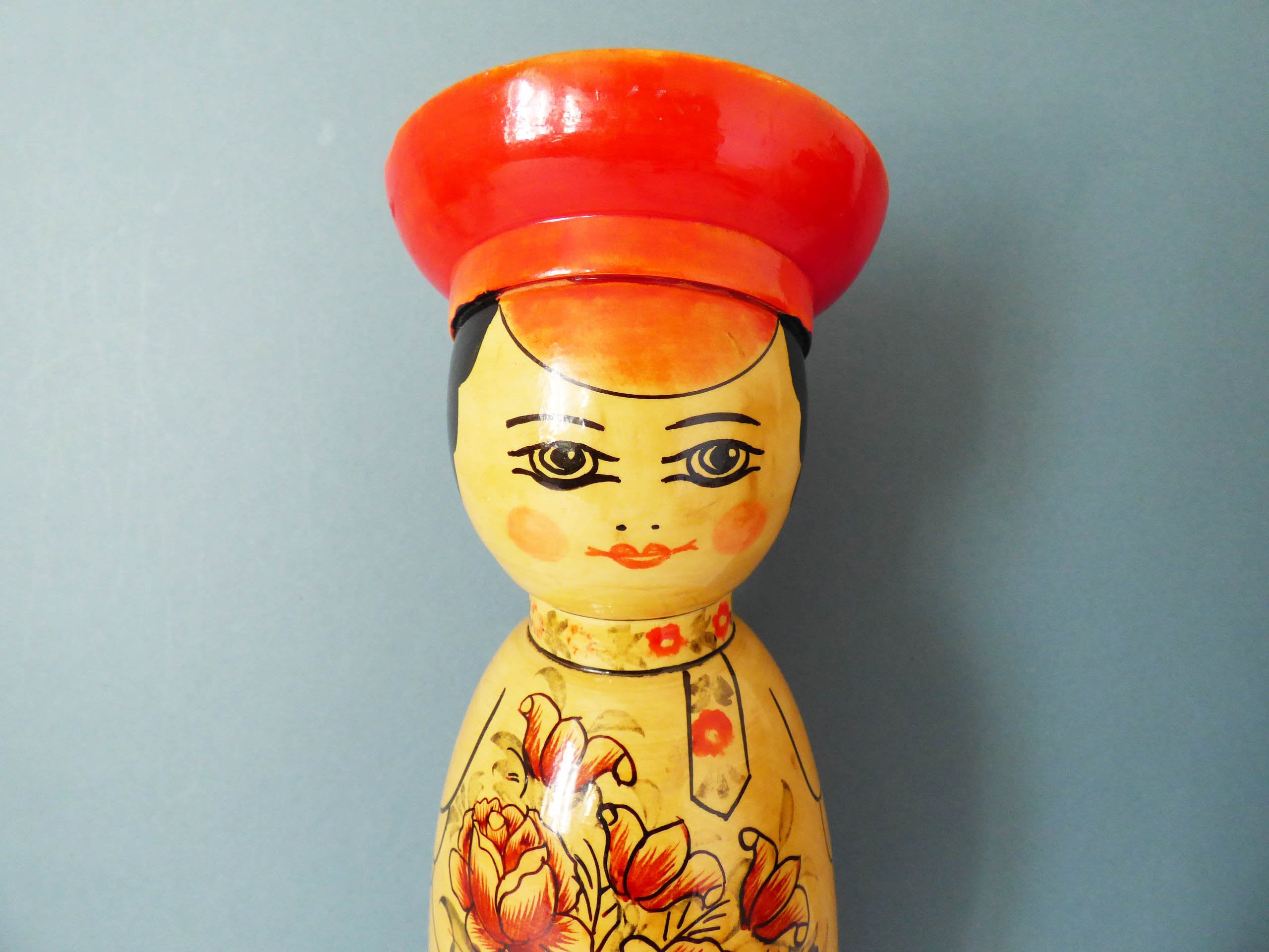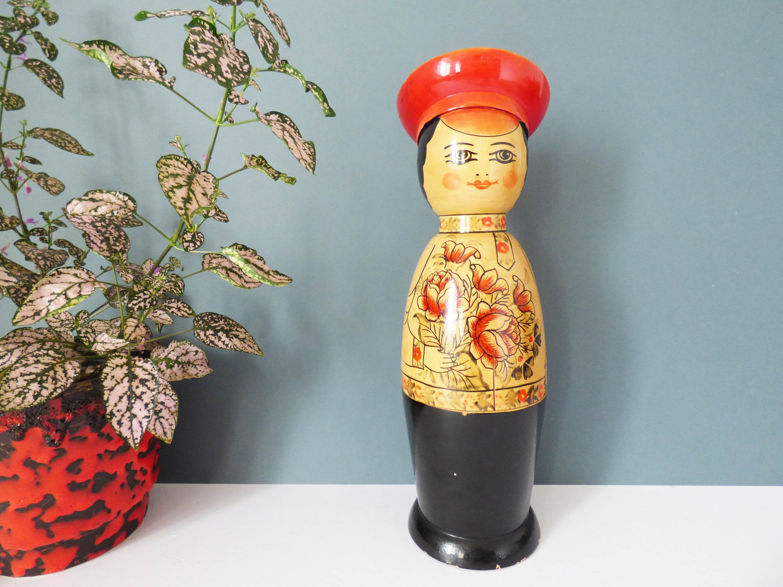 A wonderful very large vintage Matryoshka Doll from Russia, this doll was actually created to hold a bottle of Russian Vodka, although I have also seen a trend towards using these to hold pencils and paintbrushes.