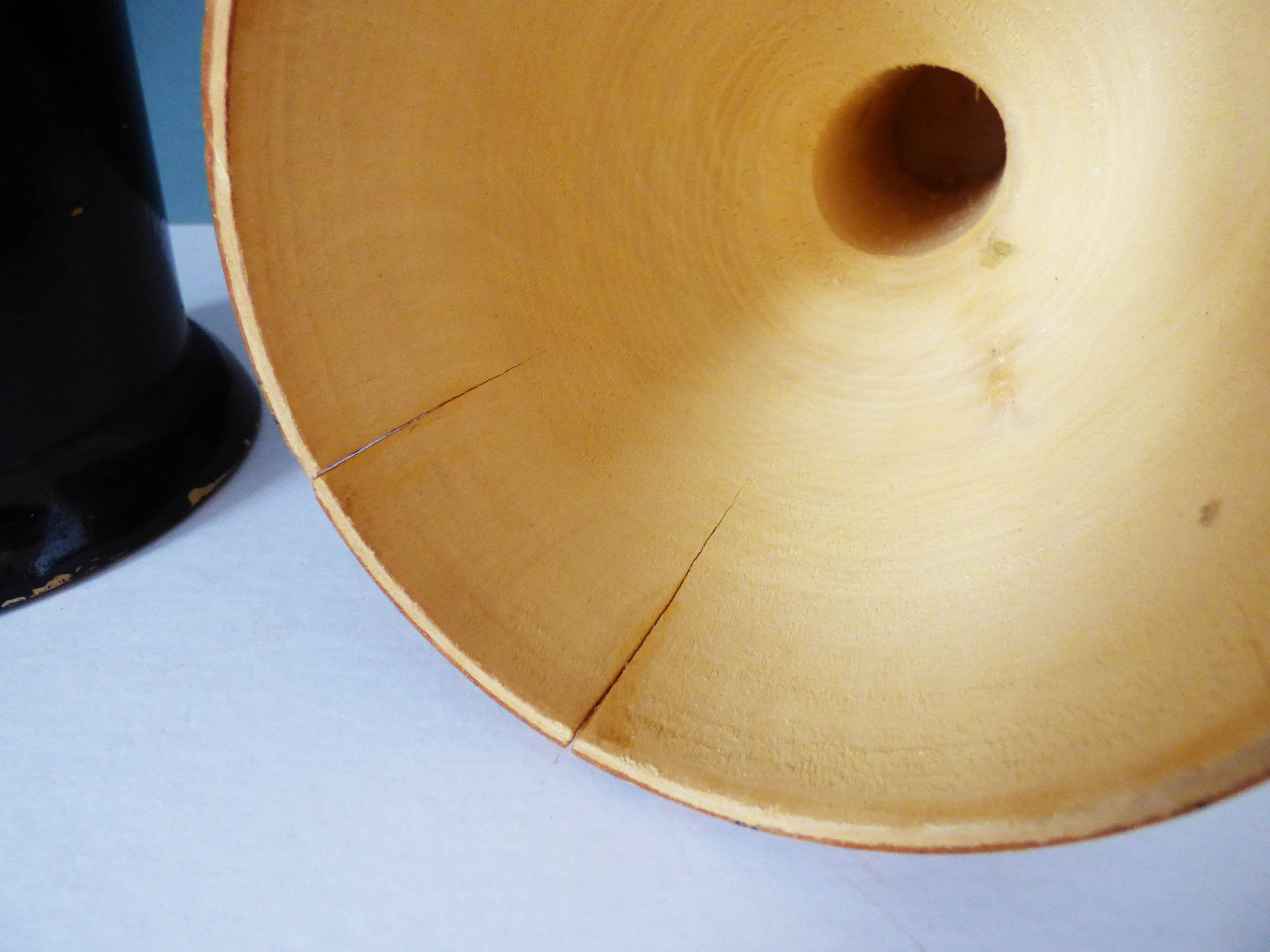 There are splits to the wood, in the top section, and 1 split to the base part although this has been repaired.