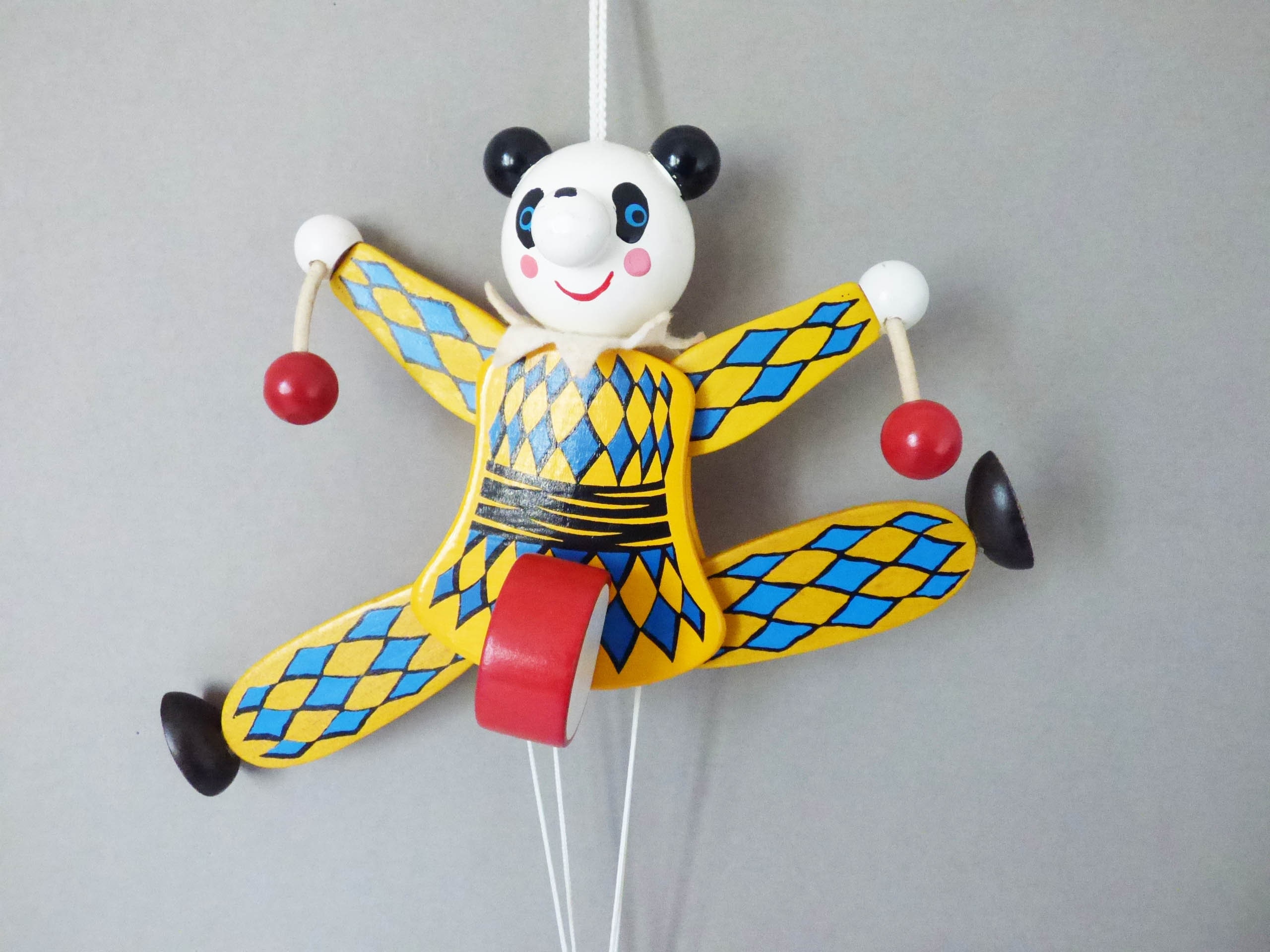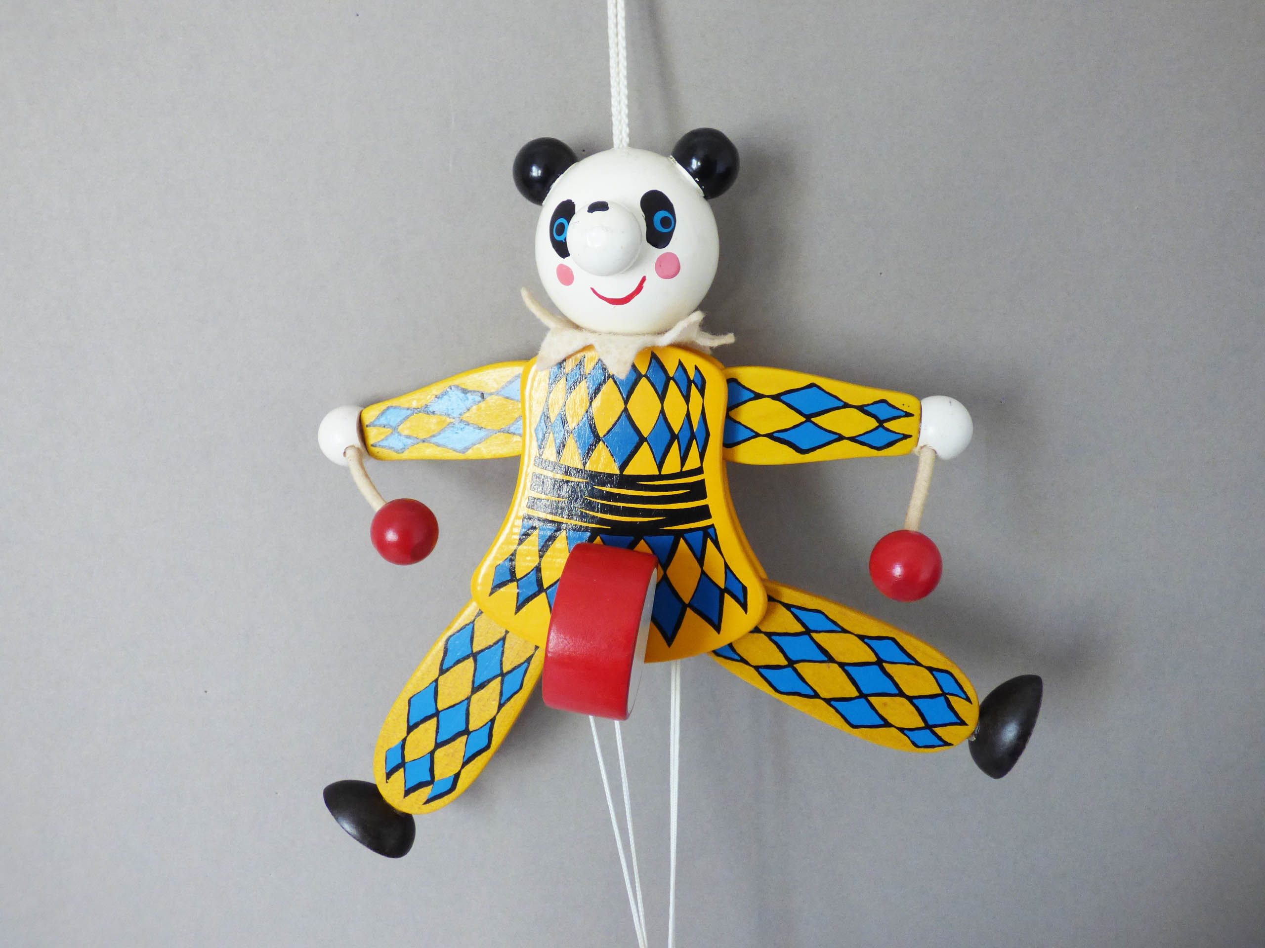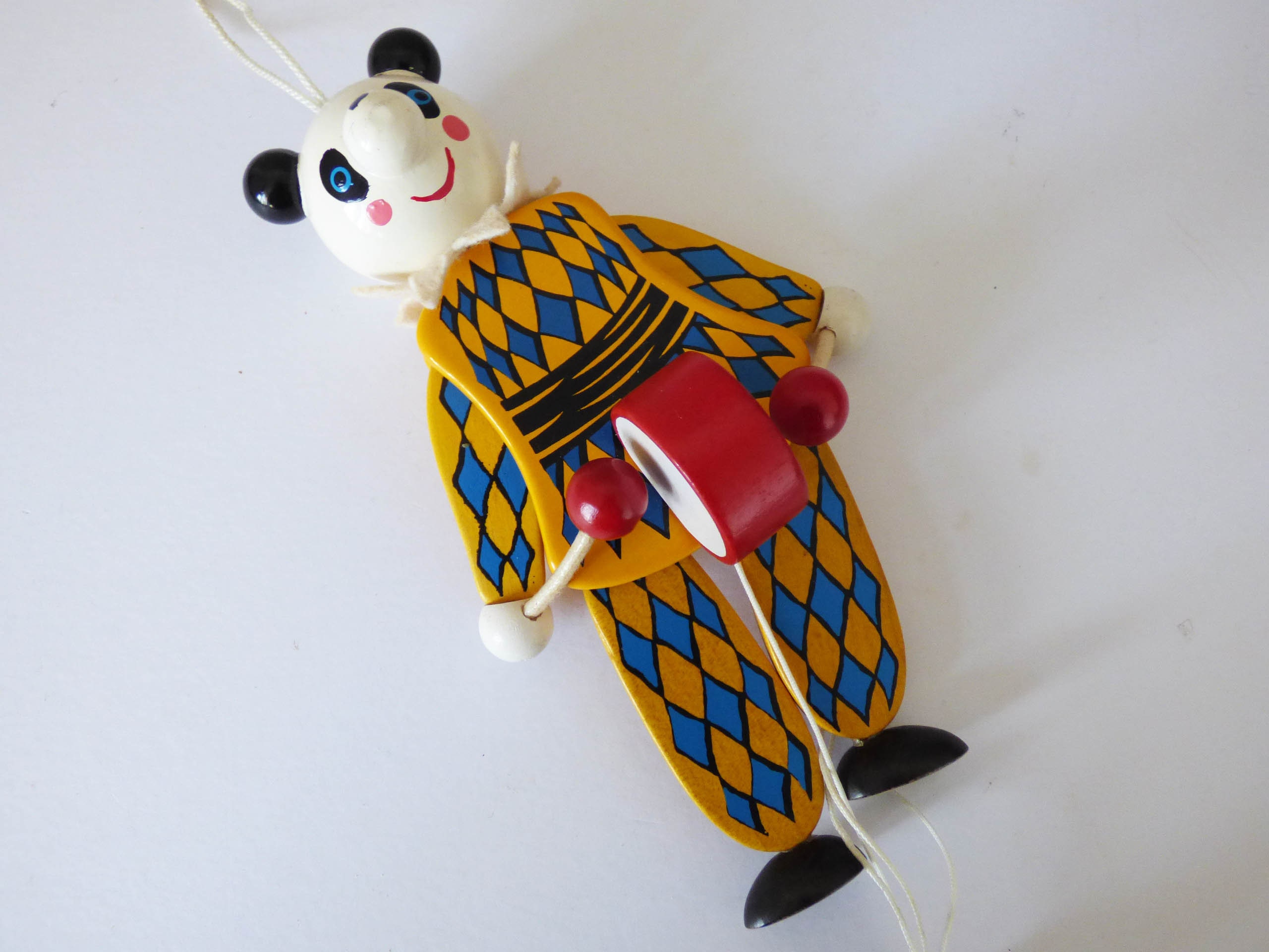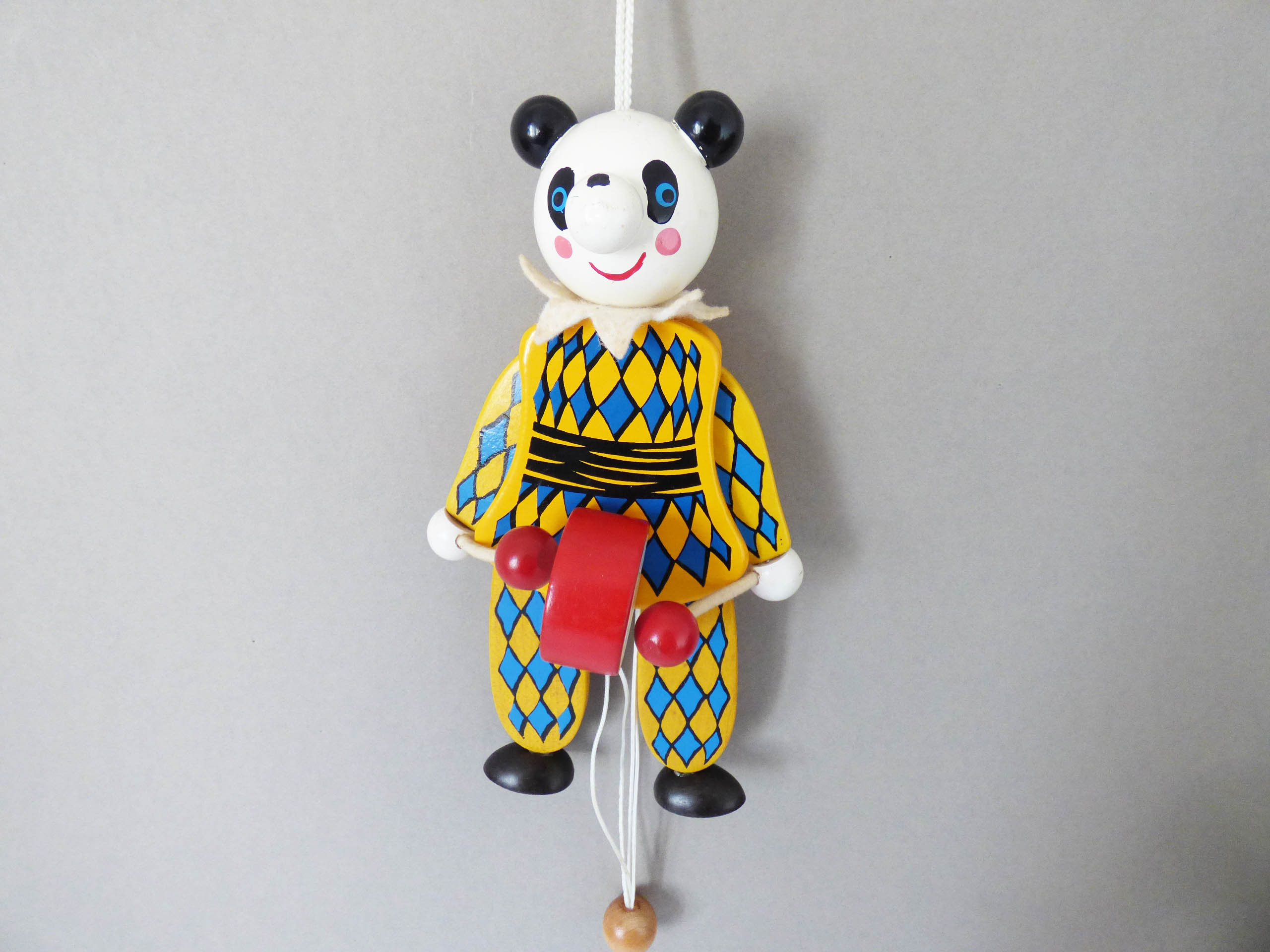 This wonderful Panda moves when you pull the spring, created completely from wood, his facial features have been skillfully handpainted, when you pull the strings, his arms lift and he hits his drum. He also has a little felt collar, to match his painted harlequin costume.