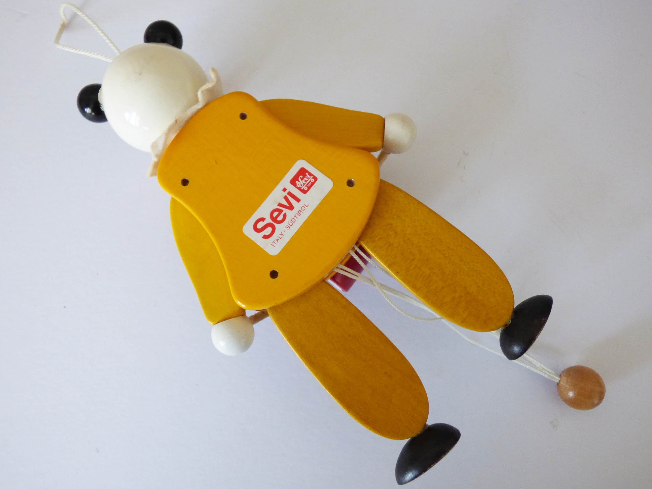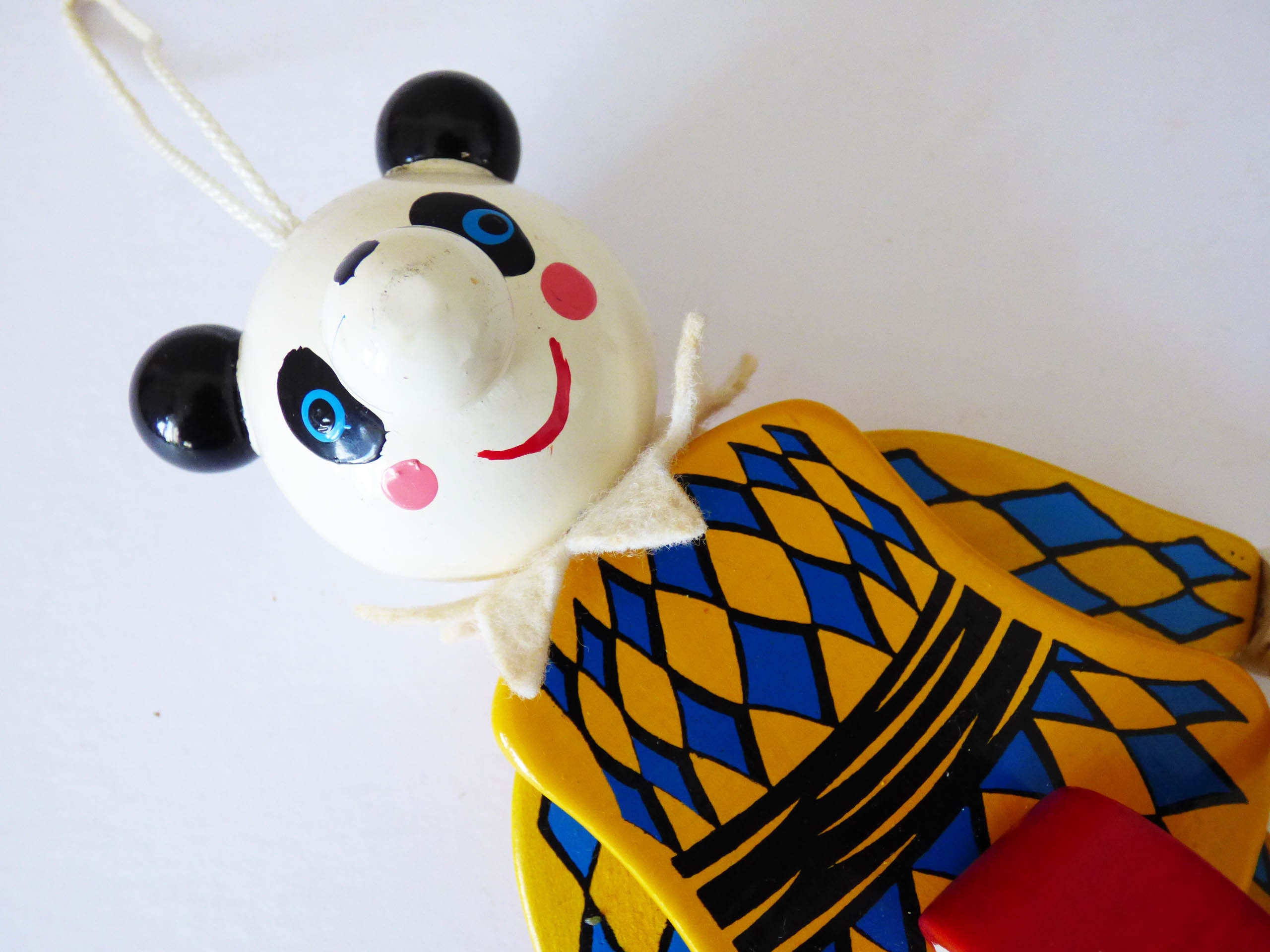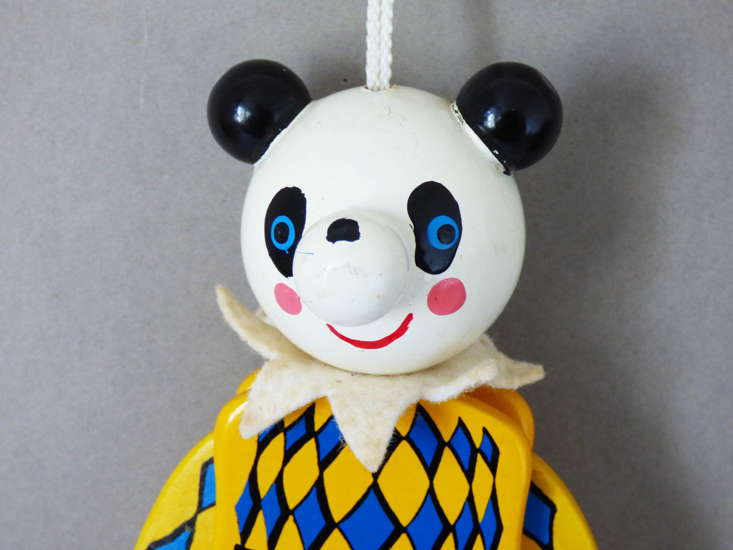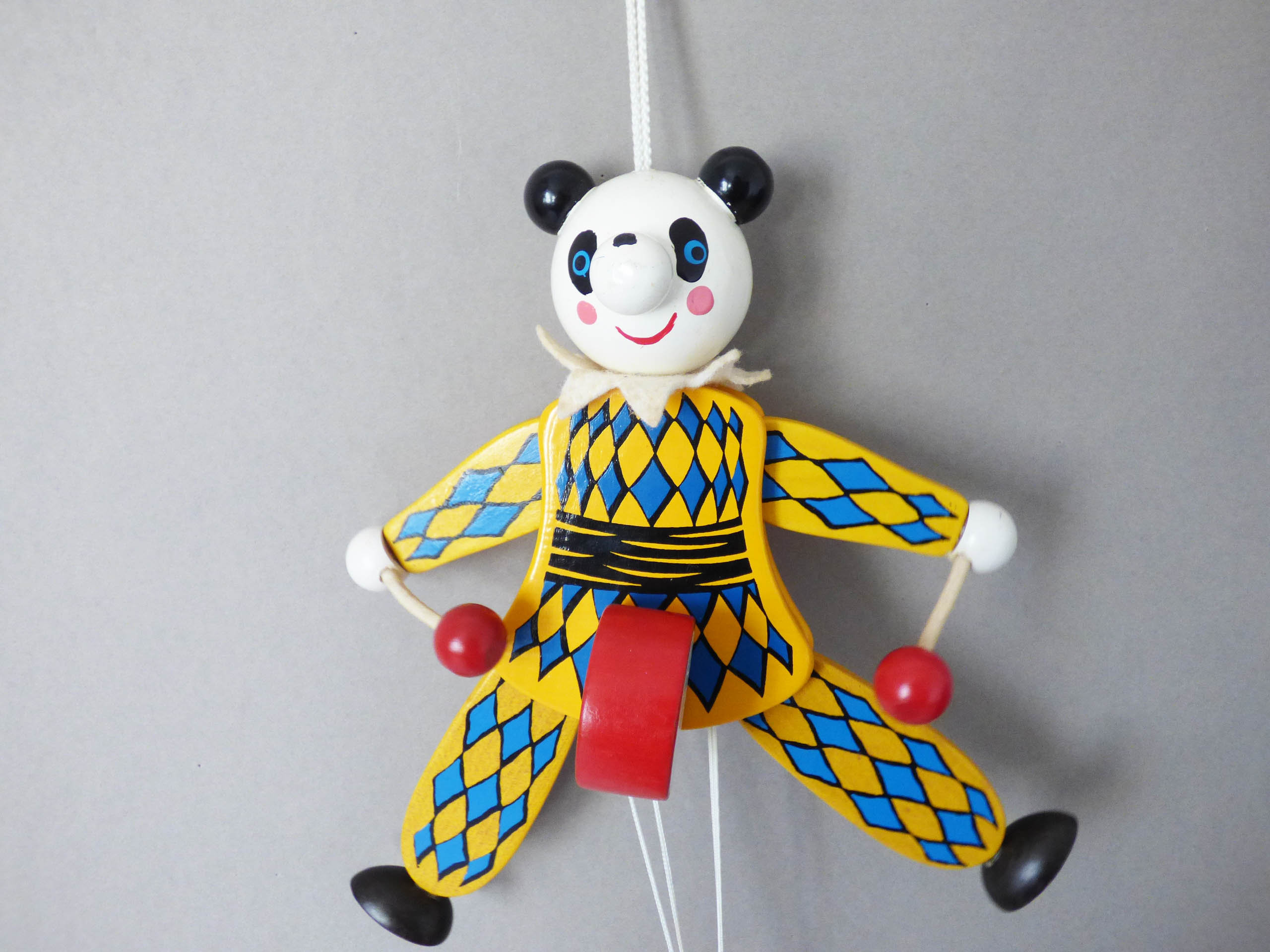 This wonderful Panda moves when you pull the spring, created completely from wood, his facial features have been skillfully handpainted, when you pull the strings, his arms lift and he hits his drum. He also has a little felt collar, to match his painted harlequin costume.
