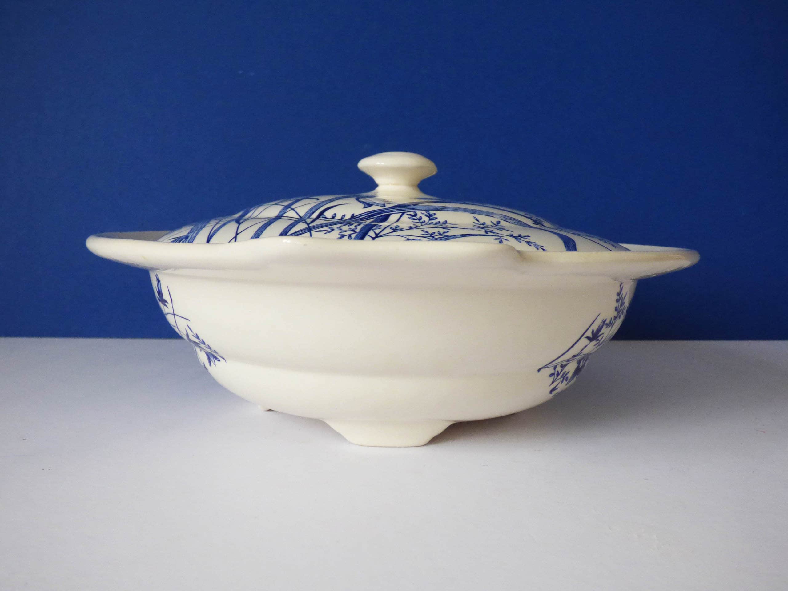 A wonderful serving dish created by English Ironstone tableware of Staffordshire England. The dish has a lovely printed transfer design of Bluebells to the outside (back and front) and also the lid. This wonderful dish is perfect for serving food at the table, such as vegetables and side dishes. The dish is in great condition, it's worth bearing in mind that Ironstone, created ceramics for the everyday folk, so although this piece is lovely, the quality is at a more basic level, the lid doesn't fit tight. However as when this dish was created, the price reflects the craftmanship, and the bluebell design really is quite lovely.