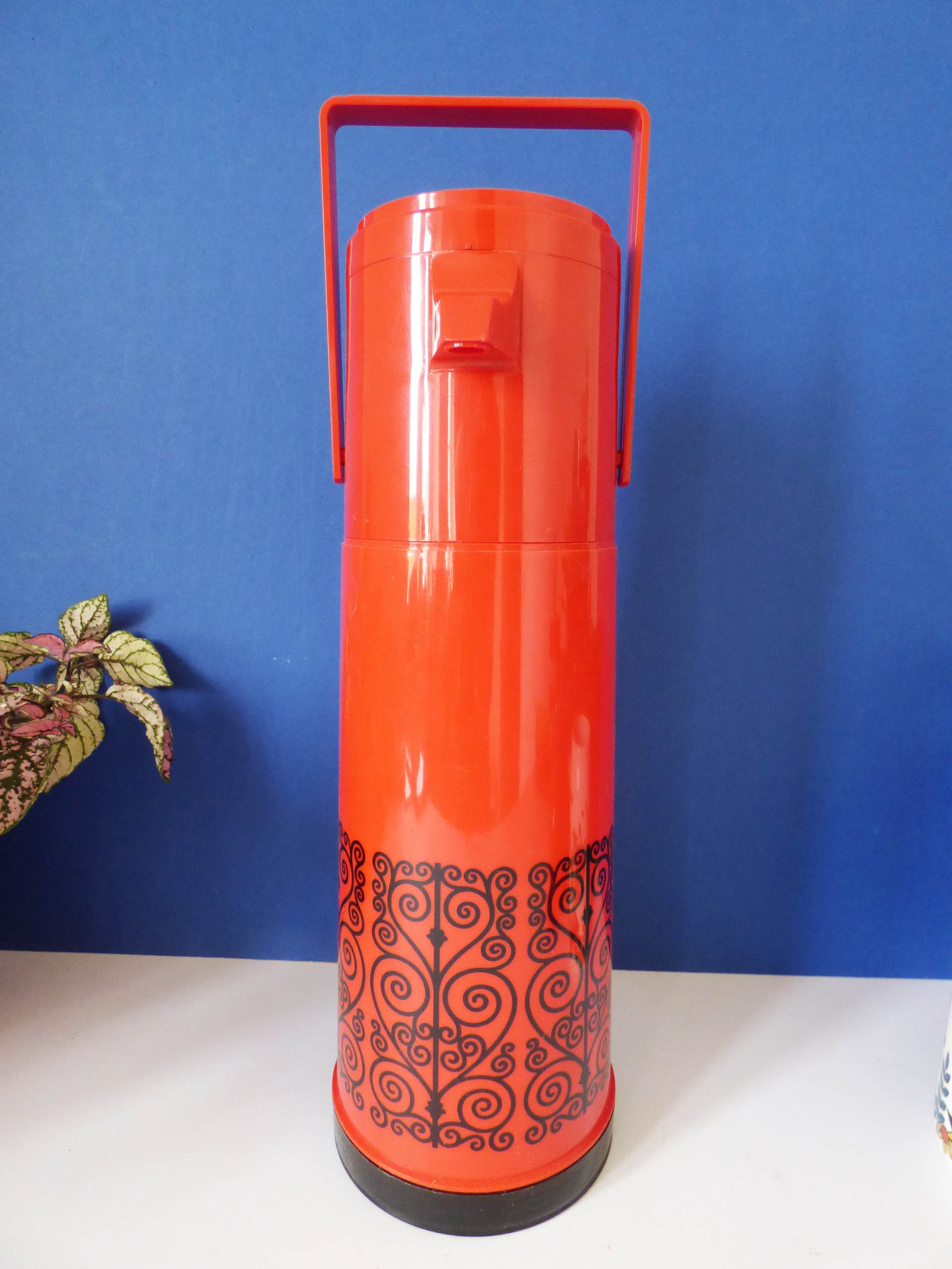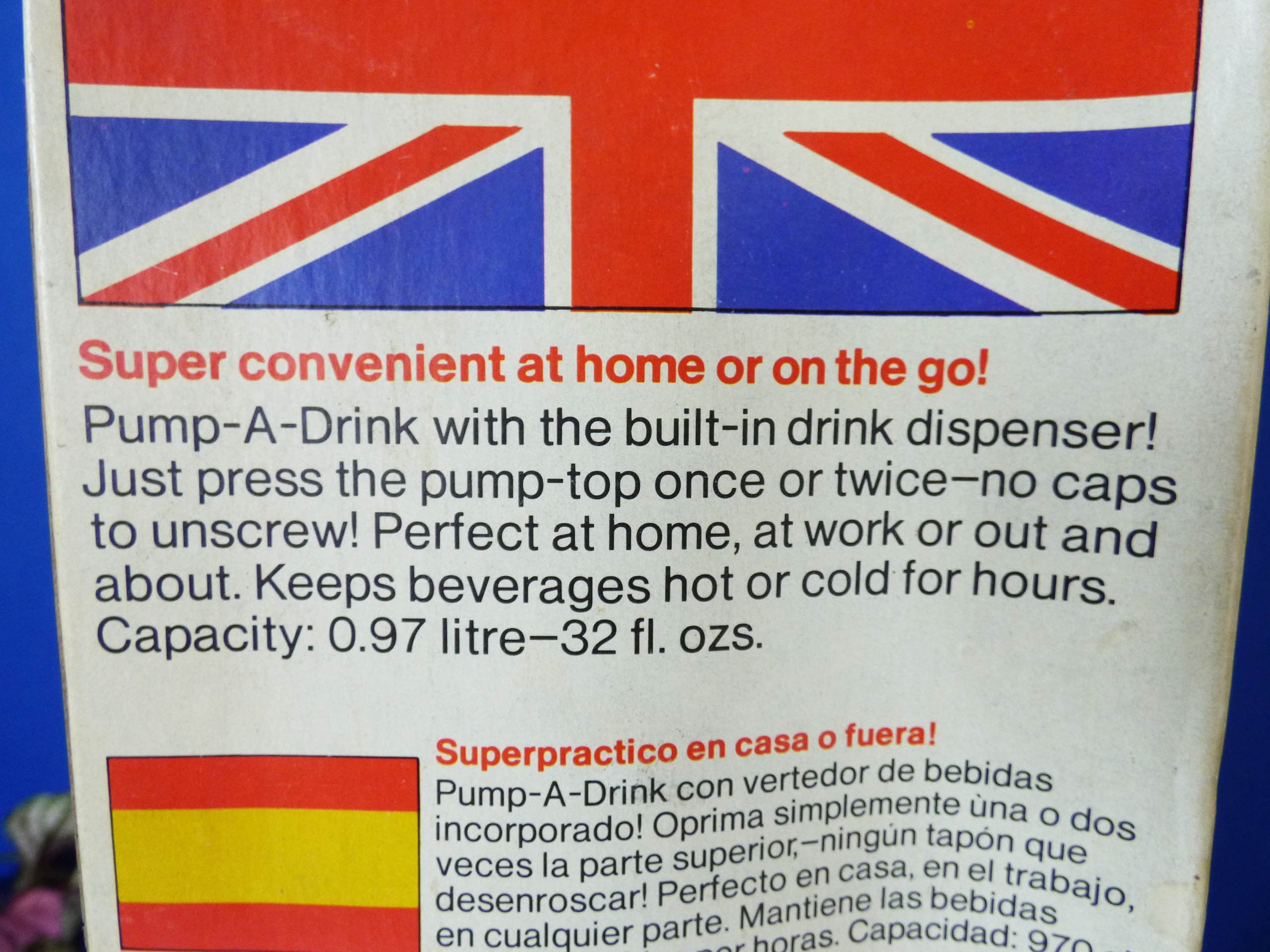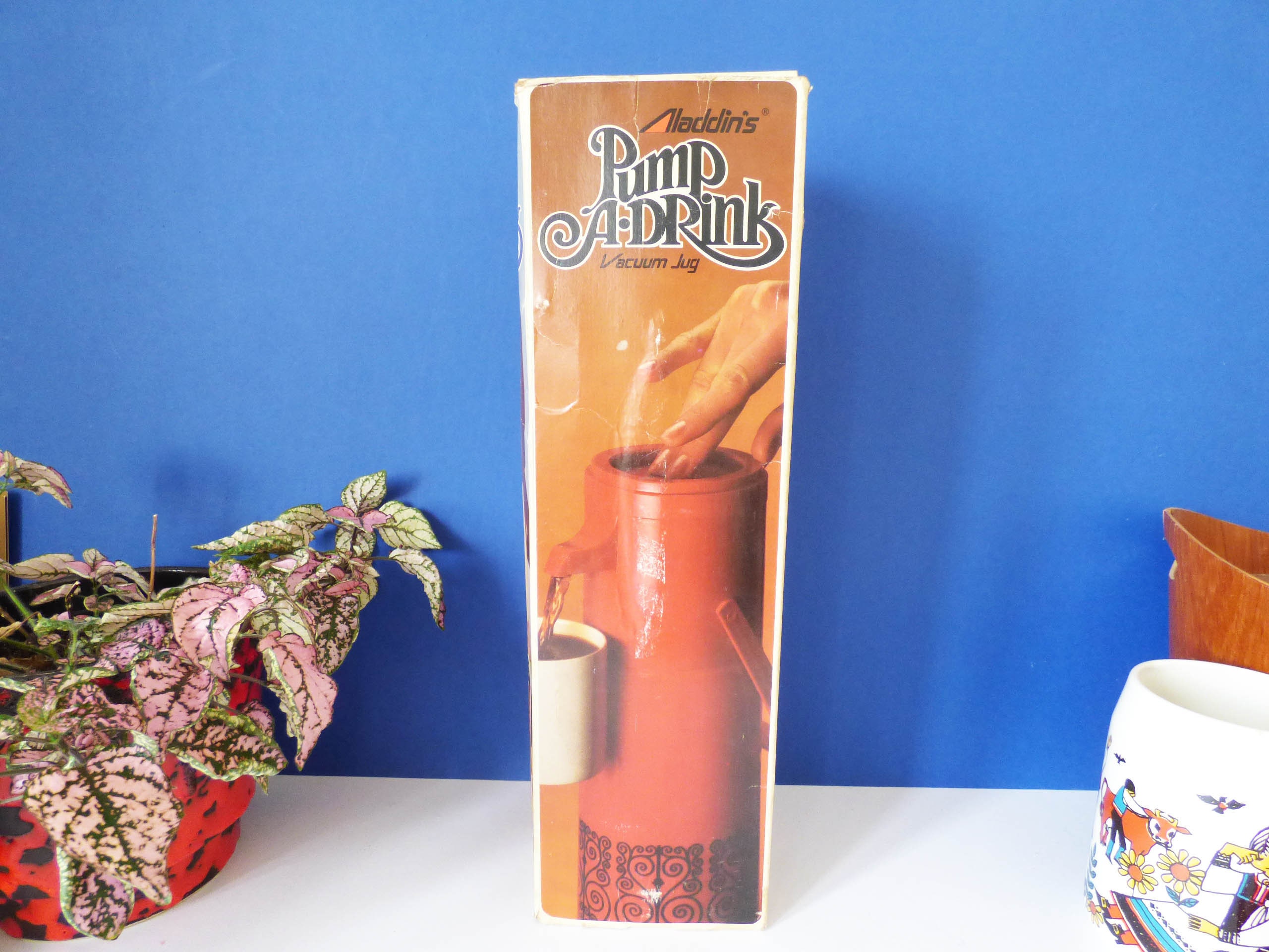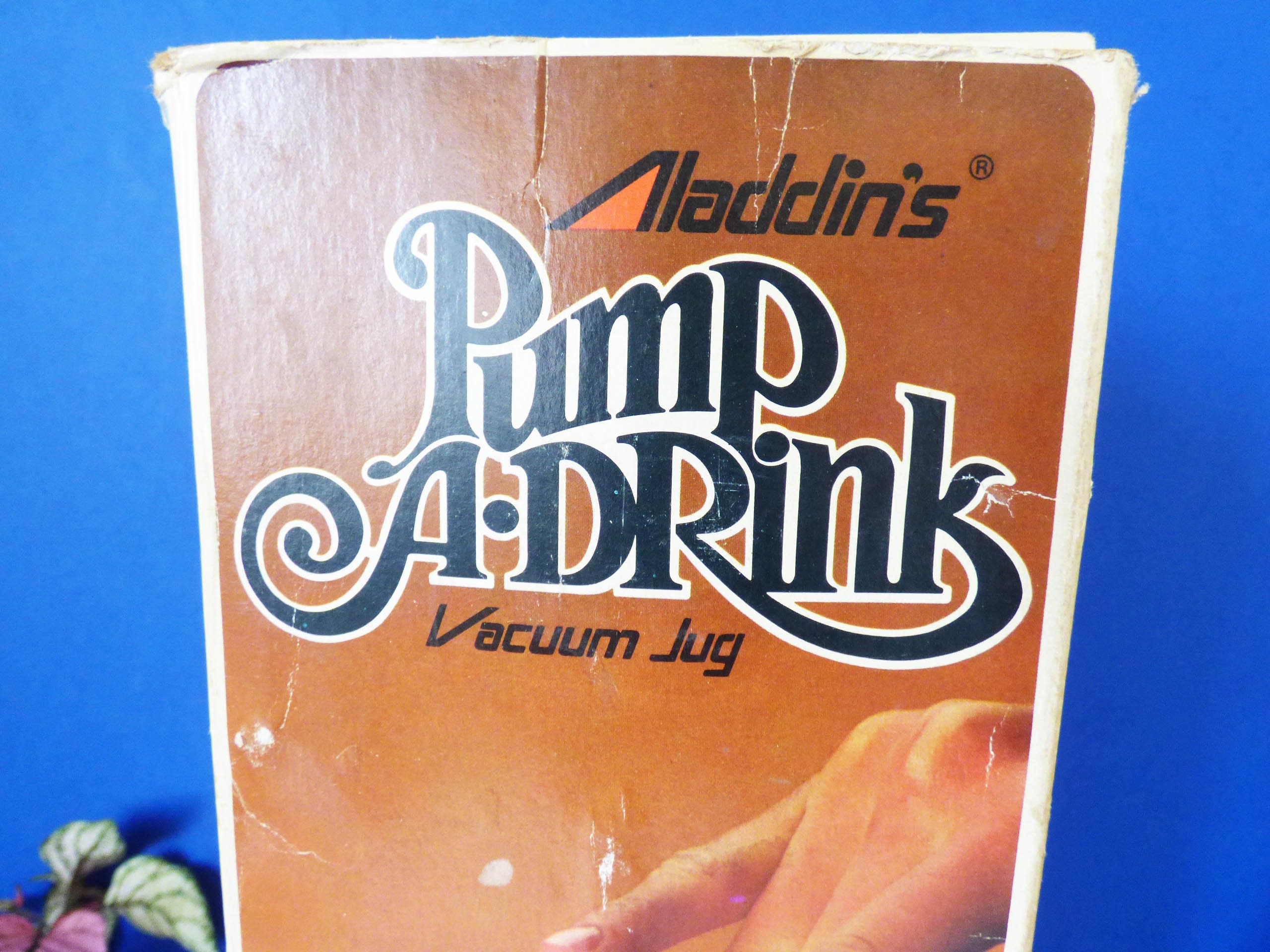 Amazing "Pump a Drink" vintage flask still in its original box, created by Aladdin Industries, and in fantastic condition, you can see it has never been used. As the box states... The Pump a drink .. Super Convenient at home or on the go! Pump -a -drink with the built-in dispenser. Just press the pump once or twice no caps to unscrew! Perfect for at home, at work or out and about. Keeps beverages hot and cold for hours. Capacity 0.97 litres-32 fl ozs.