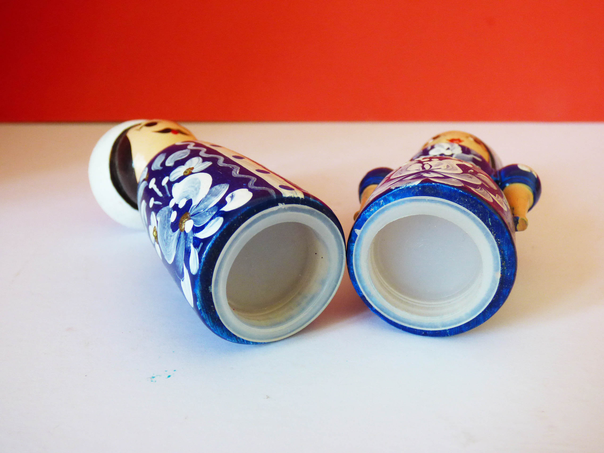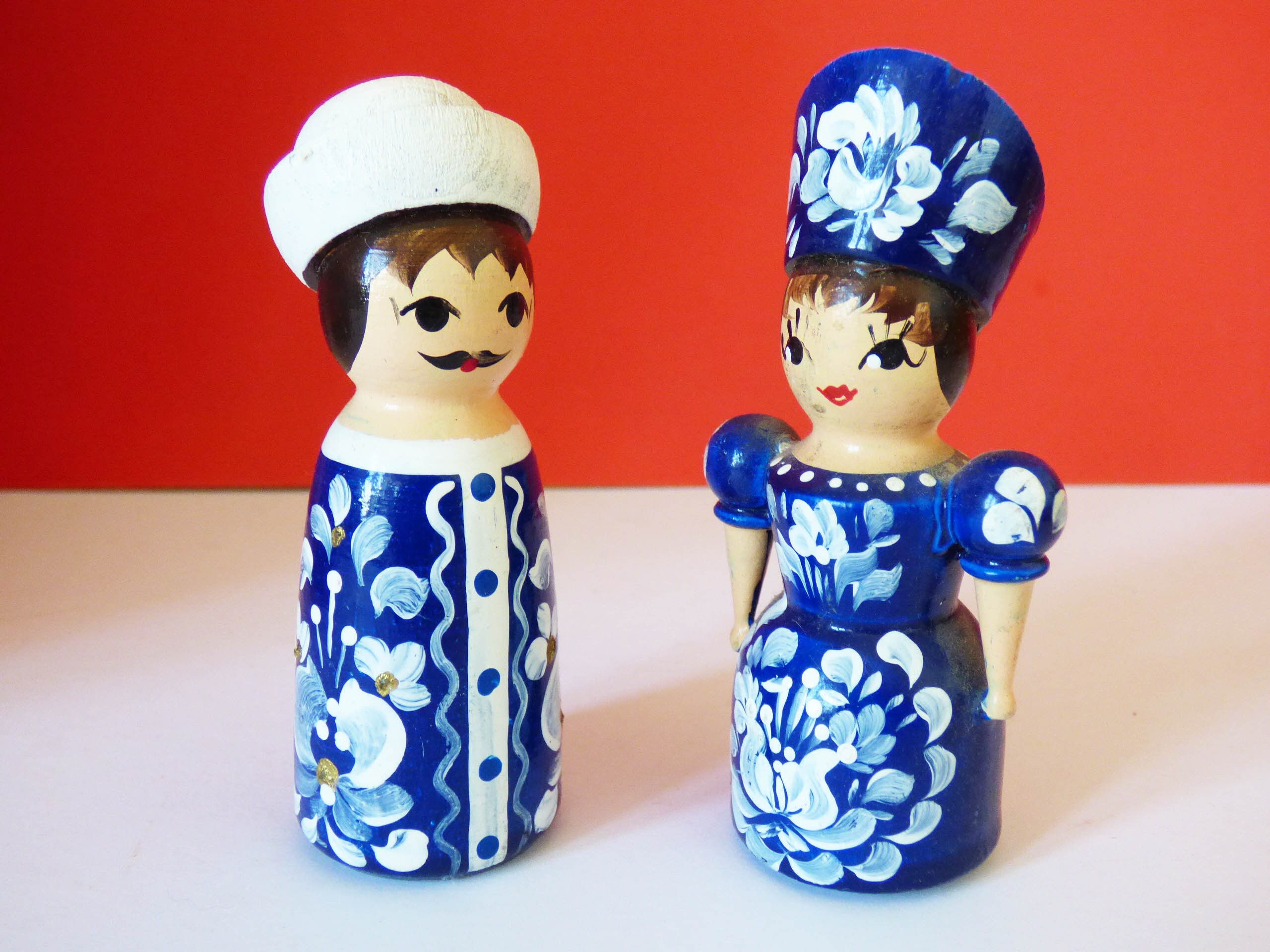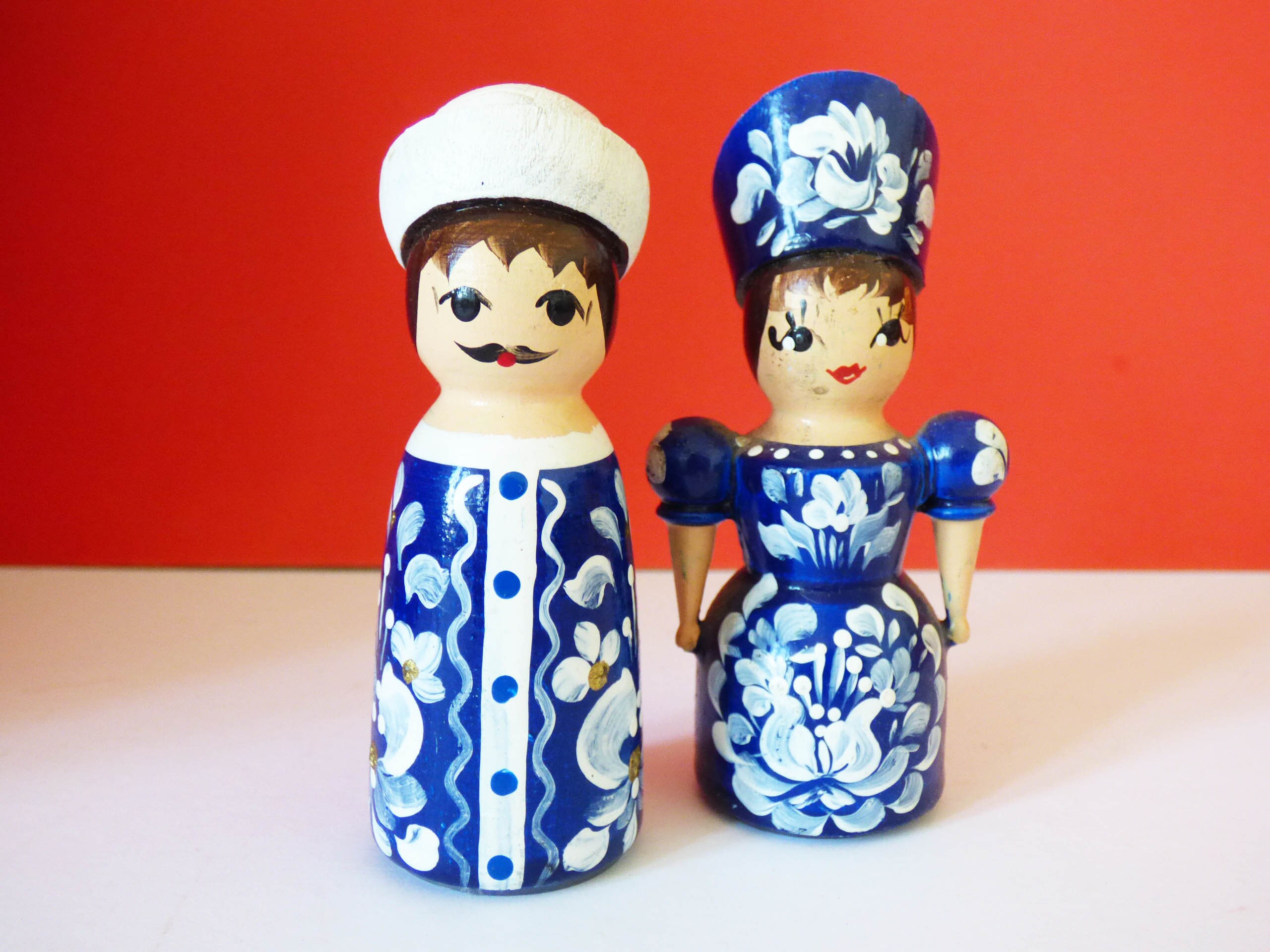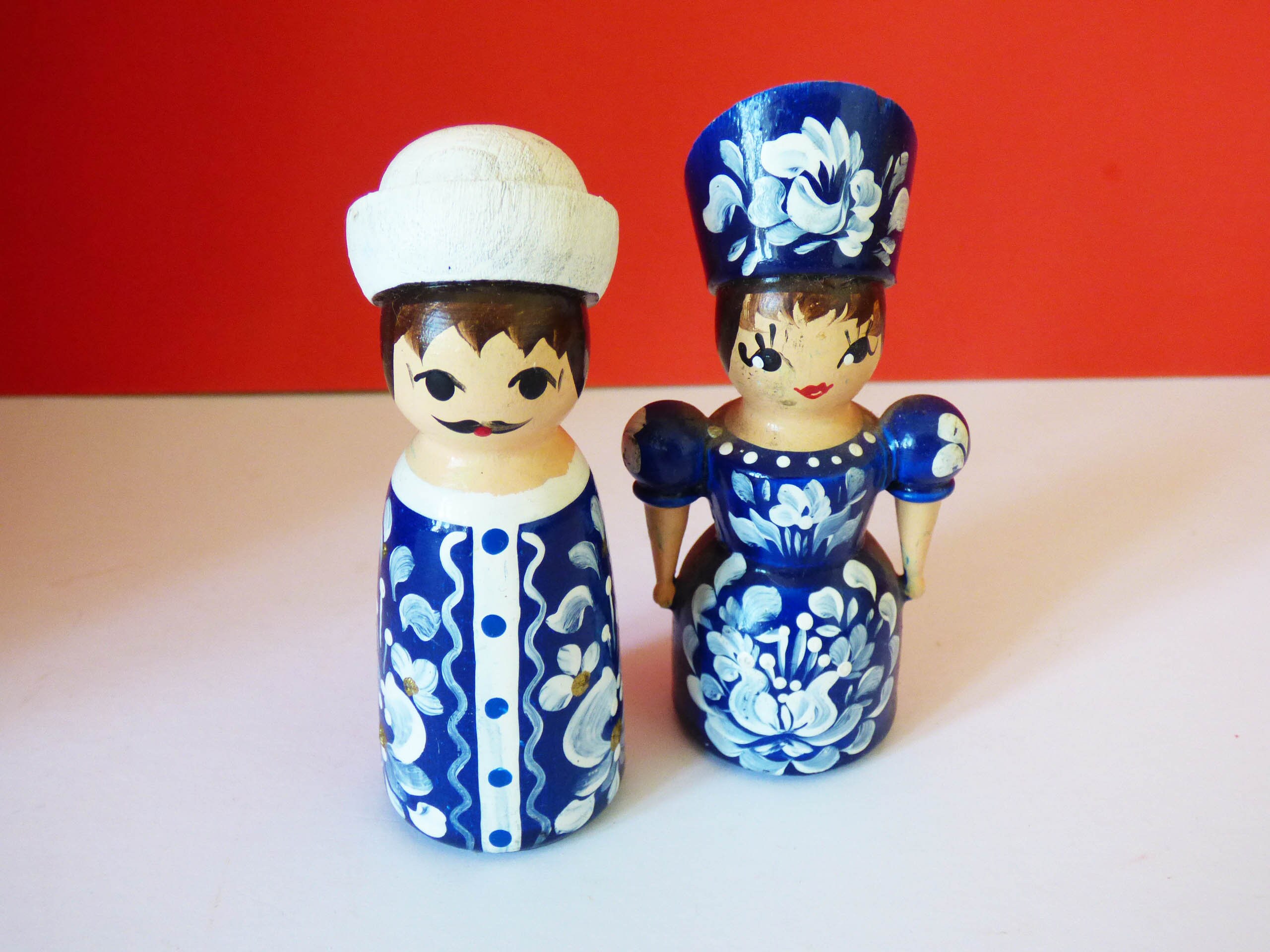 I love these little folk art wooden salt and pepper shakers, I'm not entirely sure where they originate from, probably Eastern European, but with a worldwide love of folk art, its possible they could be Mexican or even Japanese... Each one is hand-painted, in blue and white traditional costume, with simple plastic bungs in the bases to fill.